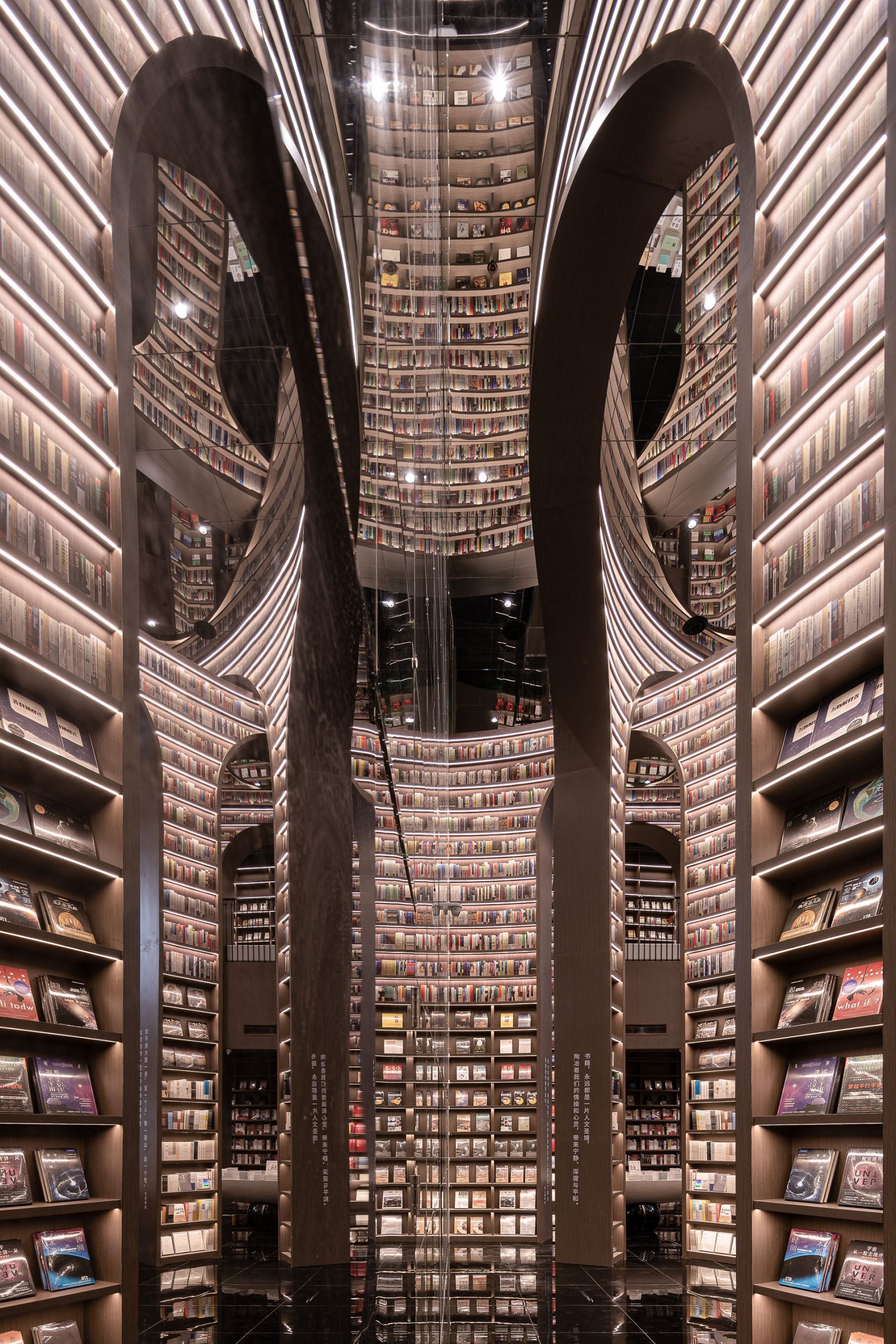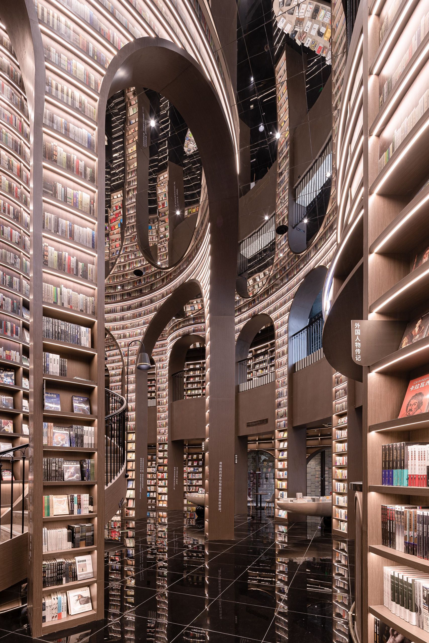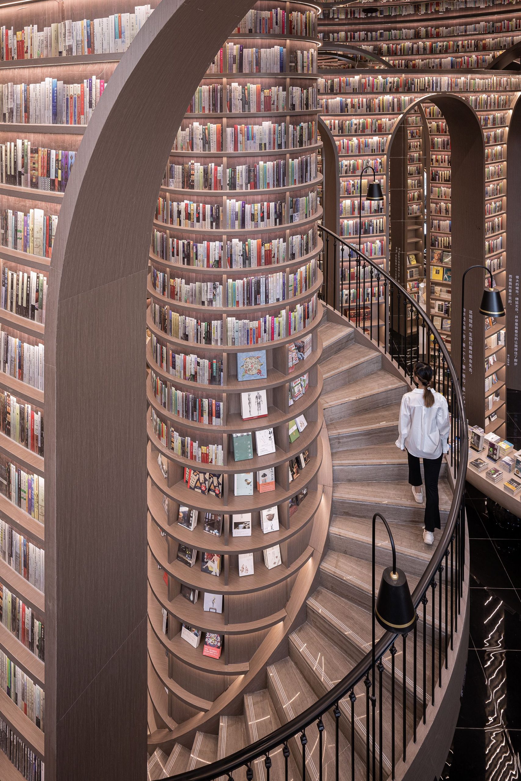 When you go up the stairs, the bookshelves beside you offer a variety of books at accessible distance. Other places where people could not reach are decorated with book pattern film, you can still feel the majestic momentum of the space. By creating end scenery and using the technique of architecture, the designer moves the magnificent spirit of mountains and rivers into the indoor space, presents readers with elegant and powerful artistic landscape, and also expresses the awe to nature.