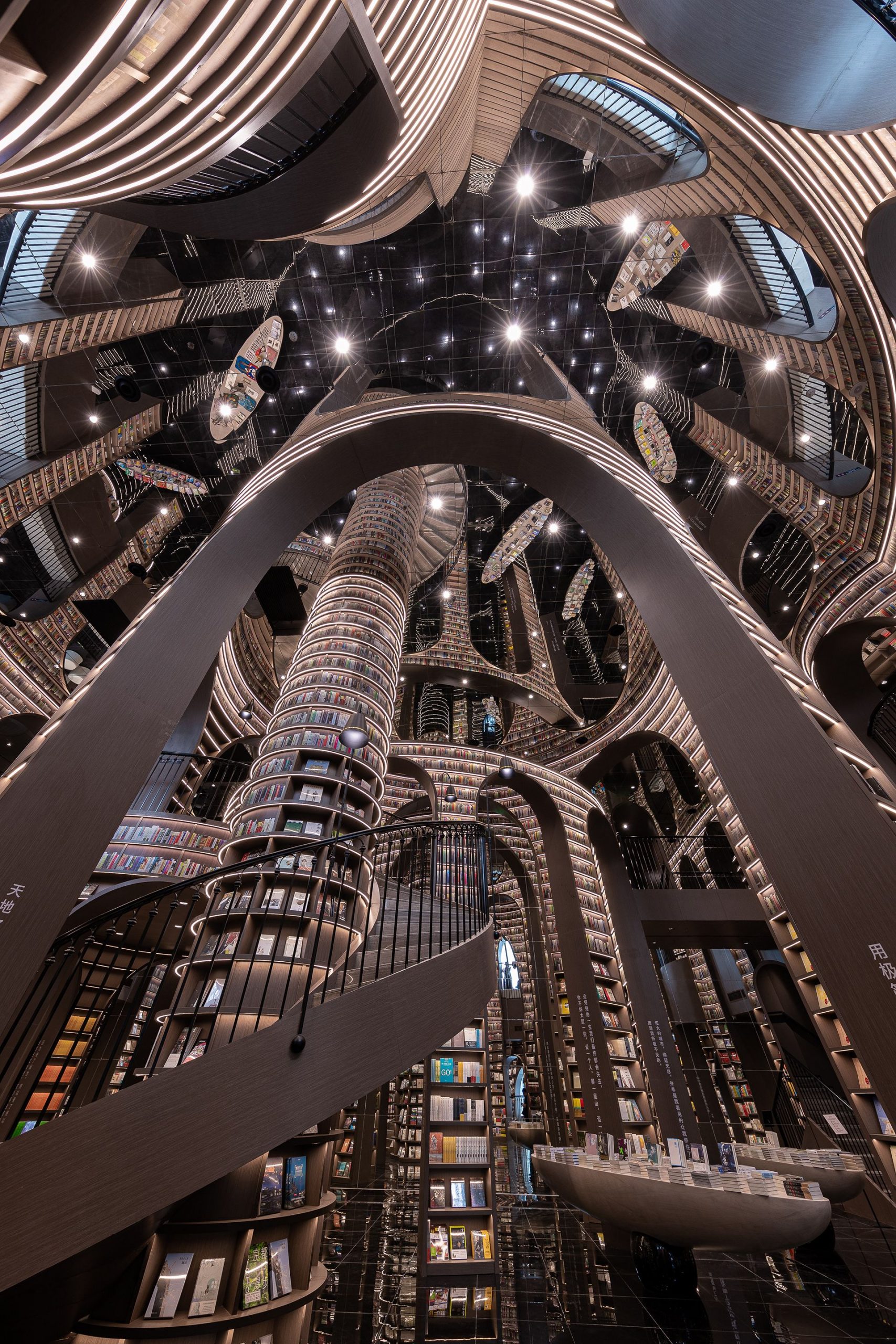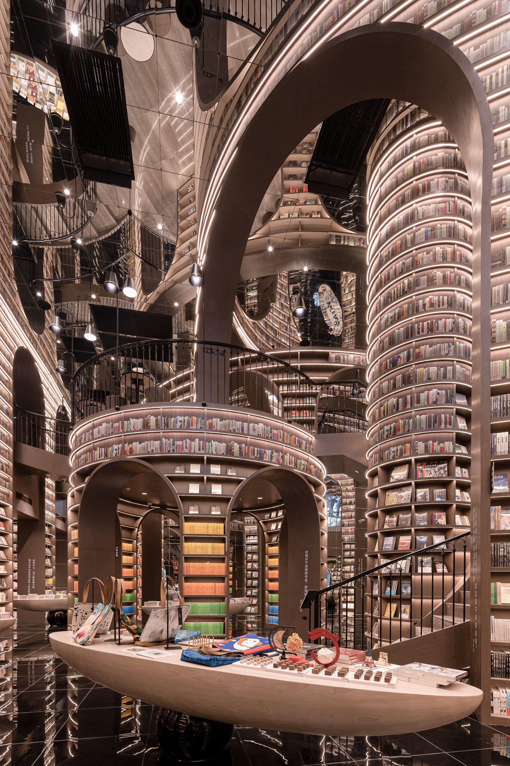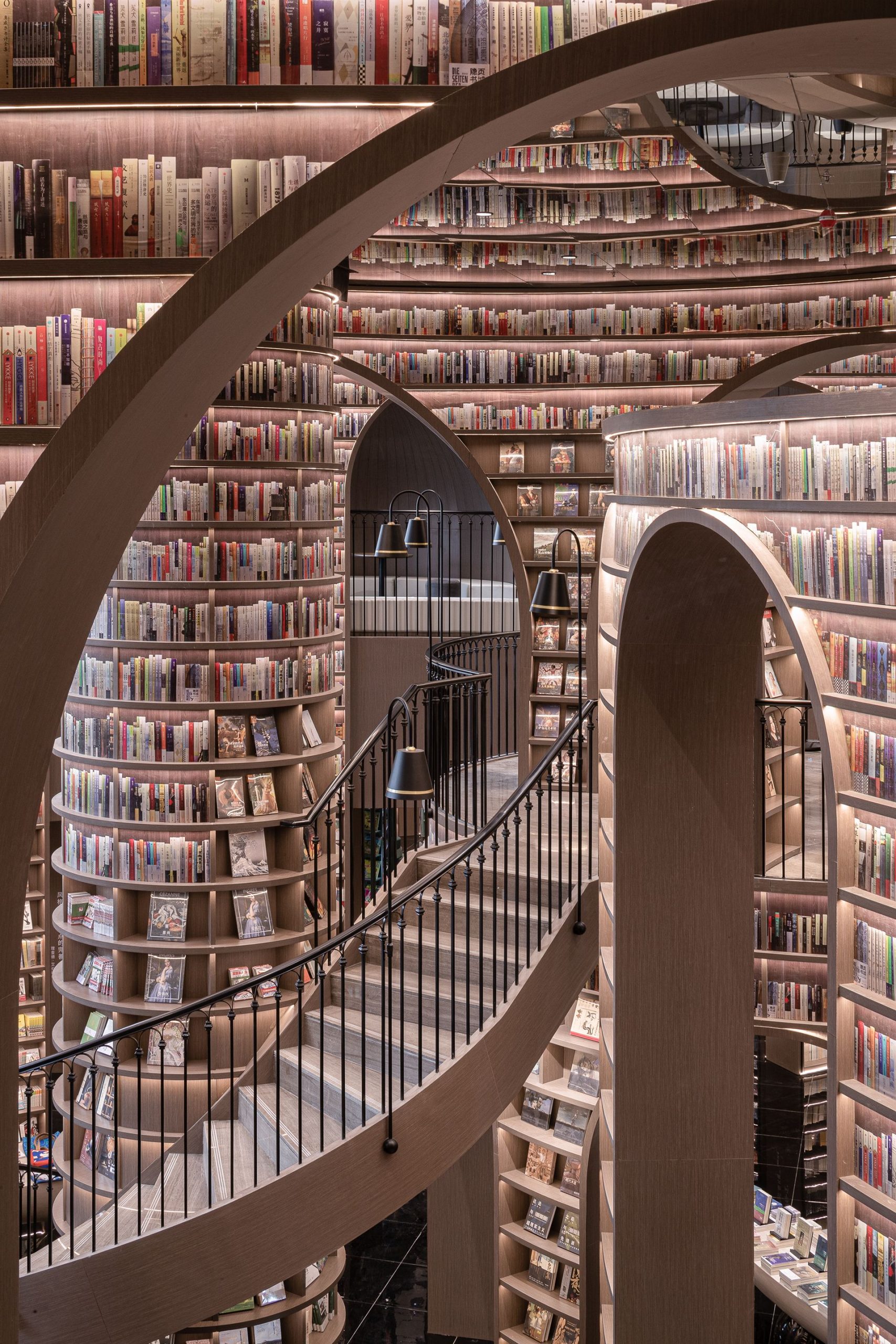When you go up the stairs, the bookshelves beside you offer a variety of books at accessible distance. Other places where people could not reach are decorated with book pattern film, you can still feel the majestic momentum of the space. By creating end scenery and using the technique of architecture, the designer moves the magnificent spirit of mountains and rivers into the indoor space, presents readers with elegant and powerful artistic landscape, and also expresses the awe to nature.