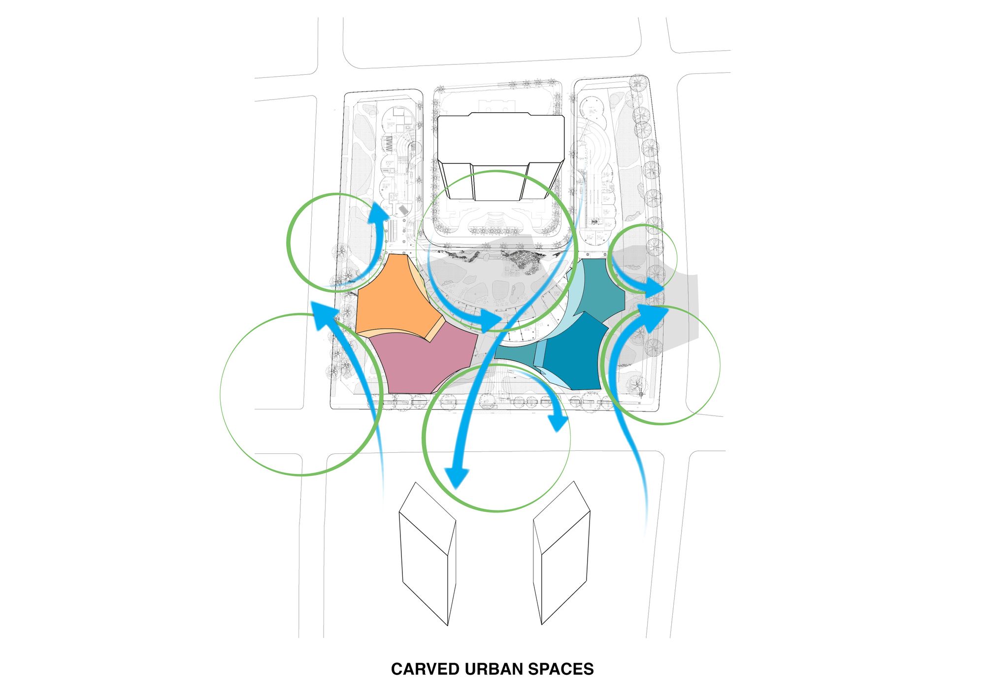 Embracing civic spaces in a symbiotic relationship with each other and thereby transforming the surrounding multivalent urban fabric, the two sculpted towers act as urban space generators.