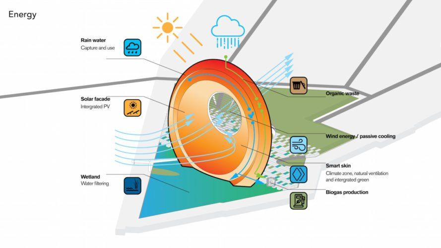 The Windwheel is intended towards advancing sustainable technologies, renewable energy as well as the economy. Electrostatic WInd energy CONverter (EWICON) is only one of the technologies it is meant to develop. Developed by the Delft University of Technology along with Wageningen University, the technology directly converts wind energy to electrical energy. It does not require for the system to move mechanically as is in a conventional wind mill. Rather, “The method is based on transporting electrically charged particles against the direction of an electric field by the wind and accumulating them at a collector.” The tubes within the interior ring are electrodes that will release into the air through nozzles, charged particles in the form of water droplets in a process called “electrospraying”.
