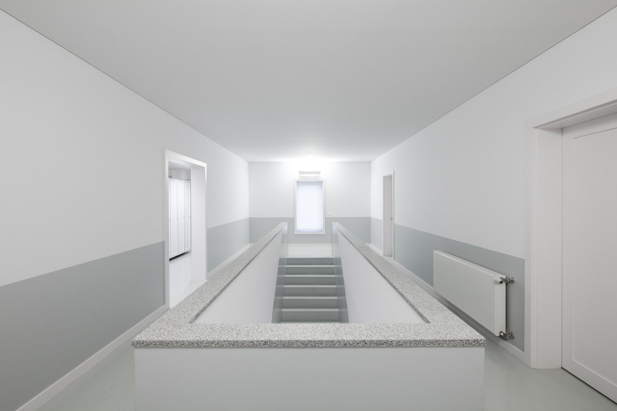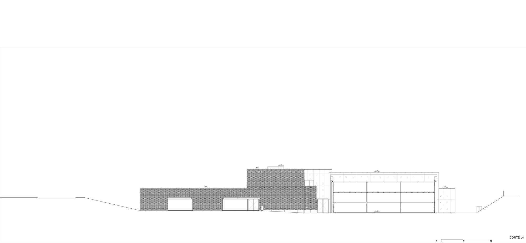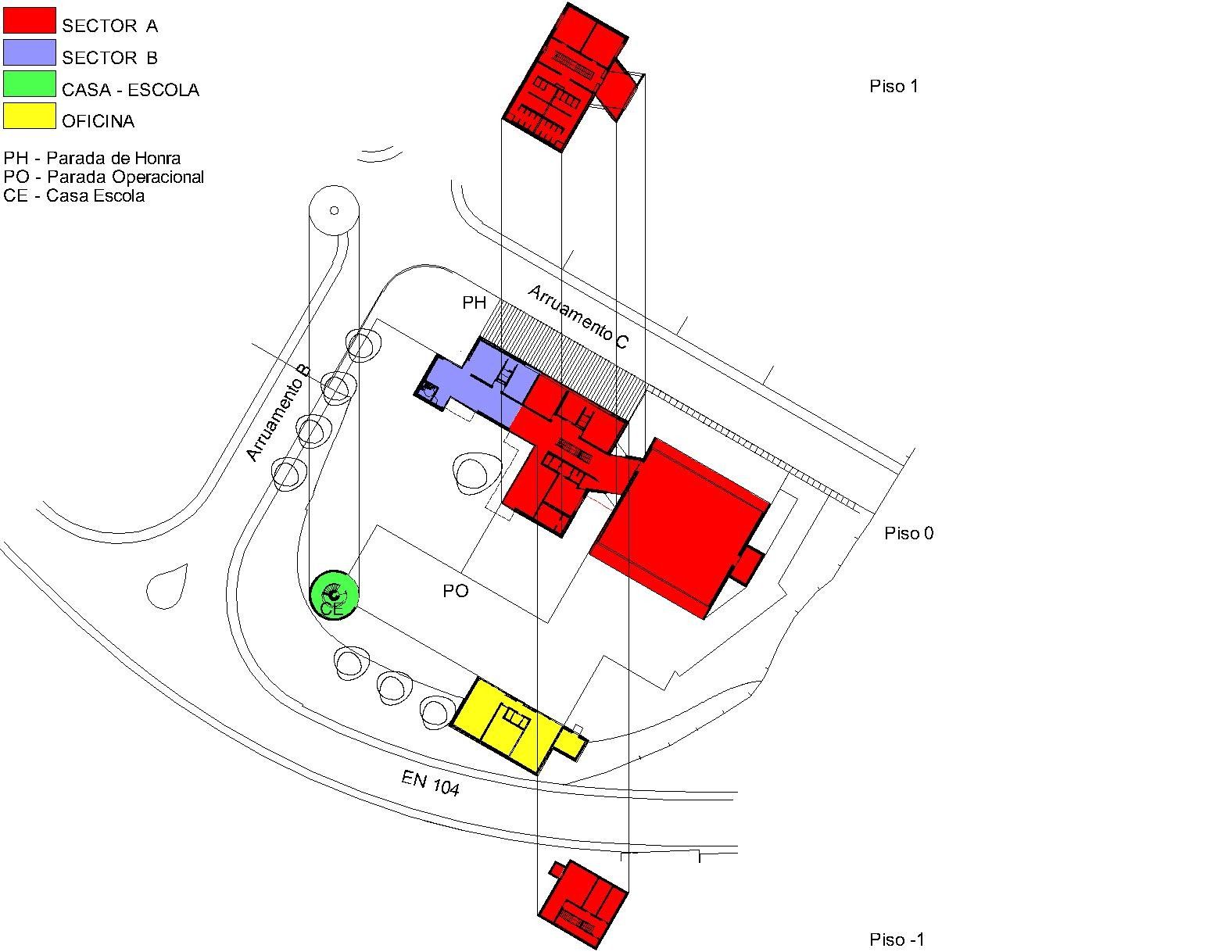 The Firefighters barracks matches the CB1 Type program and is located in Quinta de Geão, at the lot 28, of 4770 m2. The building comprises a total gross area of 1173 m2 and lodges the support functions to the fire brigade. Starting from the “Lobby – Access”, it is organized in 3 floors. It develops exclusively at the ground floor level in the continuity of the sector A, with its own access from the corner of the B and C streets, houses the tasks of the associative sector and comprises a total gross area of 145 m2: – Lobby – common to the sector A – Reception and board secretariat – Board room – Full accessibility sanitary Between sectors A and B there is a circulation space, open onto a courtyard, communicating with all building functions. In the terrain remaining space, between the building and the EN 104, lies the Operational Parade, of 914 m2, with access from the C street and directly from the car park.