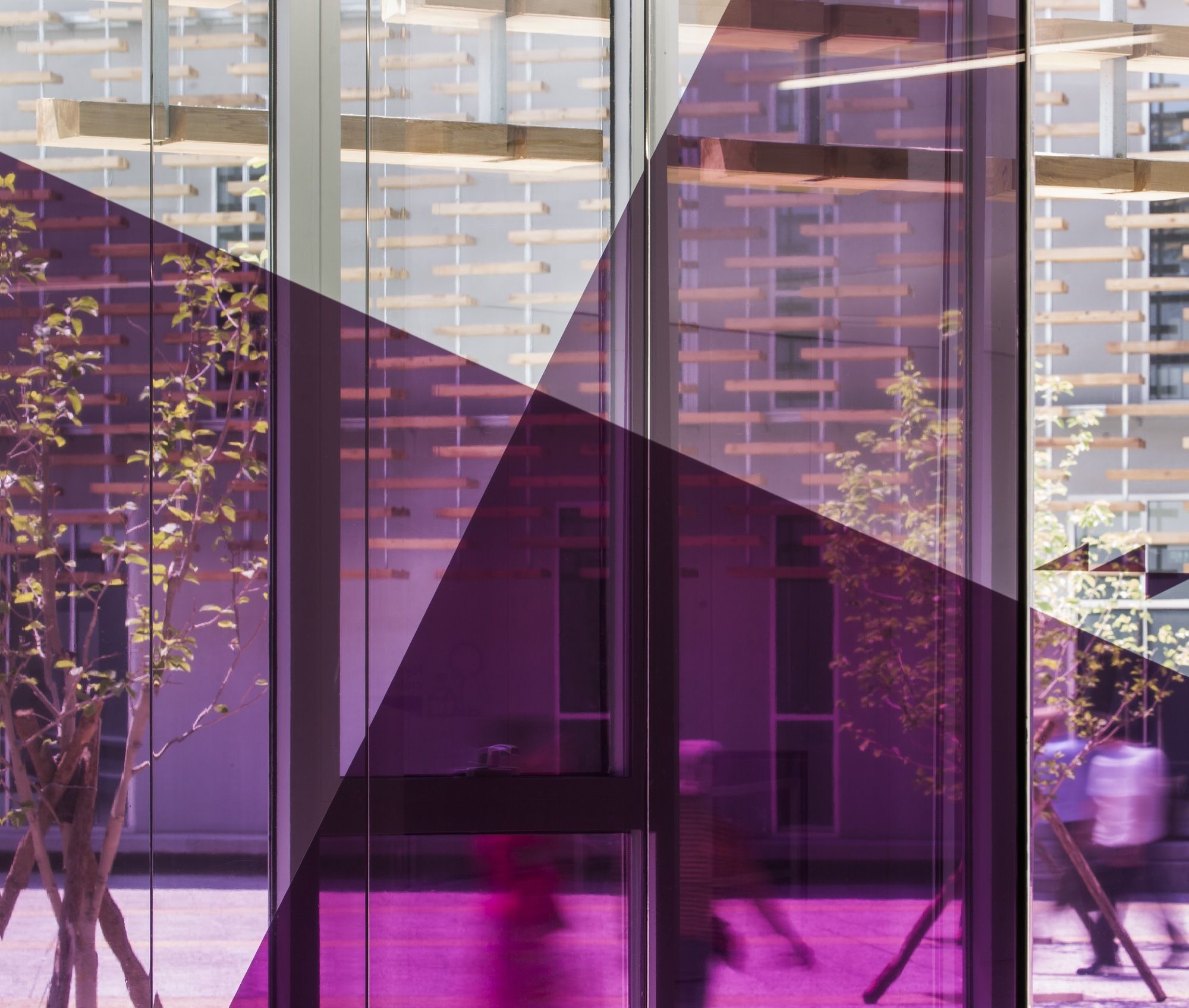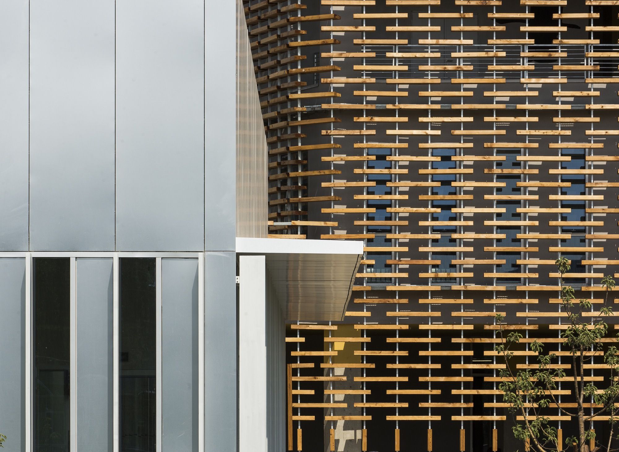 From the second floor up, the classrooms are organized in a rational and flexible way. They are clad in a wooden lattice which seems to float above the organic surroundings formed by the lines of fruit trees. From the inside, this lattice is porous enough to let through light and not obscure views of the outside. It plays a major role in shading the building from the sunlight and protecting the school’s activities from outside eyes. Finally, the lattice creates a serene, innovative and identifiable architectural look, drawing inspiration from traditional Chinese architectural.