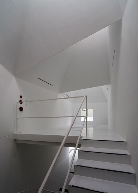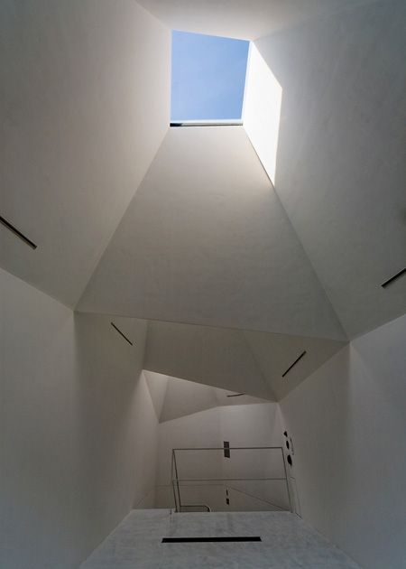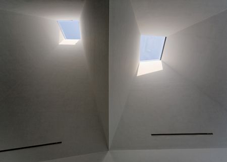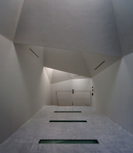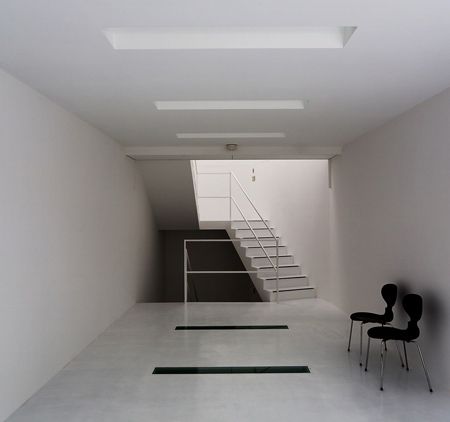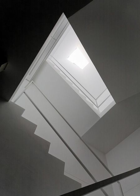 The architects chose to create a volume for natural light in an area so abundant with artificial light. Three ‘light funnels’ make up the roof, channeling light into the interior upper floor, which then filters through to below by way of slit-windows set into the floor. The interior is really something. Very clean lines, sharply executed details, the light from above- which exists for the most part as sourceless due to the depth of the stacks- plays off the smooth white concrete walls with a sense of… theatre almost.