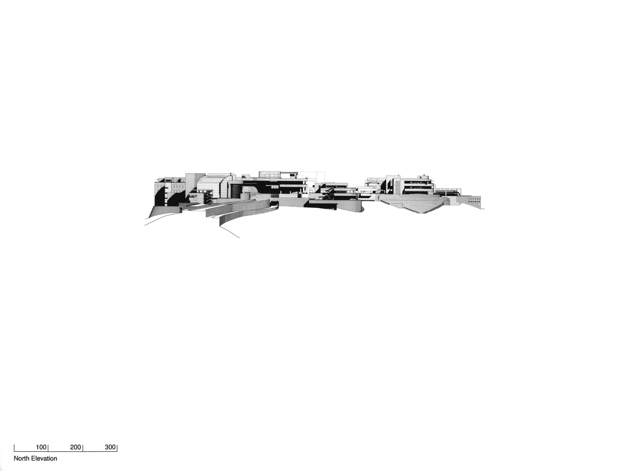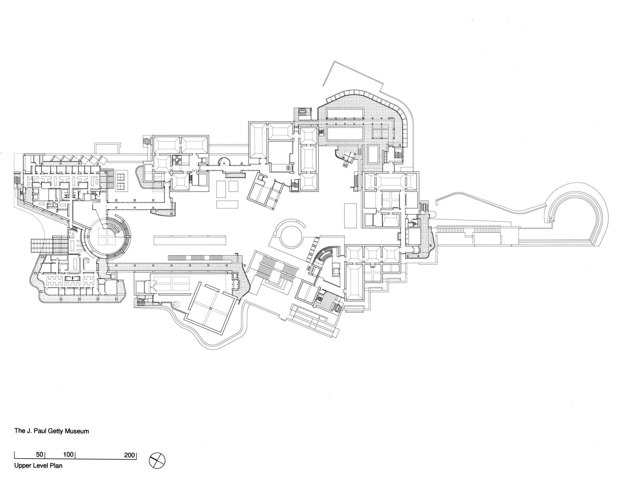 Completed in 1997, Richard Meier’s program brings the seven components of the Getty Trust into a coherent unity, while maintaining their individual identities. The layout establishes a dialogue between the angle of intersection and a number of curvilinear forms that are largely derived from the contours of the site infected by the Freeway, the metropolitan grid, and the natural topography; the overall parts relate to both the City of Los Angeles and the Santa Monica Mountains.