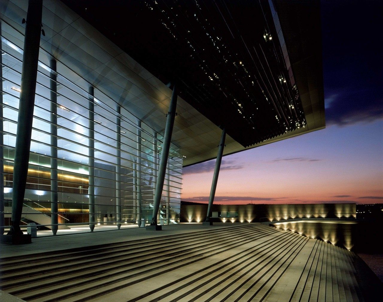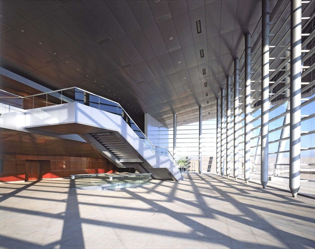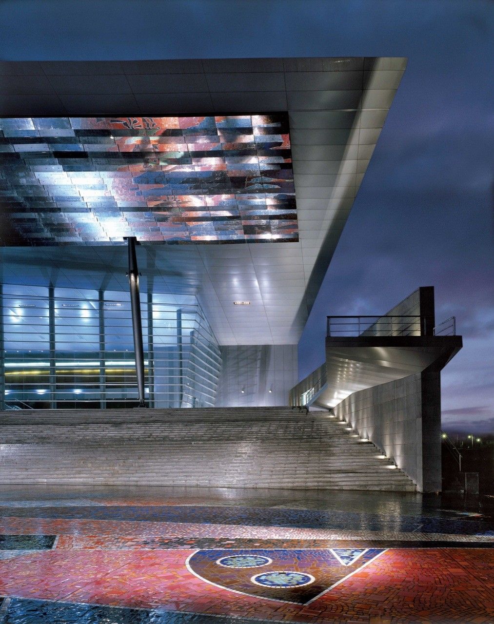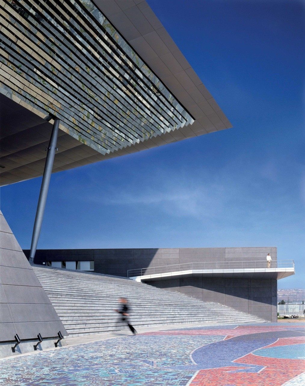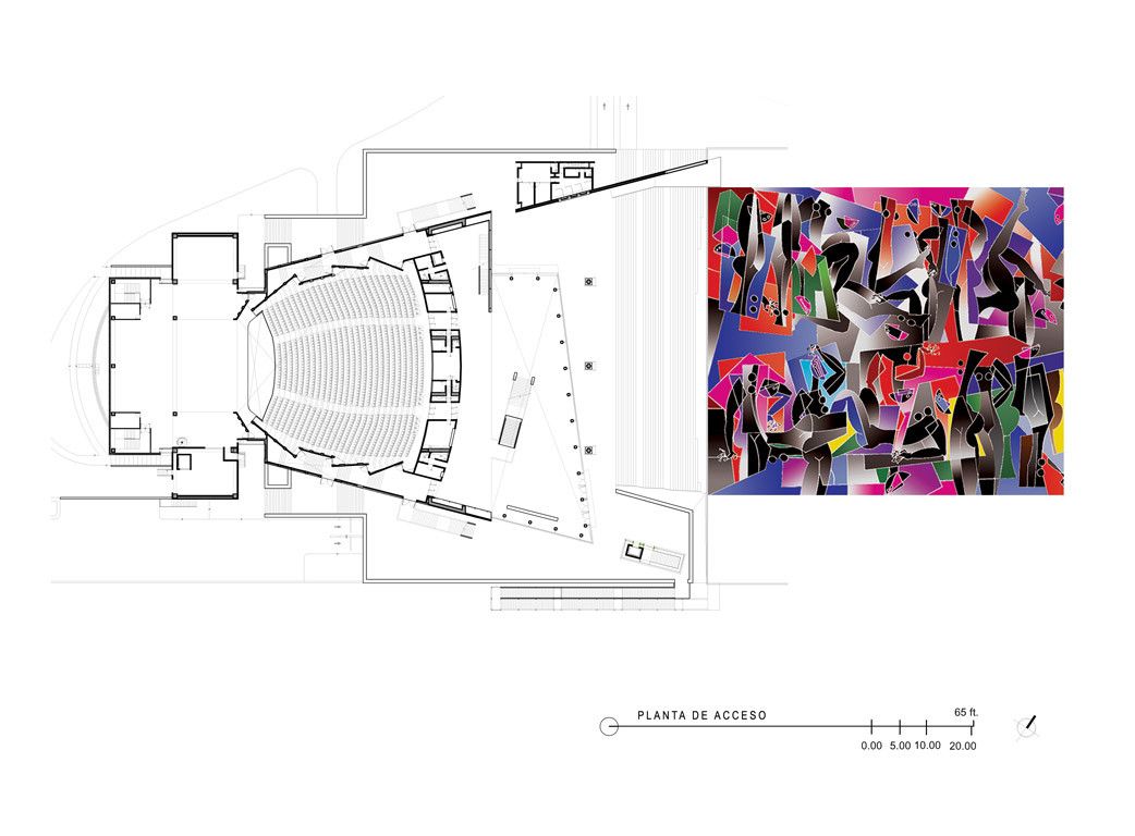 Stairways and ramps act as connectors to keep the flow of people constant. The Auditorium is entered from an exterior staircase that connects the square with the auditorium, and through a wide mouth that serves as the main entrance located at the side of the building, that ends in a large lobby or foyer which serves as a meeting place and as a space from which to see the great mural square. Thanks to the high transparency achieved in the foyer through large, fully transparent glass and slender silver studs, the space of the square becomes part of the auditorium itself, creating a visually continuous space.