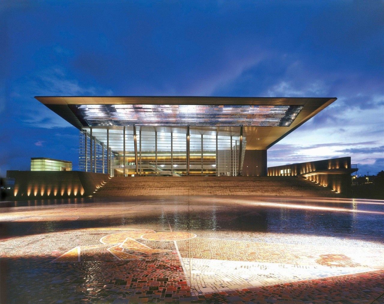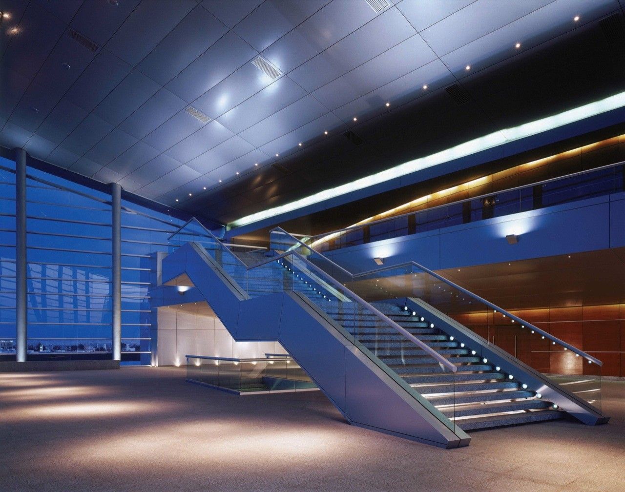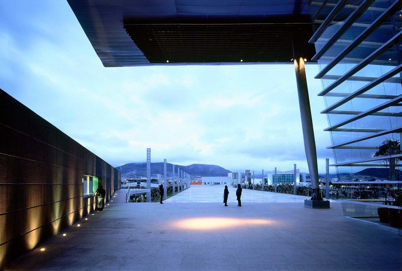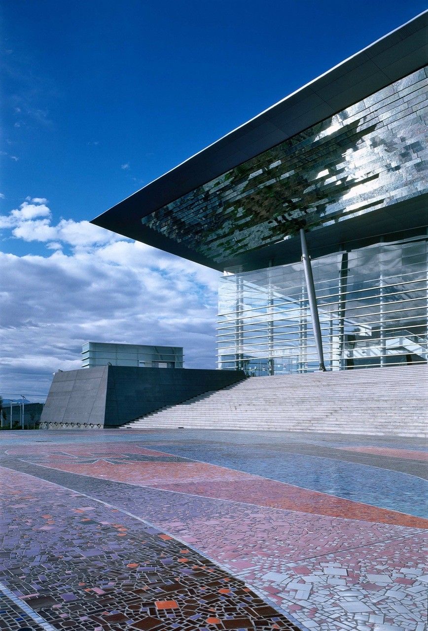 Stairways and ramps act as connectors to keep the flow of people constant. The Auditorium is entered from an exterior staircase that connects the square with the auditorium, and through a wide mouth that serves as the main entrance located at the side of the building, that ends in a large lobby or foyer which serves as a meeting place and as a space from which to see the great mural square. Thanks to the high transparency achieved in the foyer through large, fully transparent glass and slender silver studs, the space of the square becomes part of the auditorium itself, creating a visually continuous space.