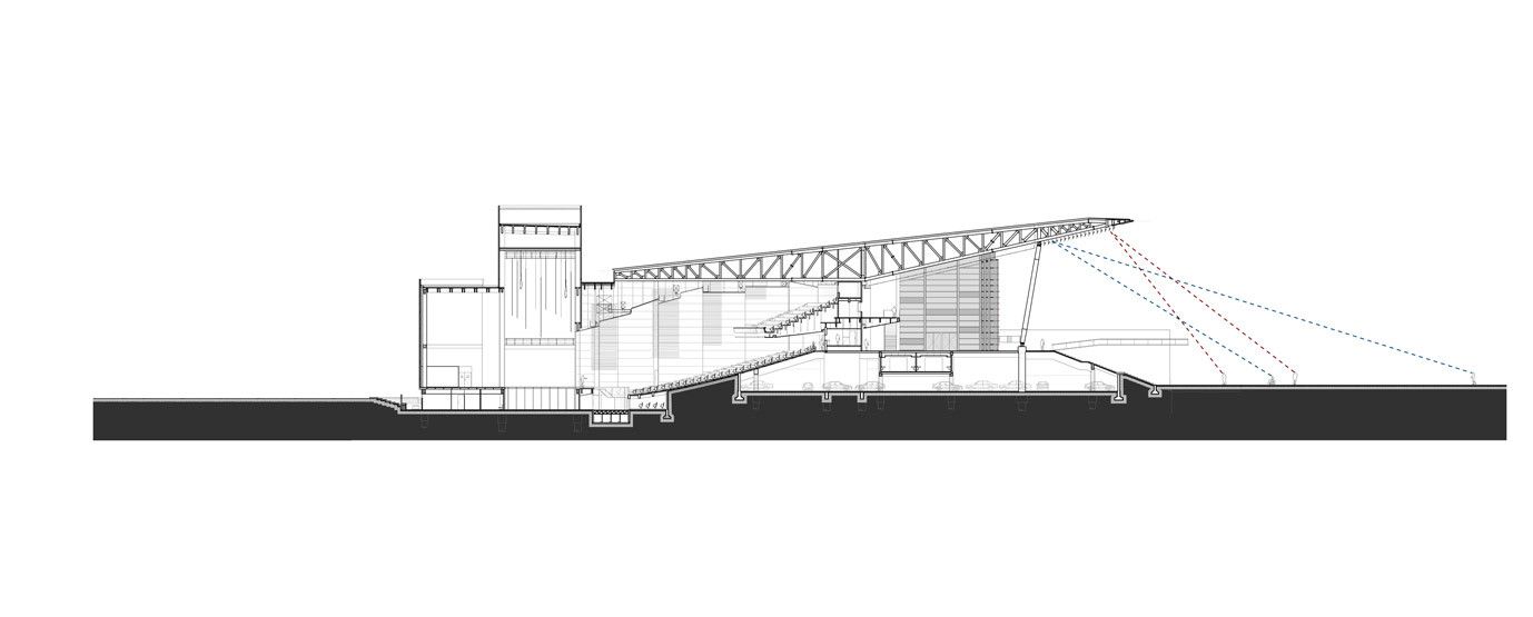 This building is set on a stone podium, where one of the main objectives is to be the first point to observe the mural. Its curtain, or background, is represented by a stone element that houses the stage and backstage.The envelope of the Auditorium Theatre is silver and black, in honor of the Silver Zone in the city of Pachuca, while inside, it is expressed in browns and intense reds representing the heart of the project, a living project, a remembrance of the great theaters of old.