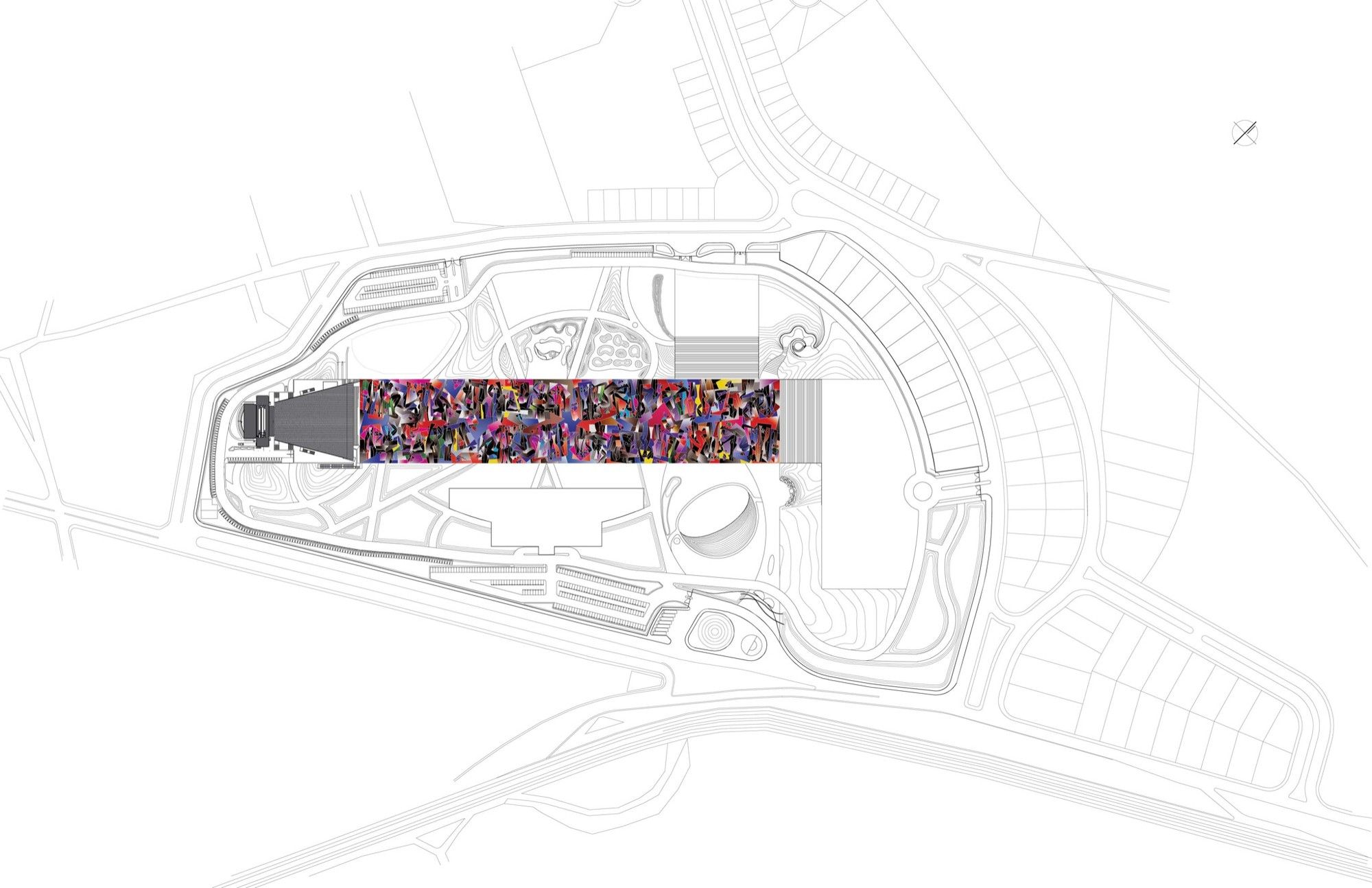 The project for Gota de Plata Auditorium Theatre, designed by the architects Jaime Varon, Abraham Metta and Alex Metta from Migdal Arquitectos, is one of the main elements of this large ensemble; it is situated at the south end of the Culture Park and given its position within the complex, it acts as The Visual Culmination of this great “sea of colors”. Hence arises the idea of reflecting the mural square through a reflective glass roof, set 25 meters above the ground and with a 40 meter overhang on both ends.