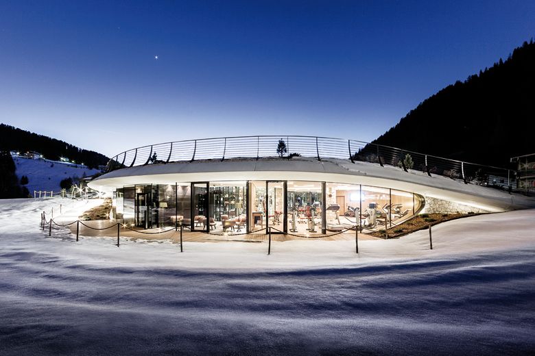 The new SPA, finished in December 2016, with a jubilant shot of dynamic contemporary architecture was designed by Perathoner Architects. As the spa is located in the garden area of the hotel, much consideration was given to how to minimize the visual impact of the new building on the site.
