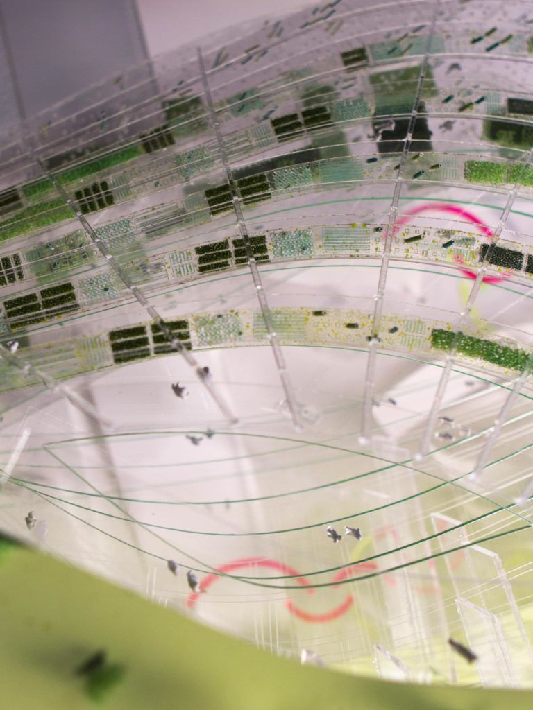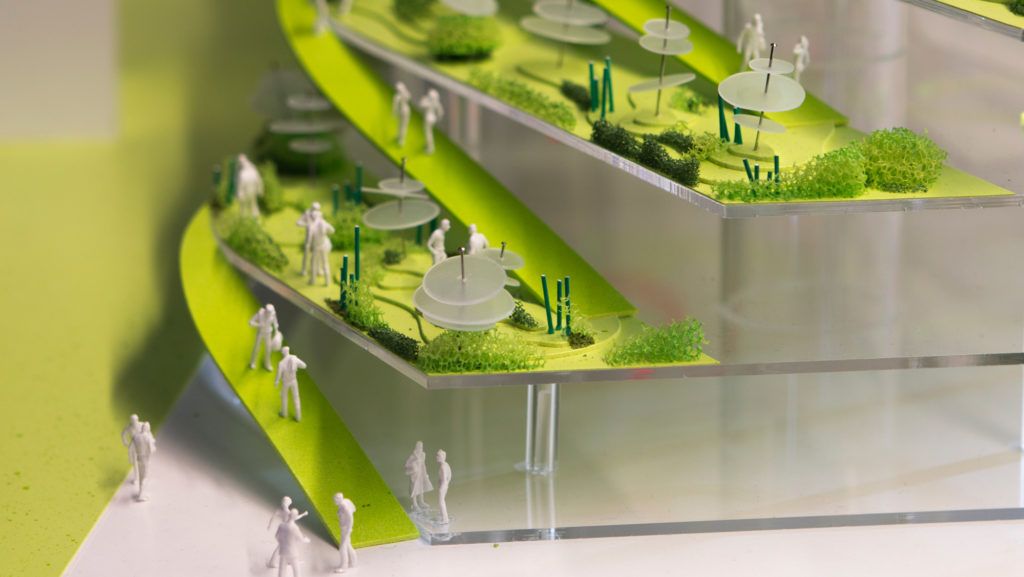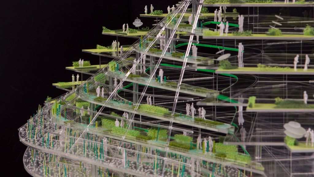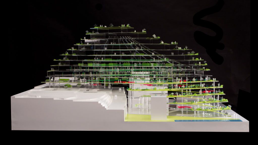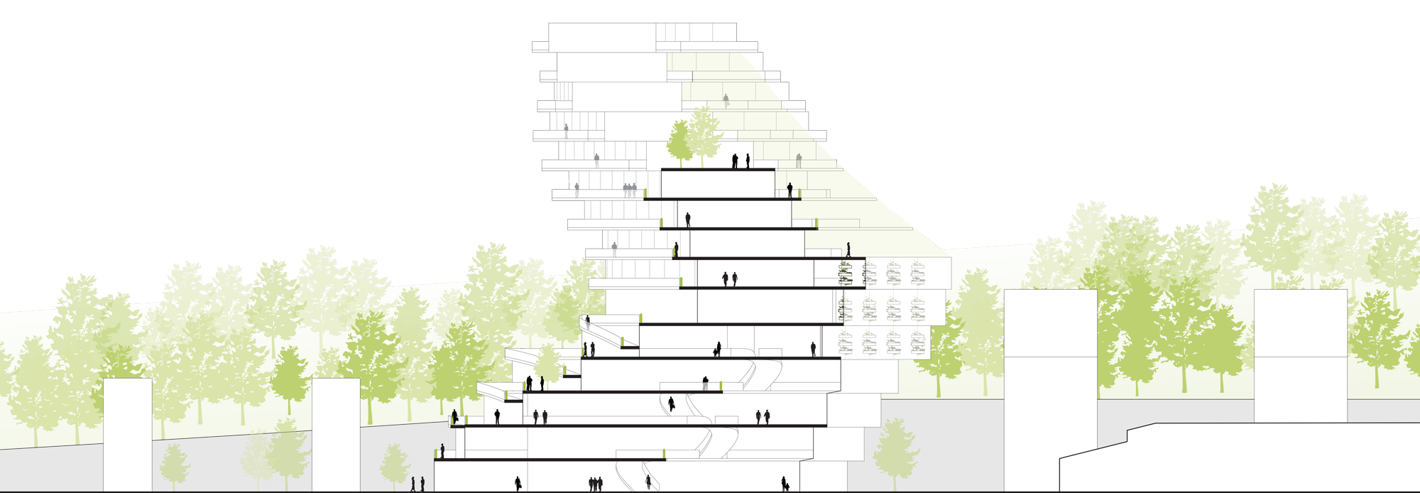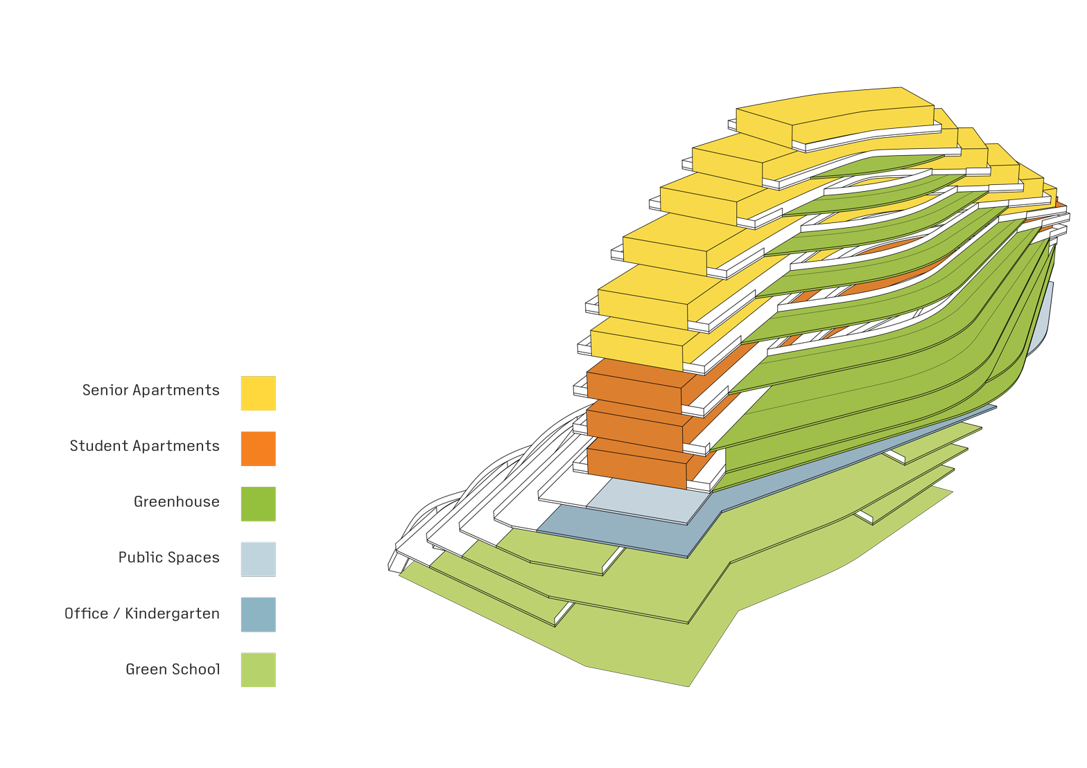 The building is formed by two adjoining arcs. The green school and accompanying greenhouse constitute the public arc and allow for internal and external circulation through the building with the vegetation growing all around. Nine levels of housing for students and seniors twist slide and shift to create wide private terraces and maximum daylight exposure.