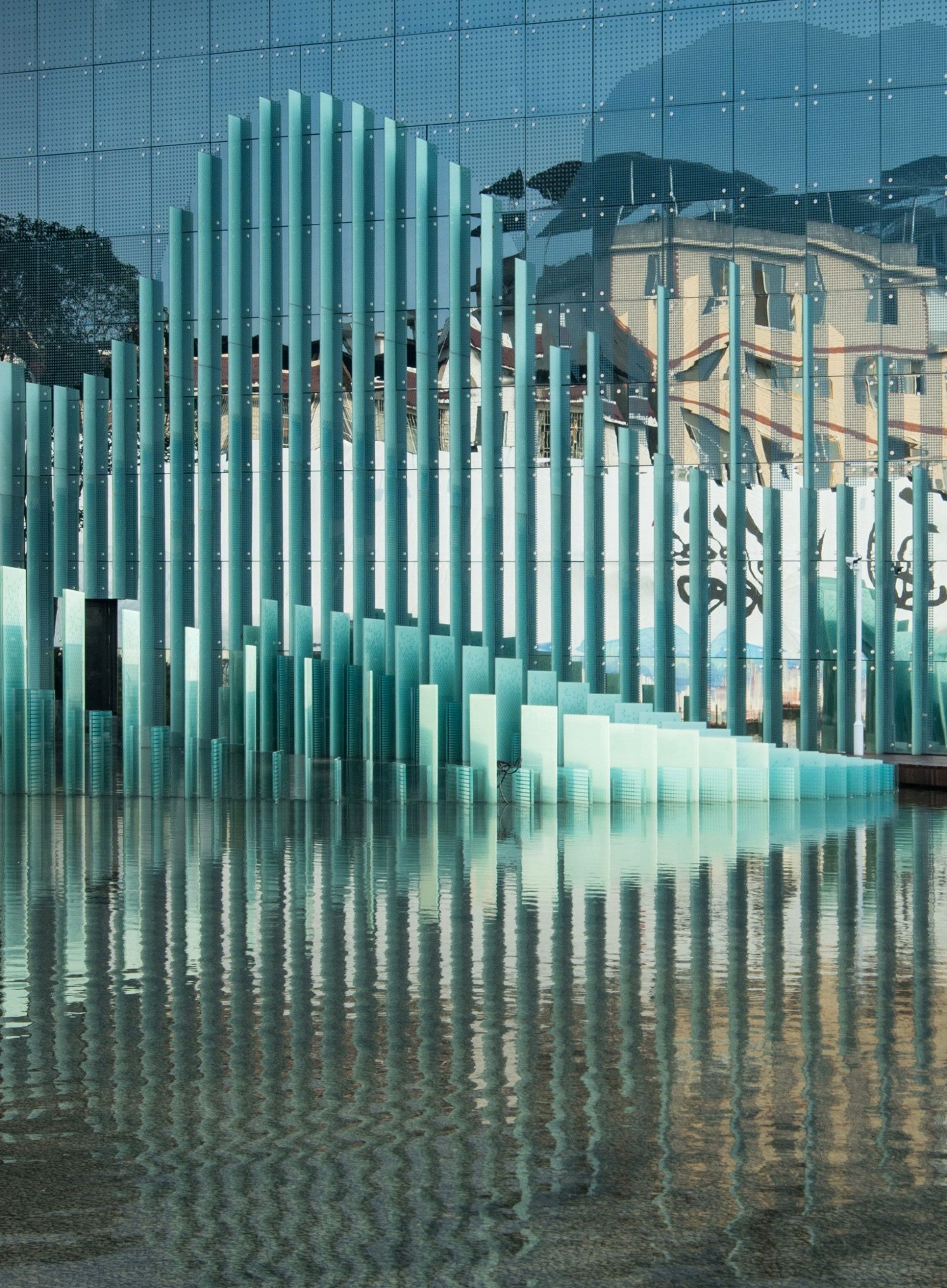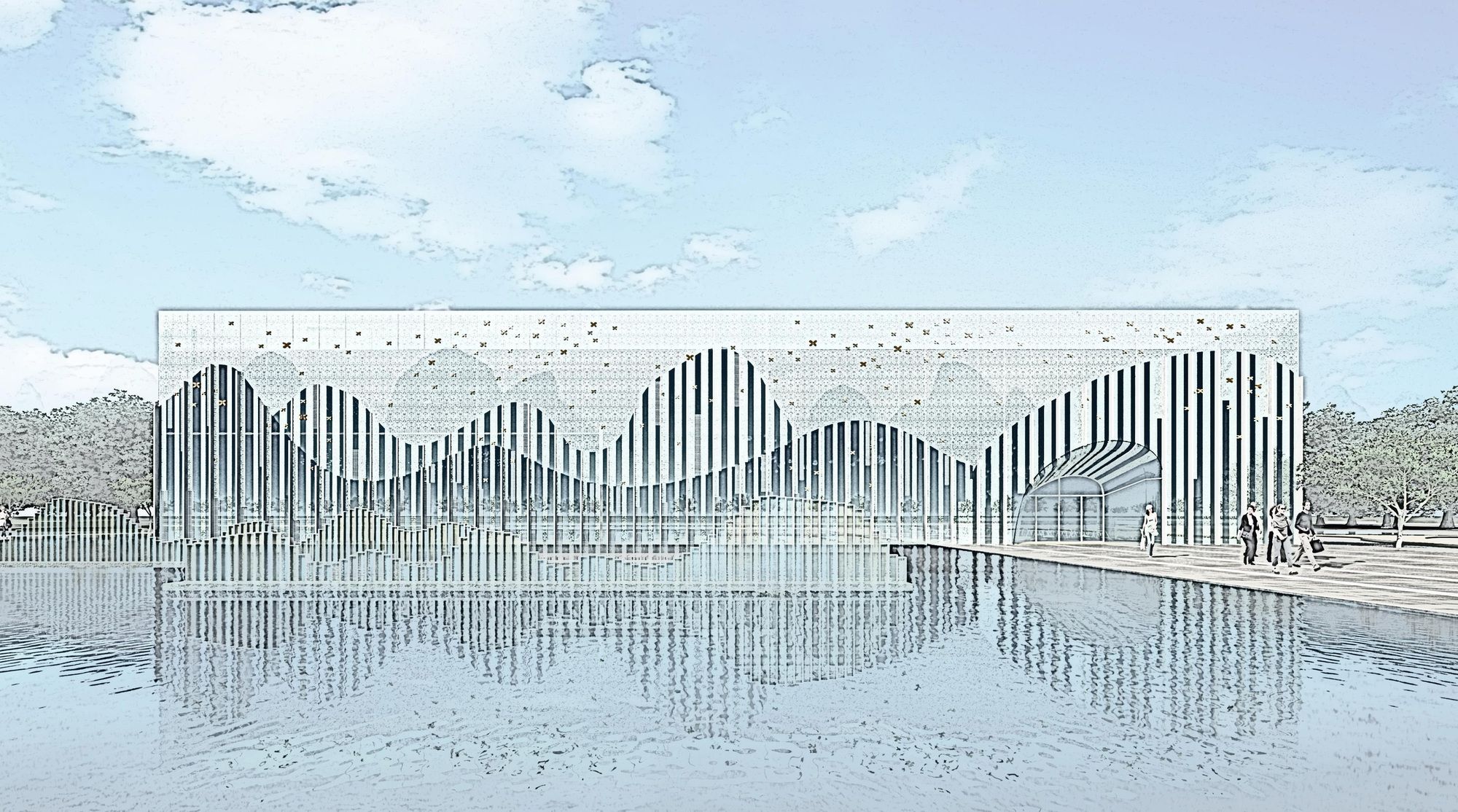 Mountains in Guilin are well-distributed far and near. In addition to the inverted reflections on the water, a rich gradation is formed accordingly. This architecture manifests the hill shapes up and down through the rising and falling vertical glass ribs and creates three hill shape levels of the facade through different densities and overhang scales of glass ribs, namely “nearby view”, “medium view” and “distant view”. Thus, the gradation superposition caused by the transmission, reflection and refraction effect between different glass can form subtly changeable dramatic effect under different light conditions such as cloudy, sunny, raining and foggy. In the mottled shadows, the “boundary” becomes blurry and flowing. At a close look at the architecture, people feel like staying in the mountain range while steam flows above, and the architecture reflects the changes of the surrounding natural environment sensitively. Viewers, architecture, and landscape of Guilin interact with each other, creating a wonderful and far-reaching prospect.