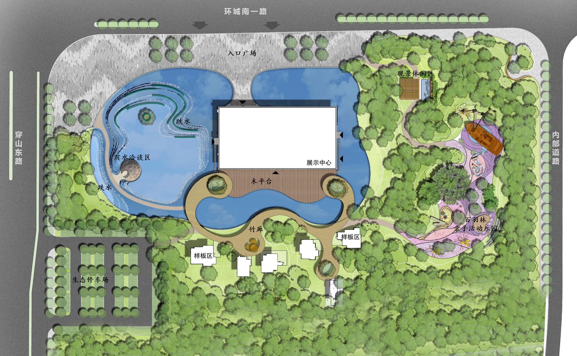 The landscape design of the Exhibition Center continues the theme of landscape and realizes the linkage and scaling of space by virtue of layered water surface, winding path and elegant bamboo gallery, which forms a delightful contrast and makes people stroll in it. As people move their steps, they will see different sceneries and go into a wonderful paradise from the landscape.