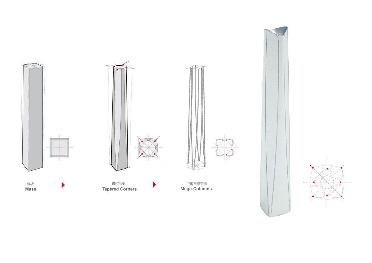 The Haikou tower is meant to serve as a place for commercial offices as well as a hotel. Starting from the ground up, the structure and the form of the building are responsive to the assigned function of the floors. The large outrigger truss integrated where to hotel lobby begins represents the shift in the structural system of the building.