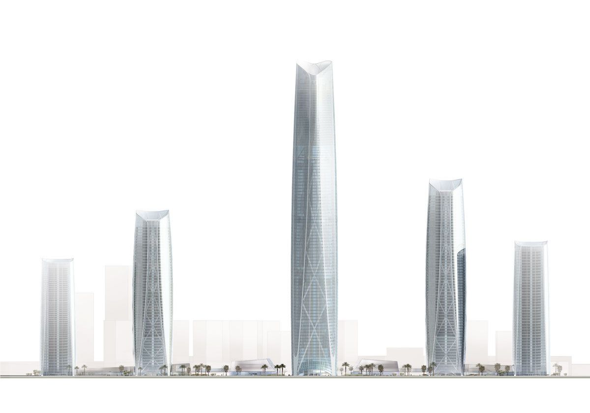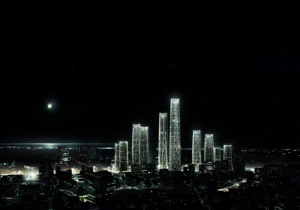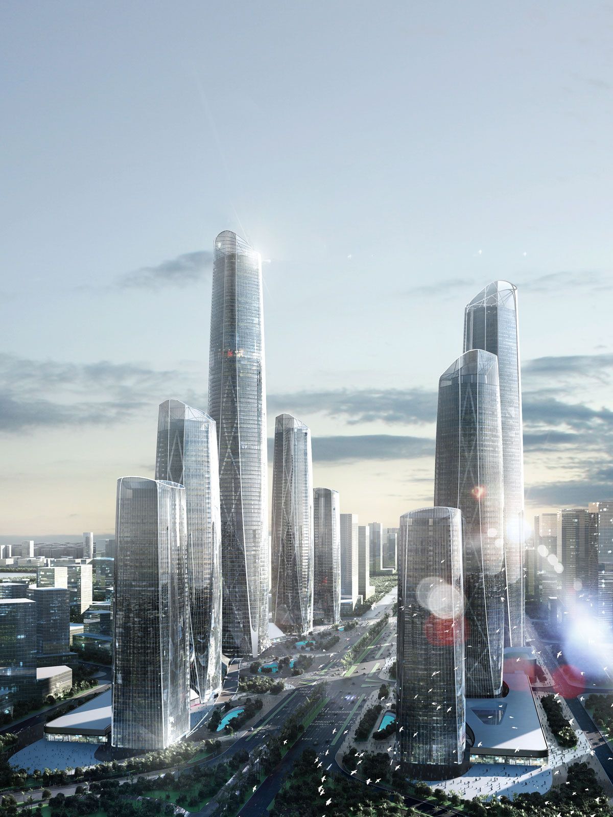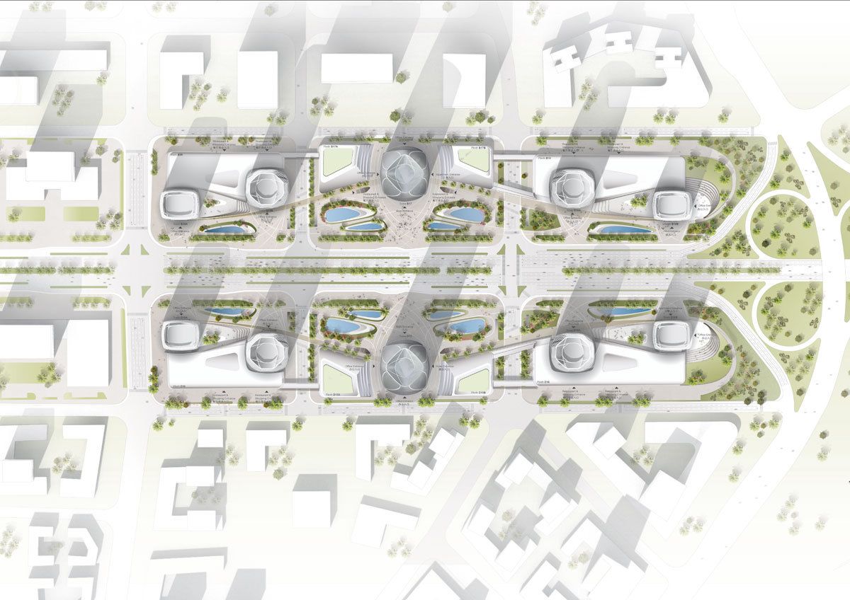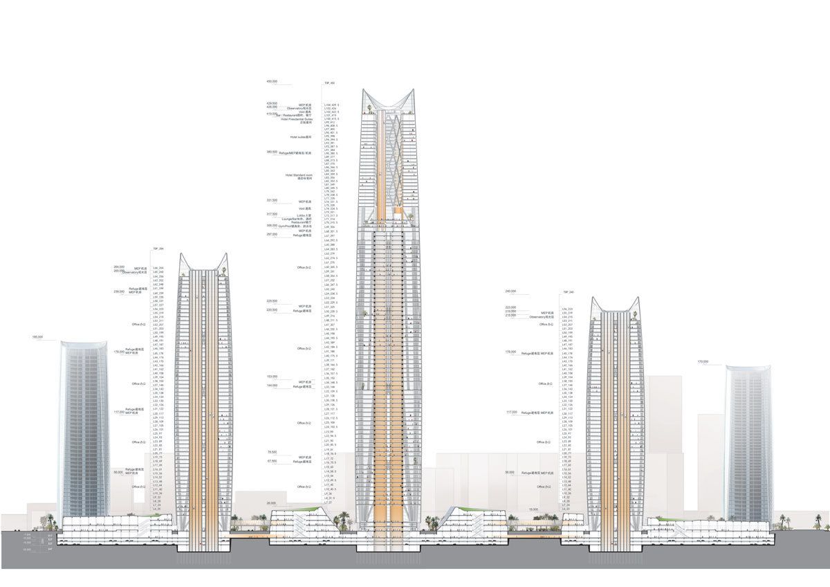 The complex is arranged by two rows along the central axis of the district with two towers at the center featuring it as a landmark. The Haikou tower is at the ‘peak’ of a series of 10 towers ranging from 150 to 450 meters in height and taking over a total of 1.5 million square meters of the district.