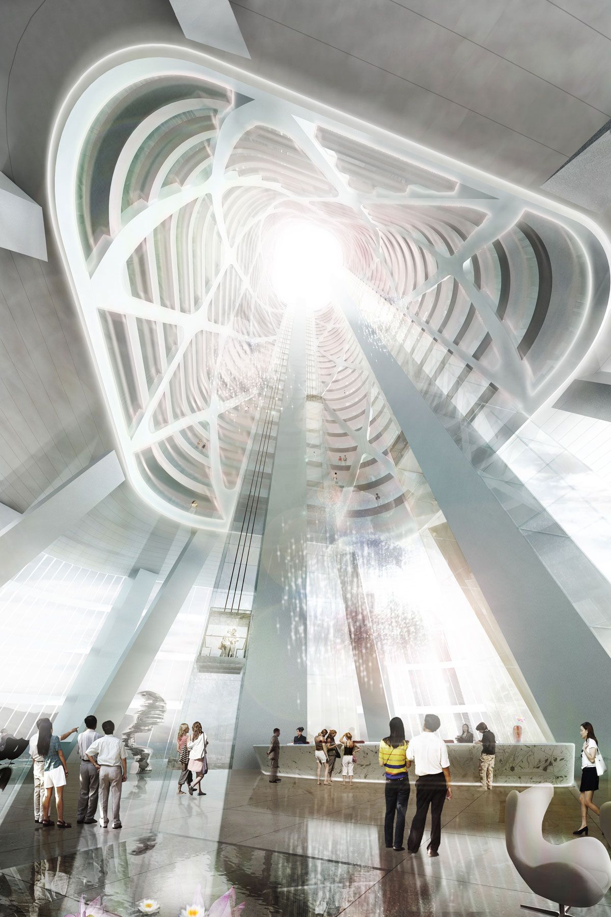 The hotels structure, starting at the lobby at the 72nd floor, up to the 100th is accompanied by a full height atrium in its core. By substituting the concrete walls for steel, the hotel’s interior is able to breathe, as well as provide unobstructed views to the guests. The hotel is, therefore, able to accommodate 46,000 square meters of guest space along with a sky lobby and observatory floor located at the top.
