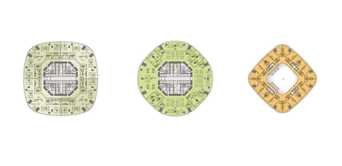 The office spaces in the tower are designated to the first 72 floors, approximately two-thirds of the building. The outlined spatial requirements for the office spaces were to have large open column free interiors. The flexibility that was desired in the open planned office (185,000 square meters) requires the use of megacolumns at the eight exterior points of the building. As a result, the core and the megacolumns carry the vertical loads, where as the megabraces support the horizontal ones.
