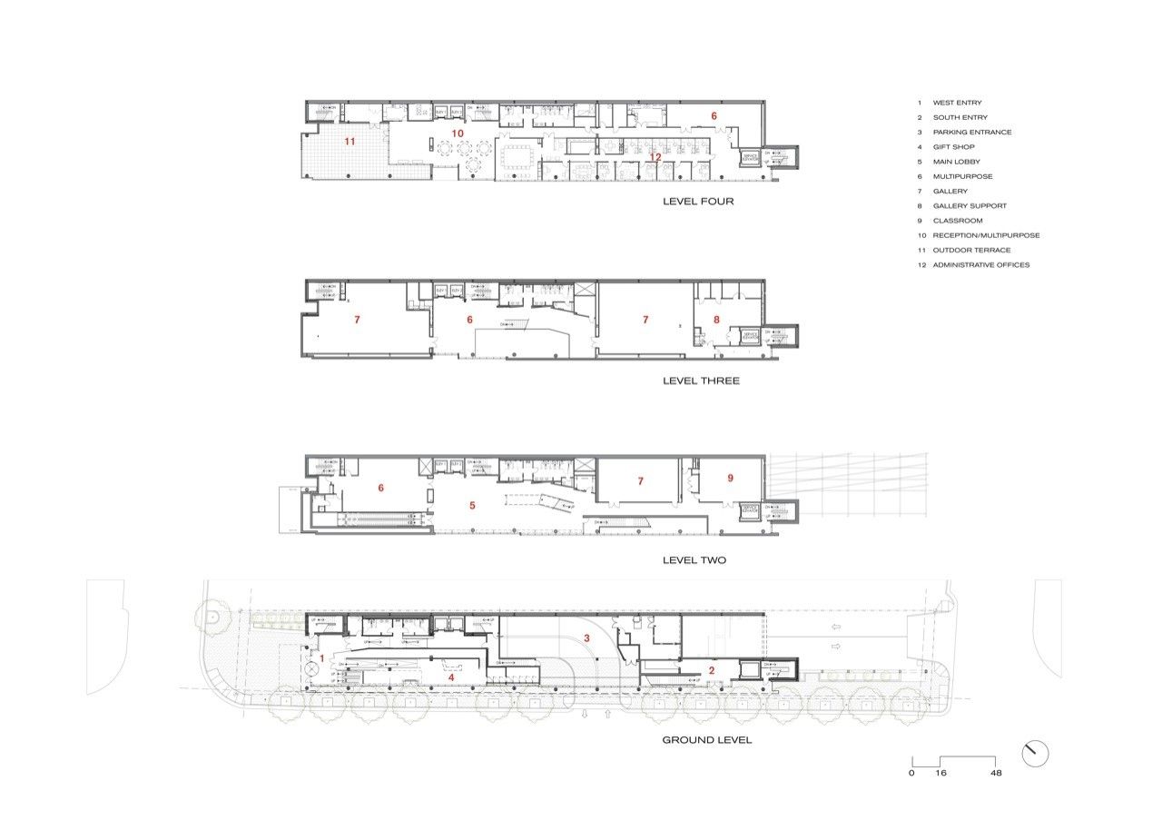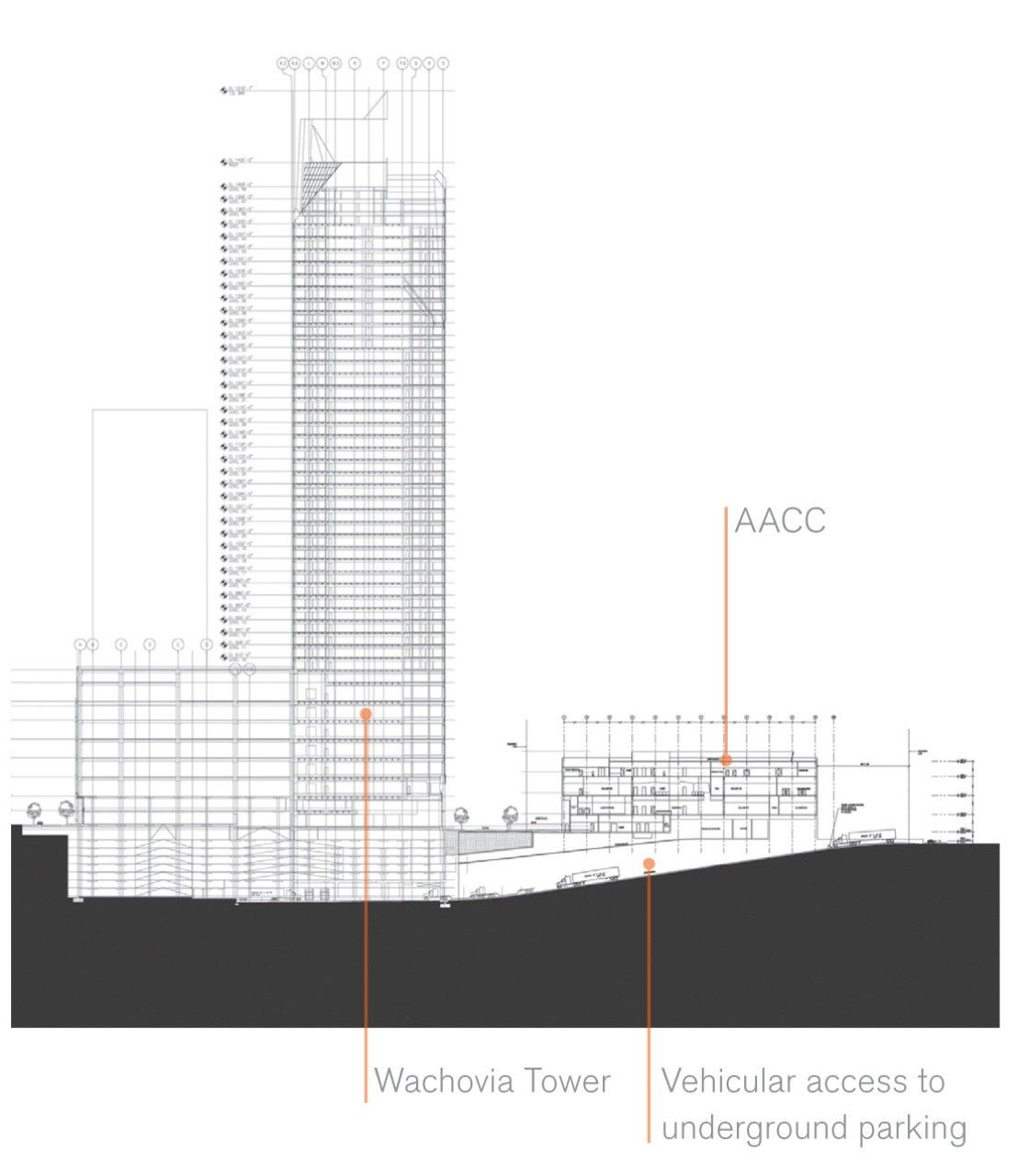 Situated on a narrow 50’ by 400’ tract of land, the Gantt Center site presented the additional challenge of positioning the building above car and truck access ramps that lead to below grade parking for the Wells Fargo Tower. The dynamic subsurface vehicular activity and the exaggerated linear proportions of the site provided a great opportunity for a powerful architectural response to the building’s program and physical context.
