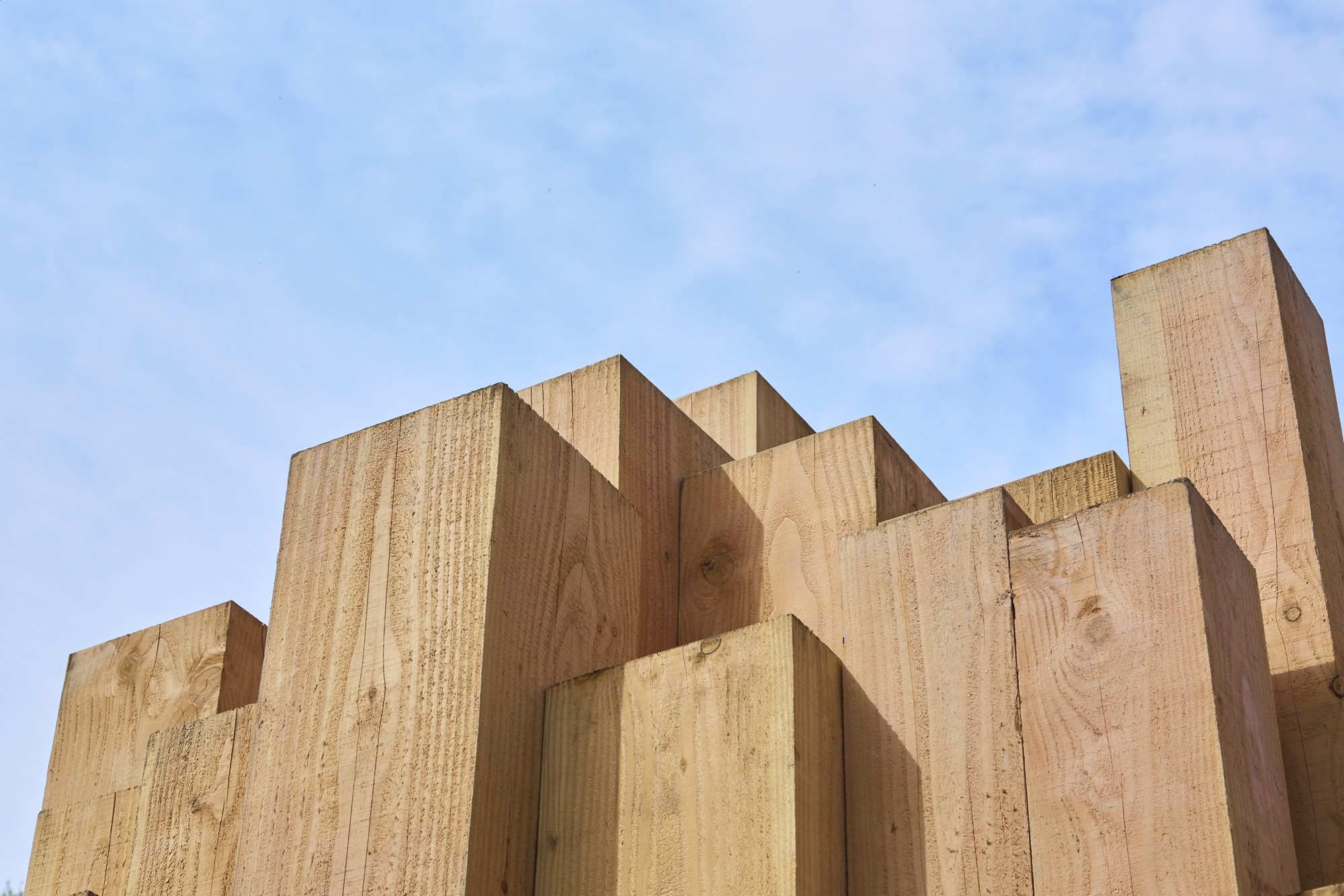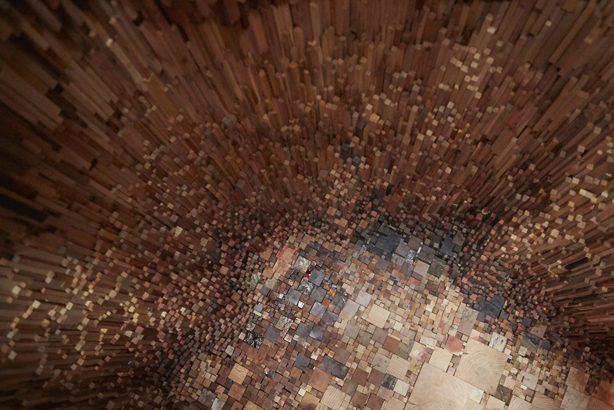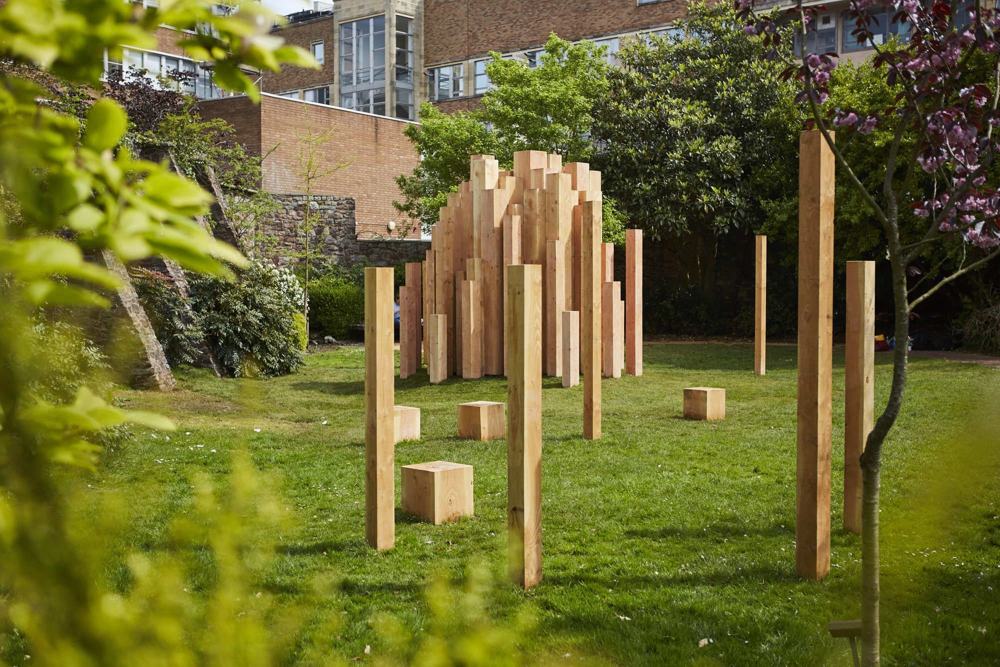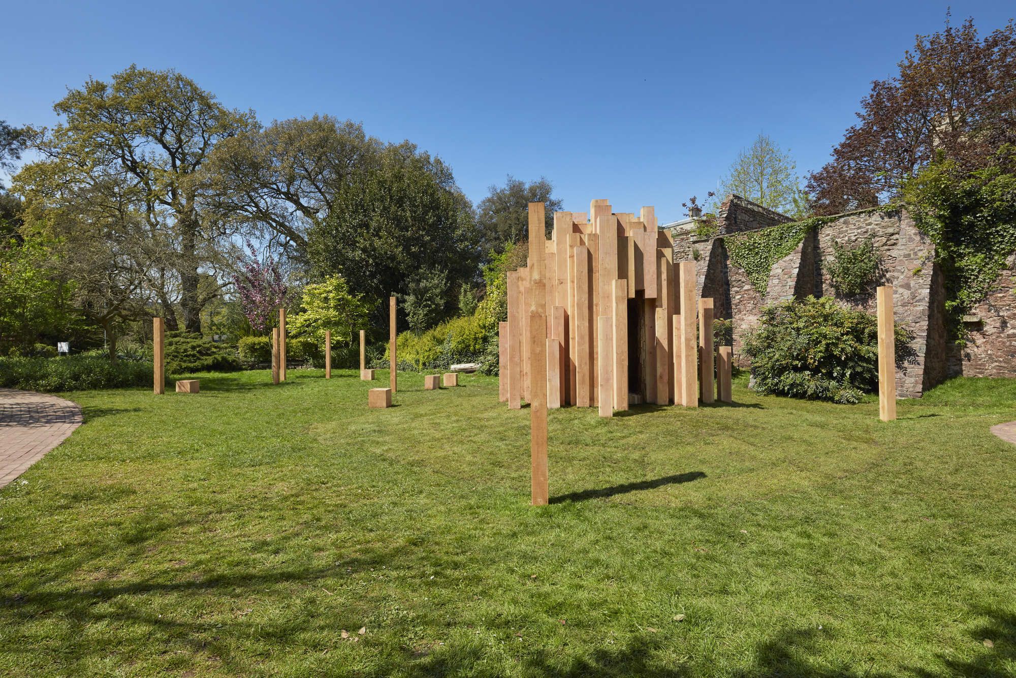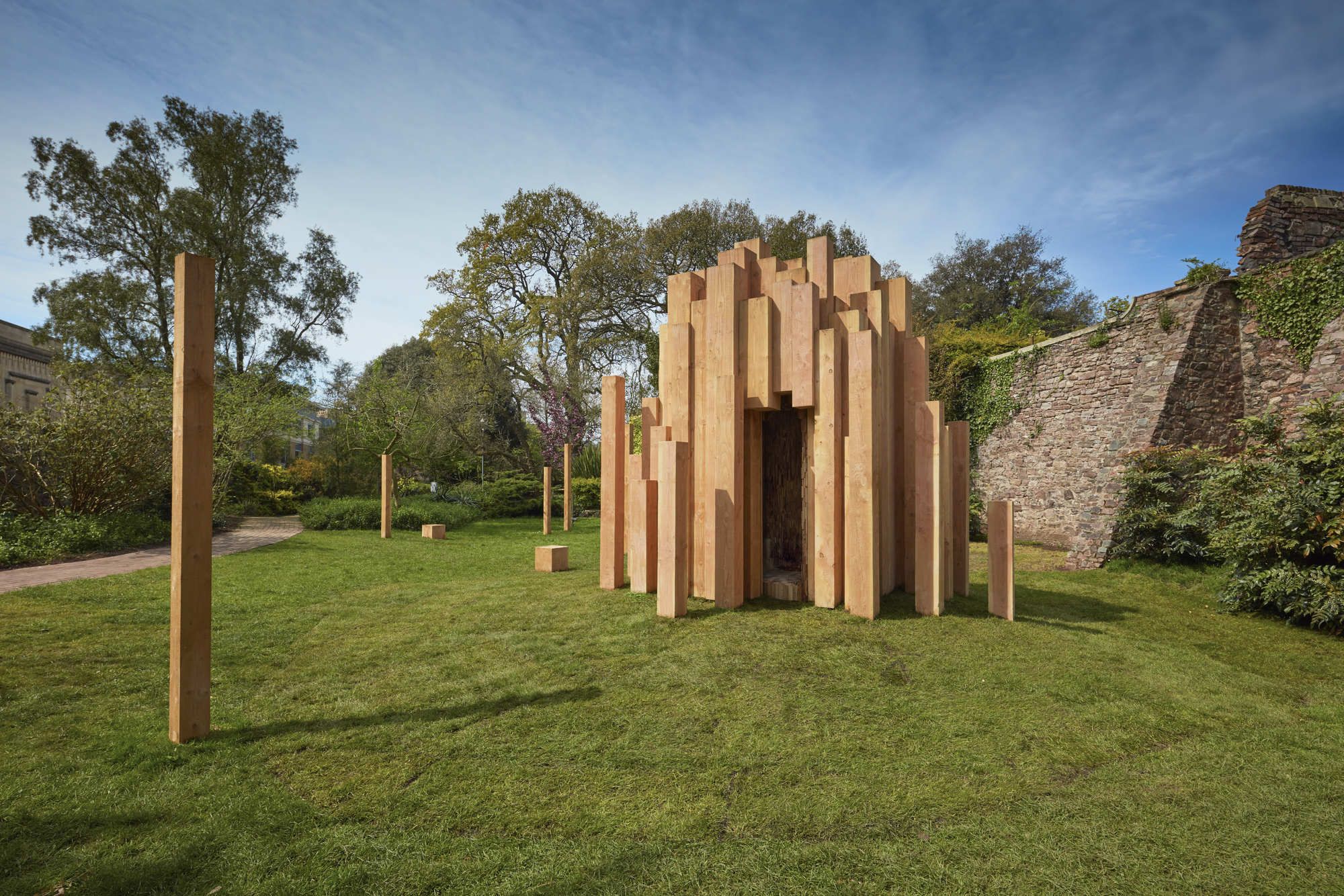 From the inside, Hollow’s domical shape forms a falling mosaic of wooden stalactites with light breaking in from above. Placed in the Royal Fort Gardens, the conceptual artwork consisting of massive trunks appears like a natural sculpture.