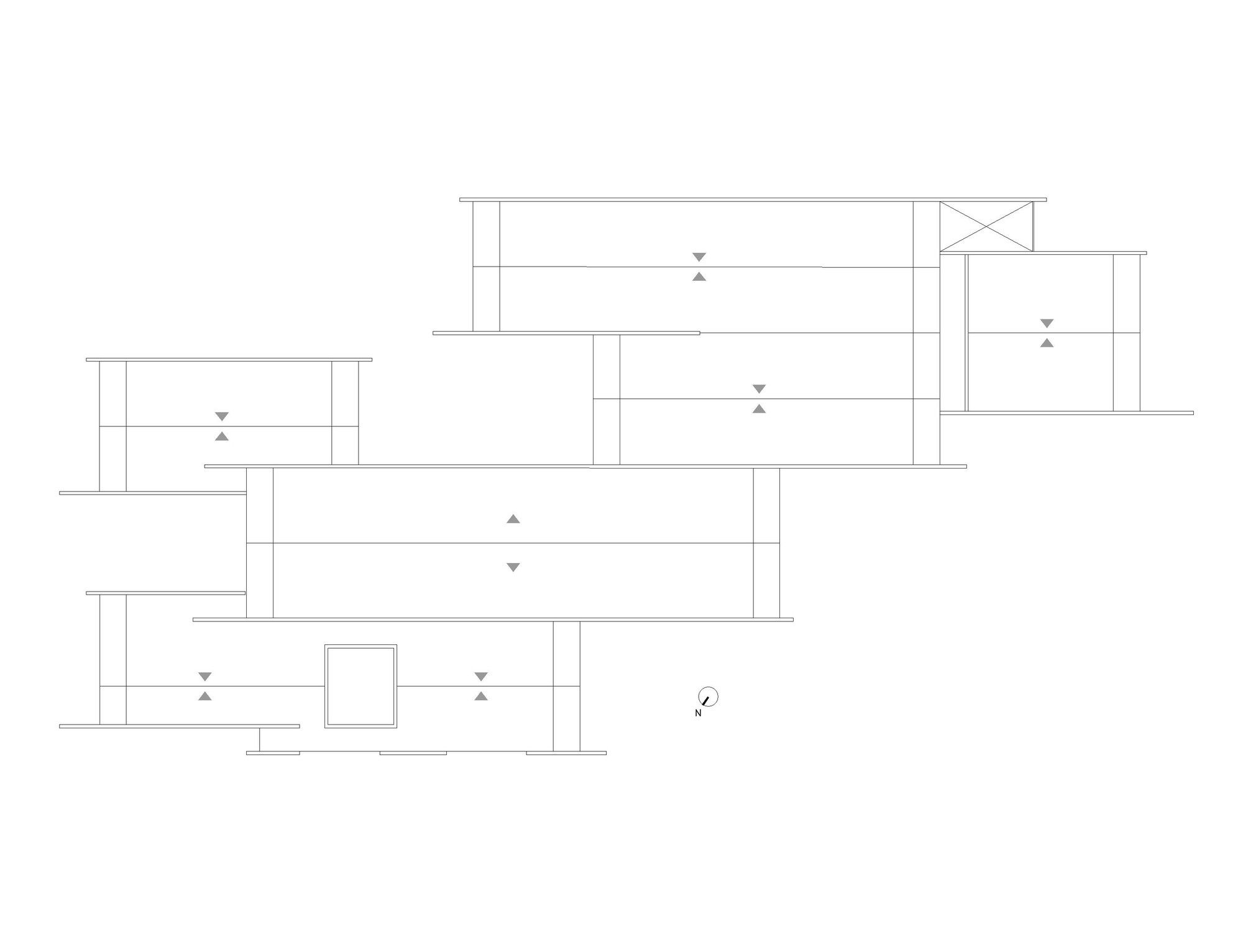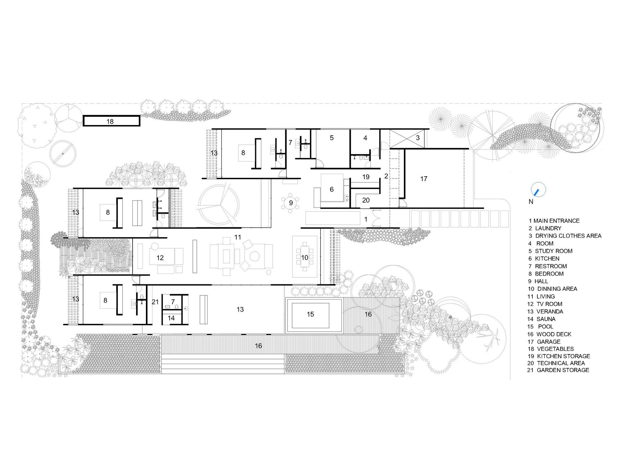The area of 7000 m2 enabled to spread 850m2 of construction on the ground. Gardens permeate the volumetry and generous windows of wood and glass connect the experience to the landscape. Varieties of perspectives are revealed while walking through the house. The rooms have different heights that confirm a spatial hierarchy. Extensive walls, coated with polymer mortar, define fluid spaces and openings positioned in all directions integrate the living areas. The large windows frames are mostly positioned east west and the walls north south. This orientation allows a dramatic natural light effect during Sunshine / sunset and open views across the house.