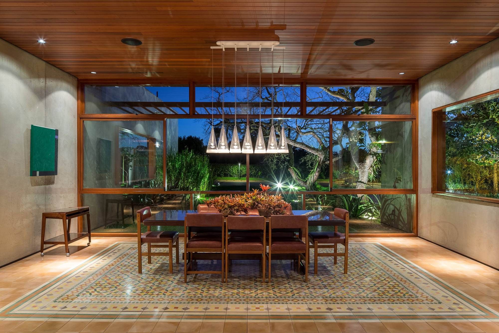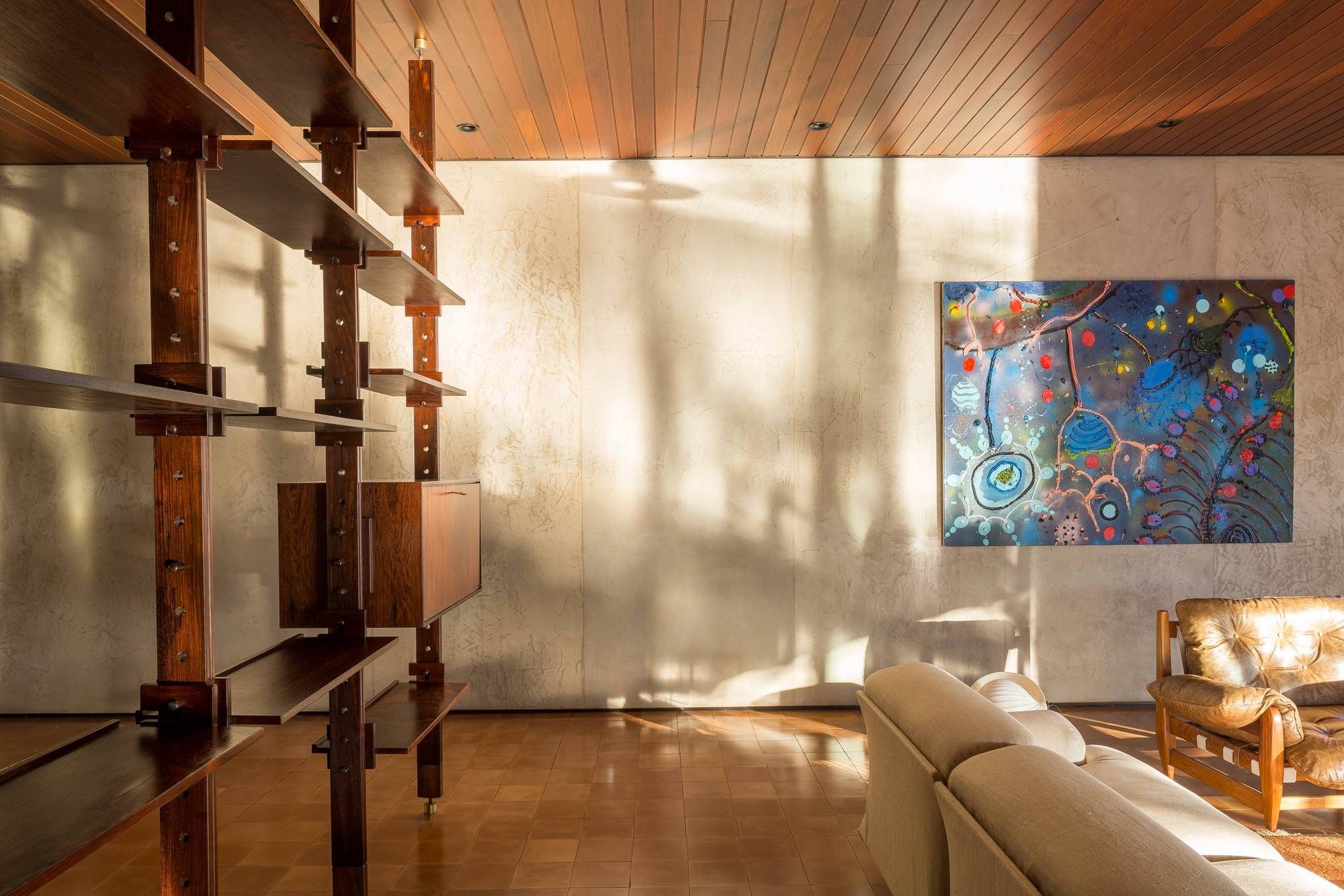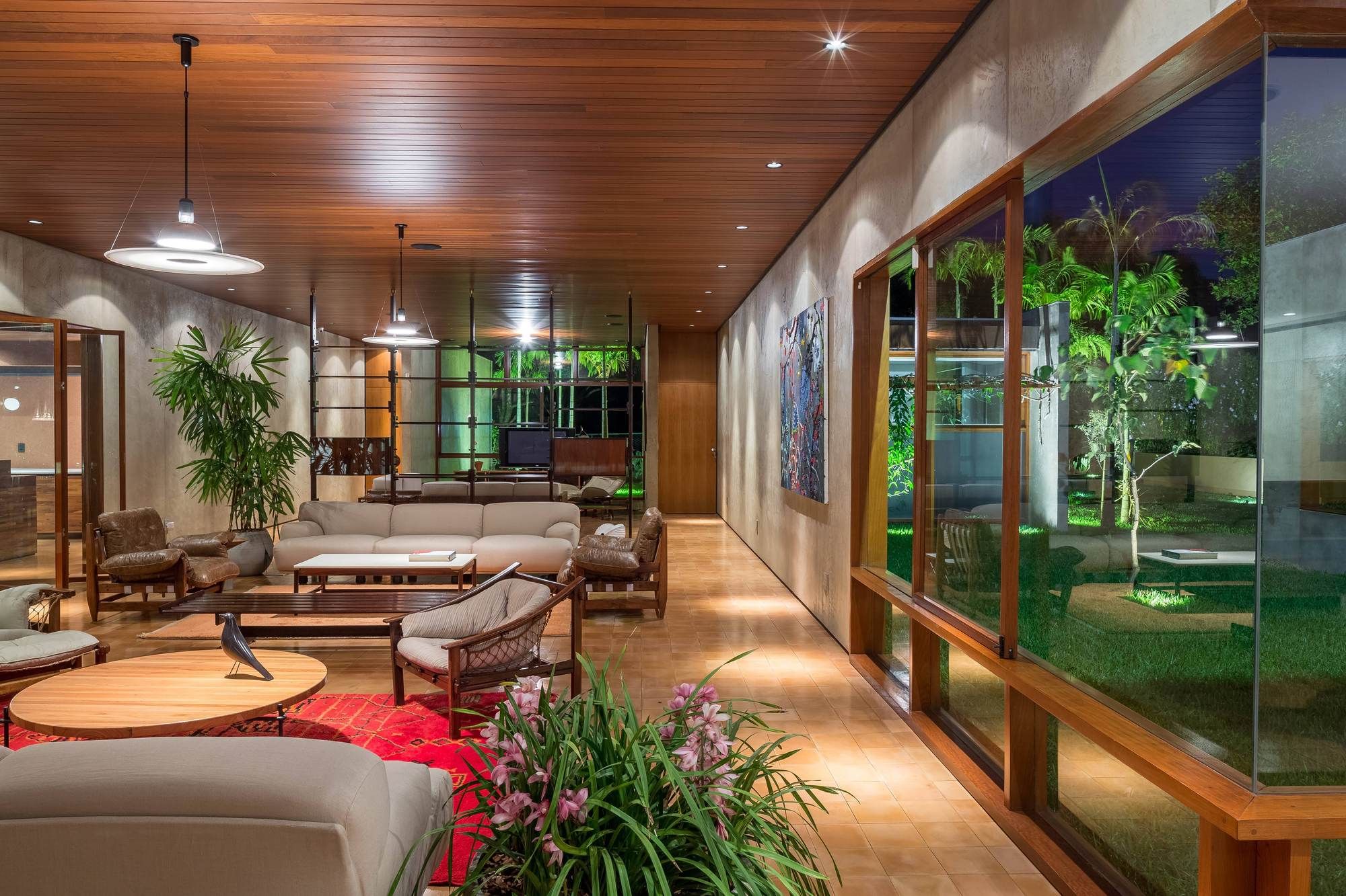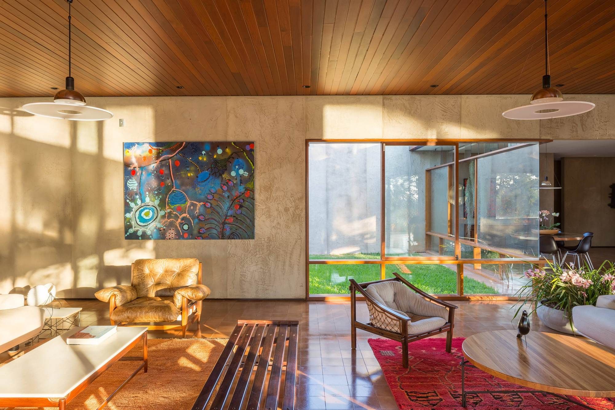 For the interior, a playful and relaxed spirit with pieces designed by the architect Samuel Lamas and masters of Brazilian and international design: Sergio Rodrigues, Jorge Zalszupin, Tenreiro, Jean Gillon, Geraldo de Barros, Lucio Costa, Lina Bo Bardi, Campana brothers, Vico Magistretti, Charles Eames, Antonio Bonet, Pollock and Achile Castiglioni among others. The landscaping is an extension of the Woods with native trees and shrubs masses that flourish throughout the year to attract birds. In the central garden, a native tree Erythrina Mulungu, known as coral tree, will often bring to the Entrance hall, the view of a carpet of red flowers.