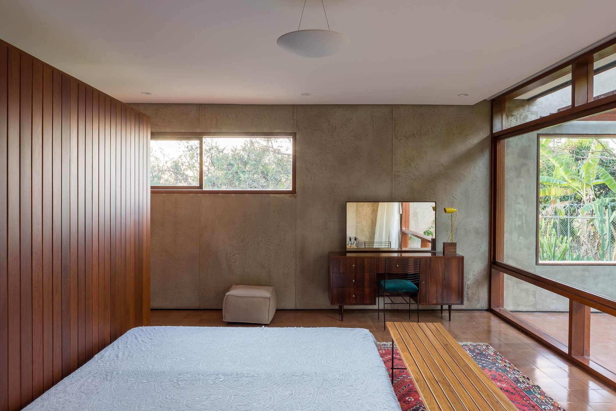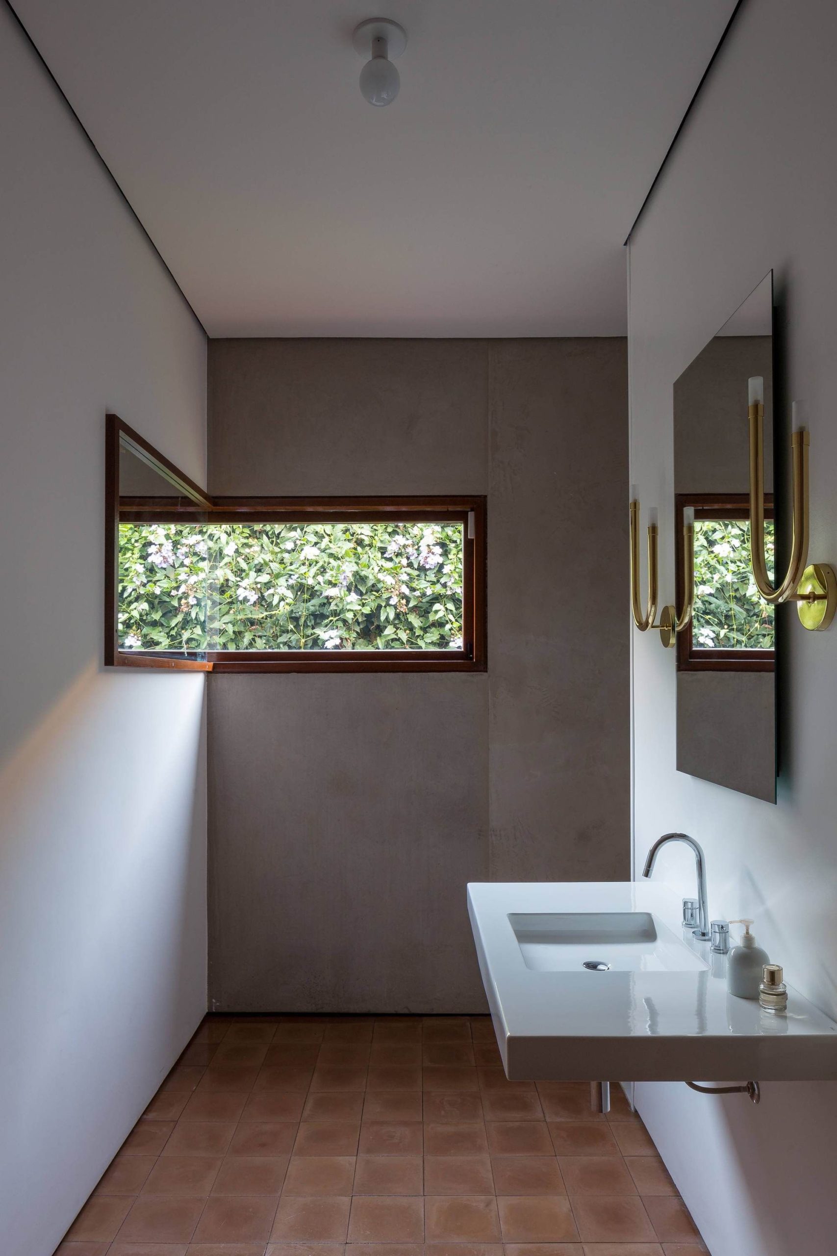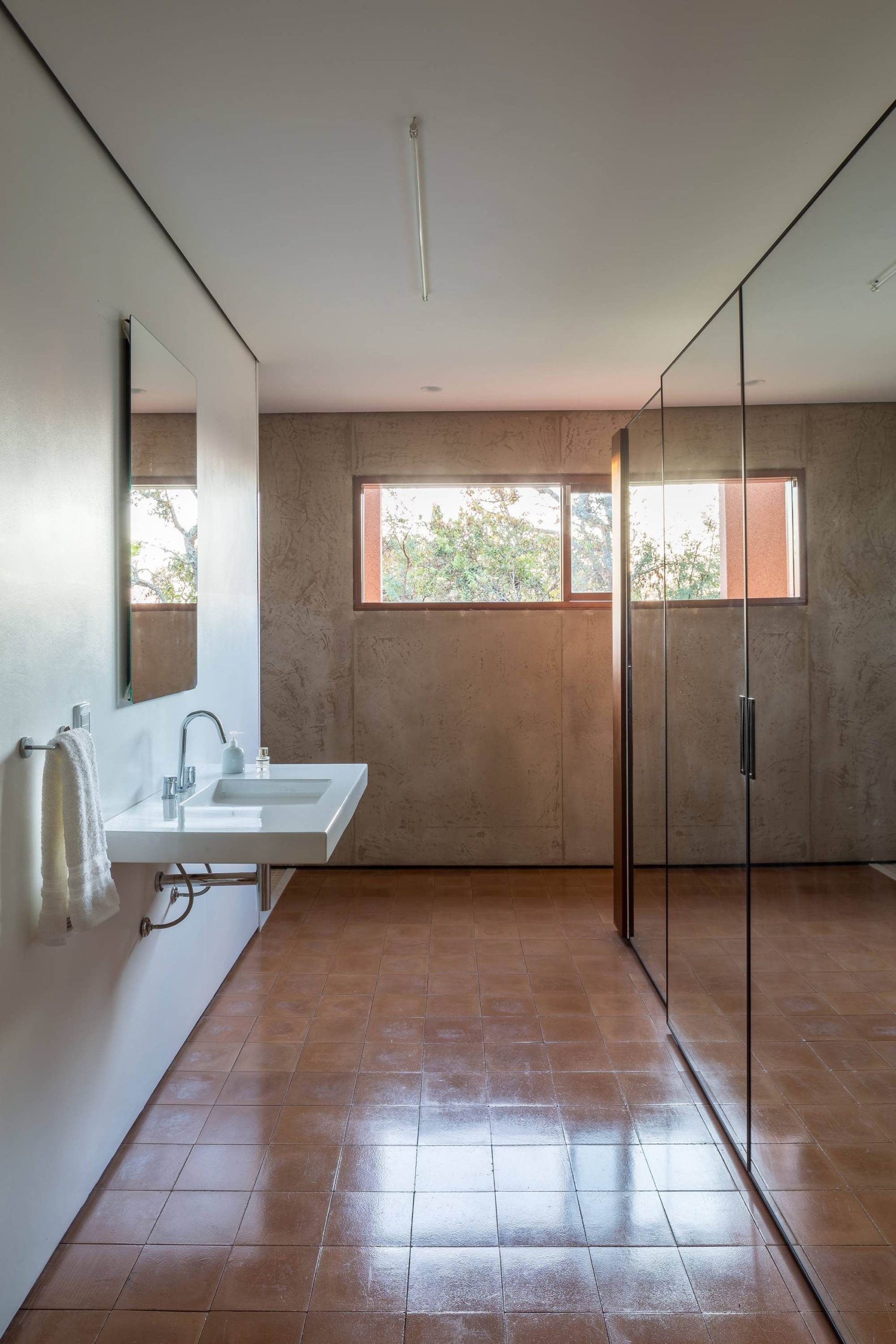 Independent bedrooms facing east ensure privacy for family members. All three suites have a balcony and a metal trellis for climbing plants. The Windows there, when opened, serve as seats either for the bedroom and balcony. The landscape colors continue in the house materials: the tile floor and walls coated fulget has the same color of the reddish earth of Brasilia. The window frames and the lining of Ipe wood, confirm the sense of belonging. The metal roof structure in corten steel also mimic among vegetation.