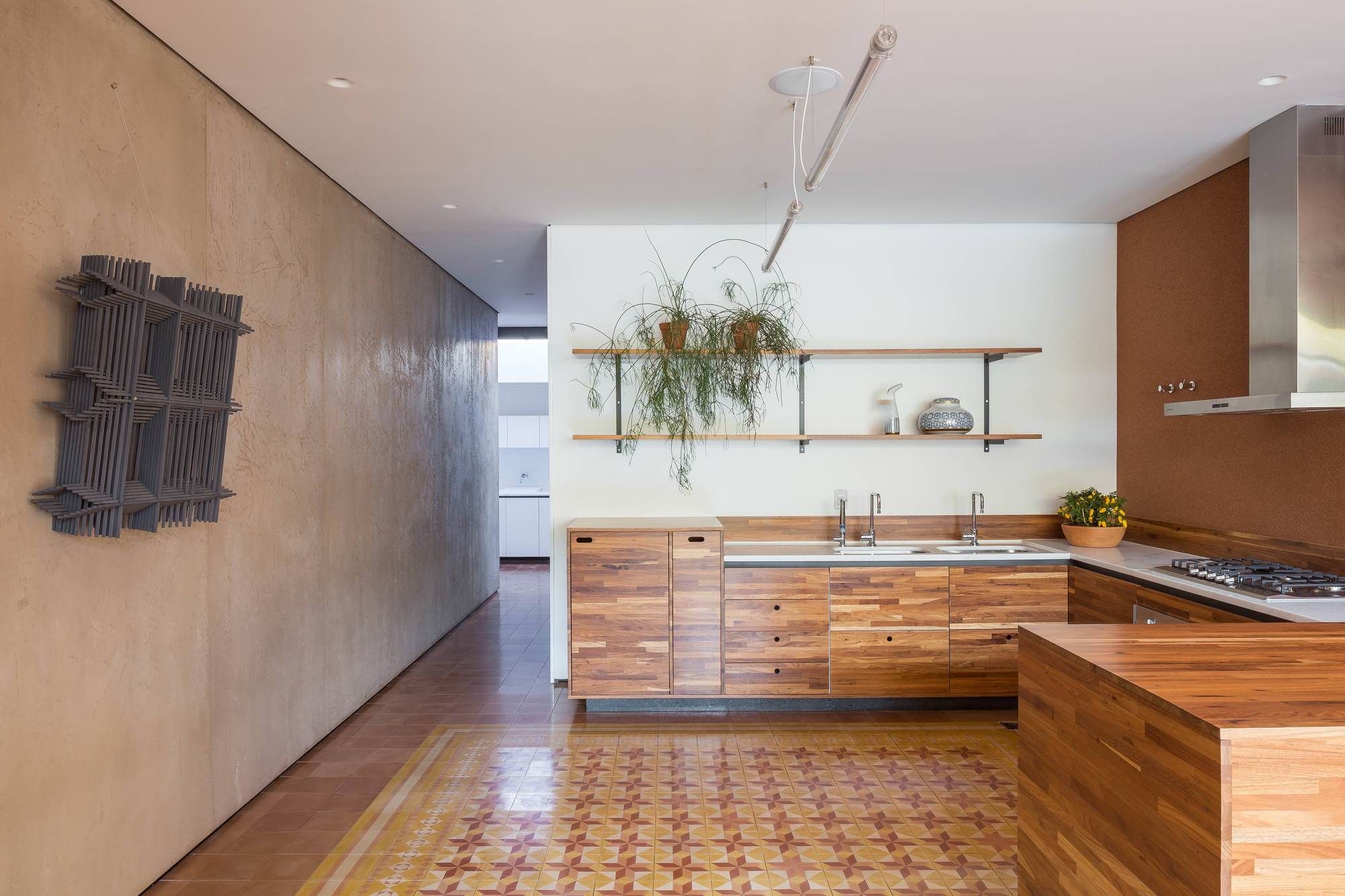 There are three Colored Carpets tiles with geometric designs where the use of traditional woven carpet would be impractical: entrance, kitchen and dining room. Next to the terrace under an old Jatoba tree, there is a rectangular pool coated with white regional marble. It is a conversation pool with a bench along its entire length and flanked by wooden deck.