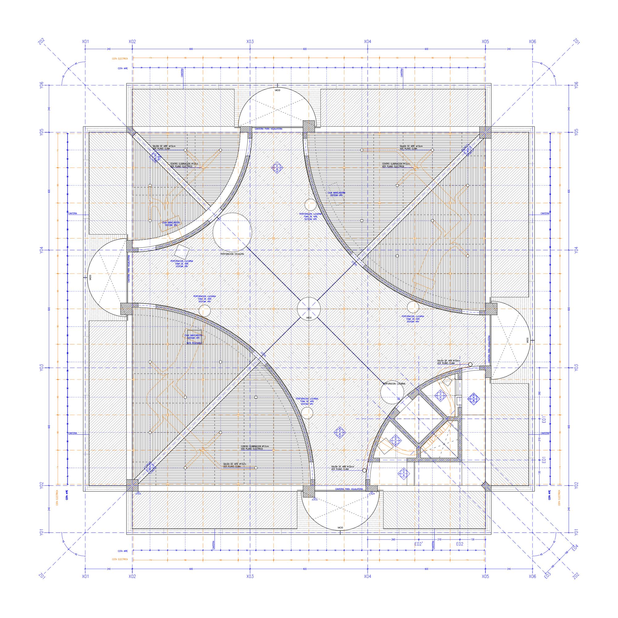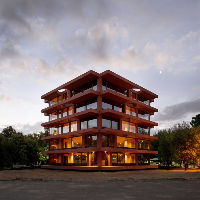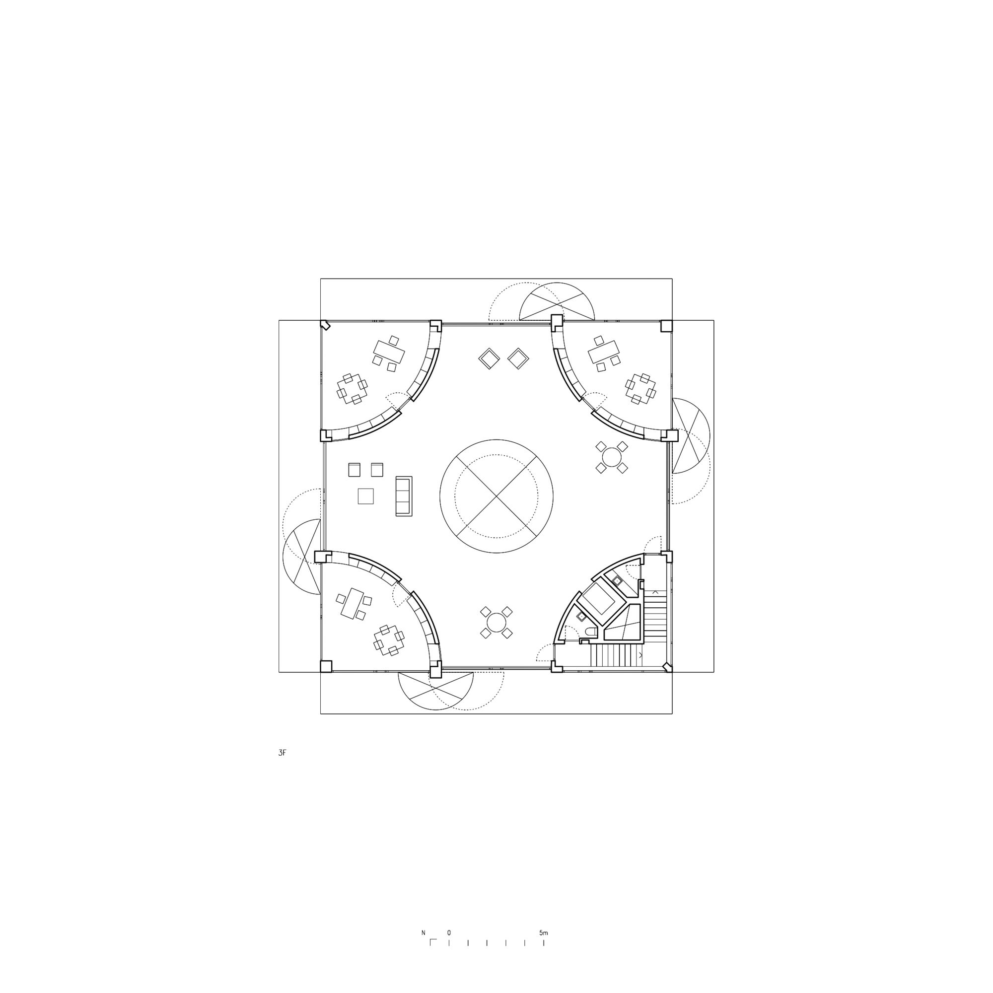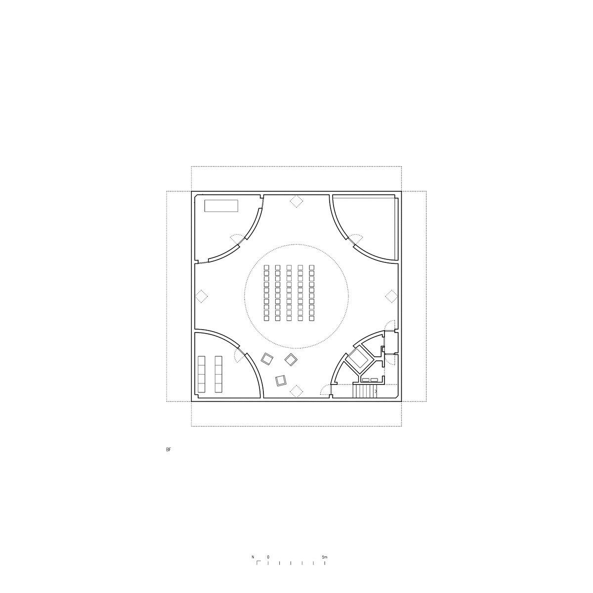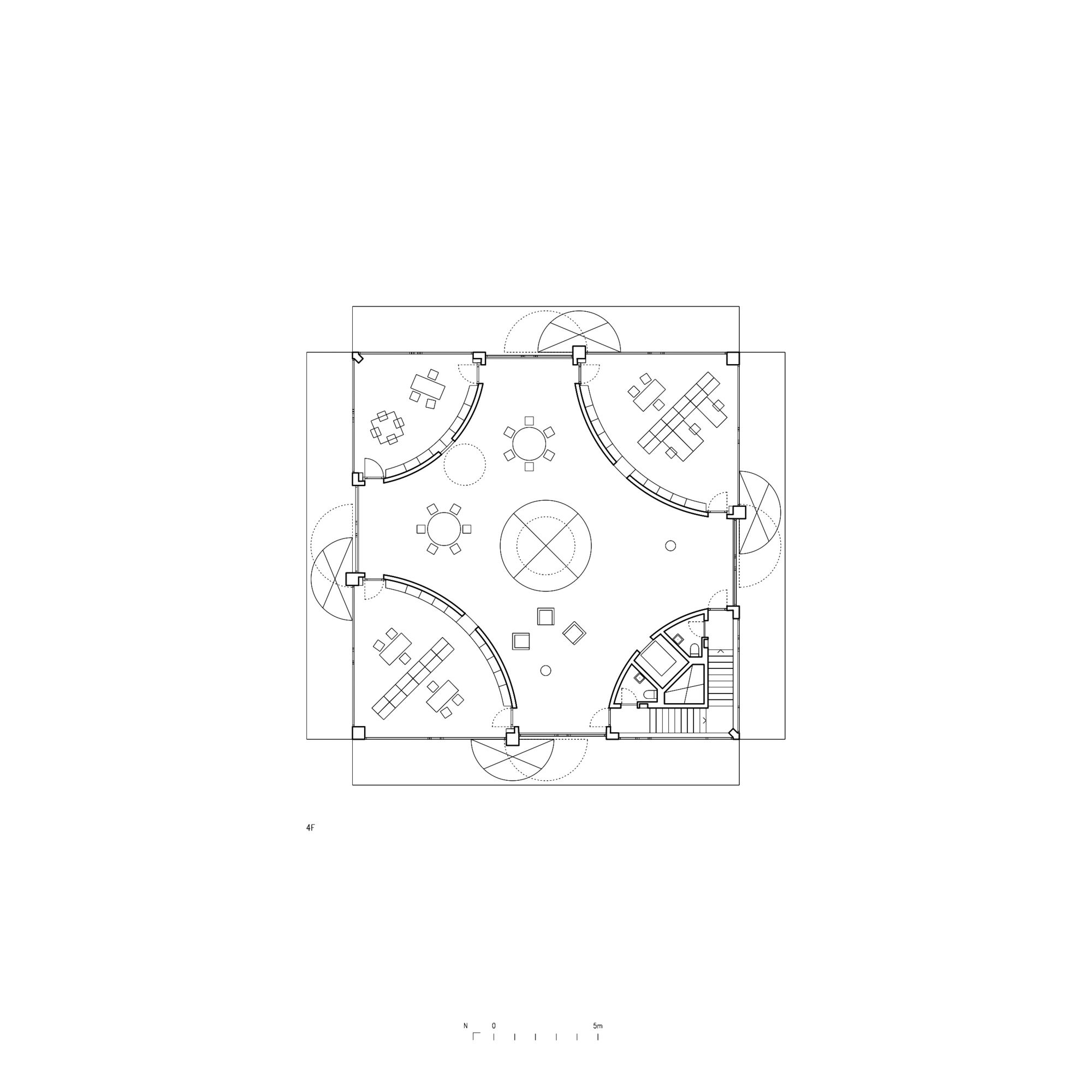 On the other hand, private working spaces occupy the corners of every floor plan, in a quarter of a circle figure which center pivots around every edge, growing inversely proportional to the central voids. Instead of the traditional system of pillars within a nondifferentiated and nonhierarchical grid, this office plan also provides specific rooms for exhibitions, workshops, and meetings, visual and acoustically controlled by the curved walls that work like opaque screens. The character and diversity of the resulting space somehow promotes the dynamics of a non-categorized work (or with ever-changing positions) between professors, students, researchers, entrepreneurs and the local communities.