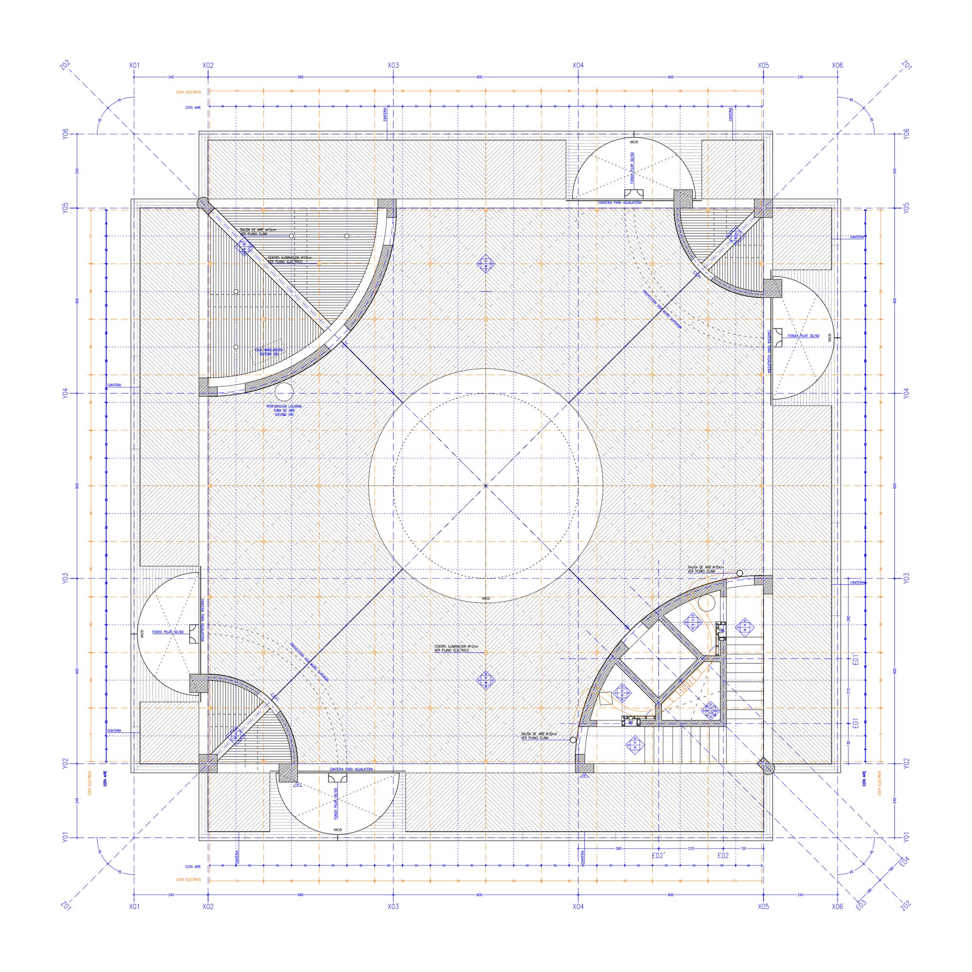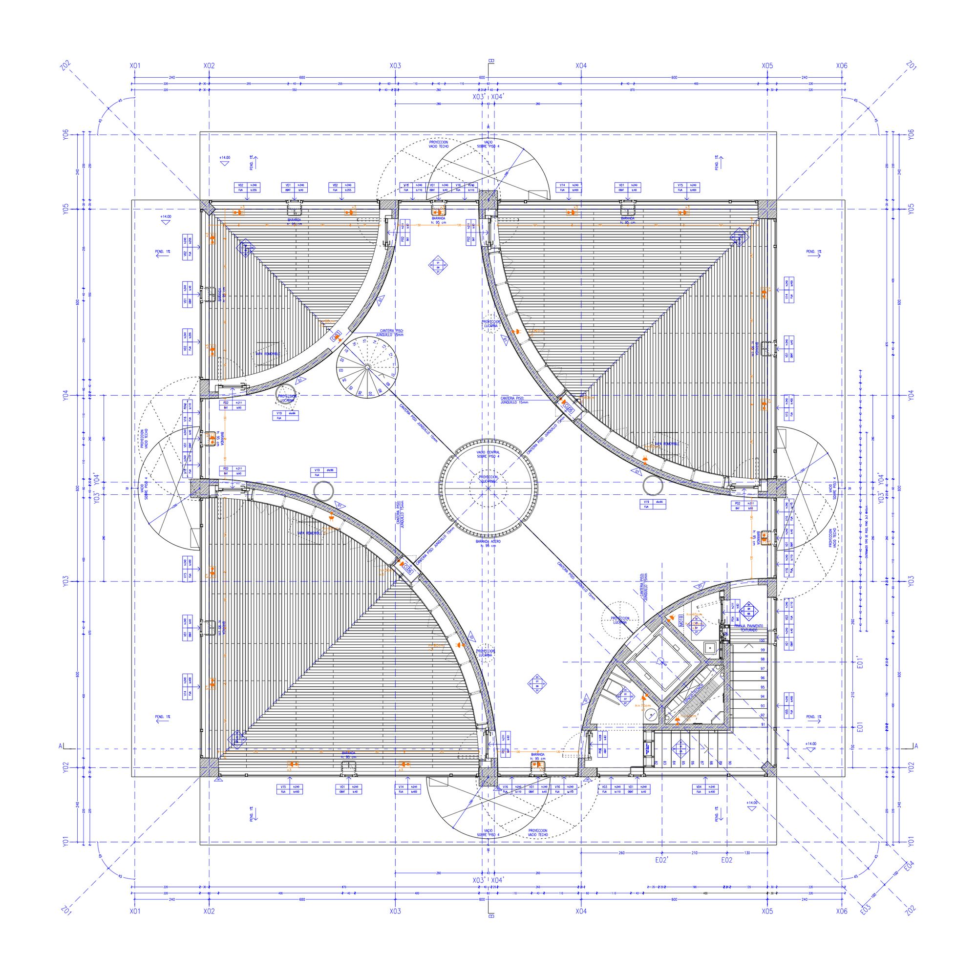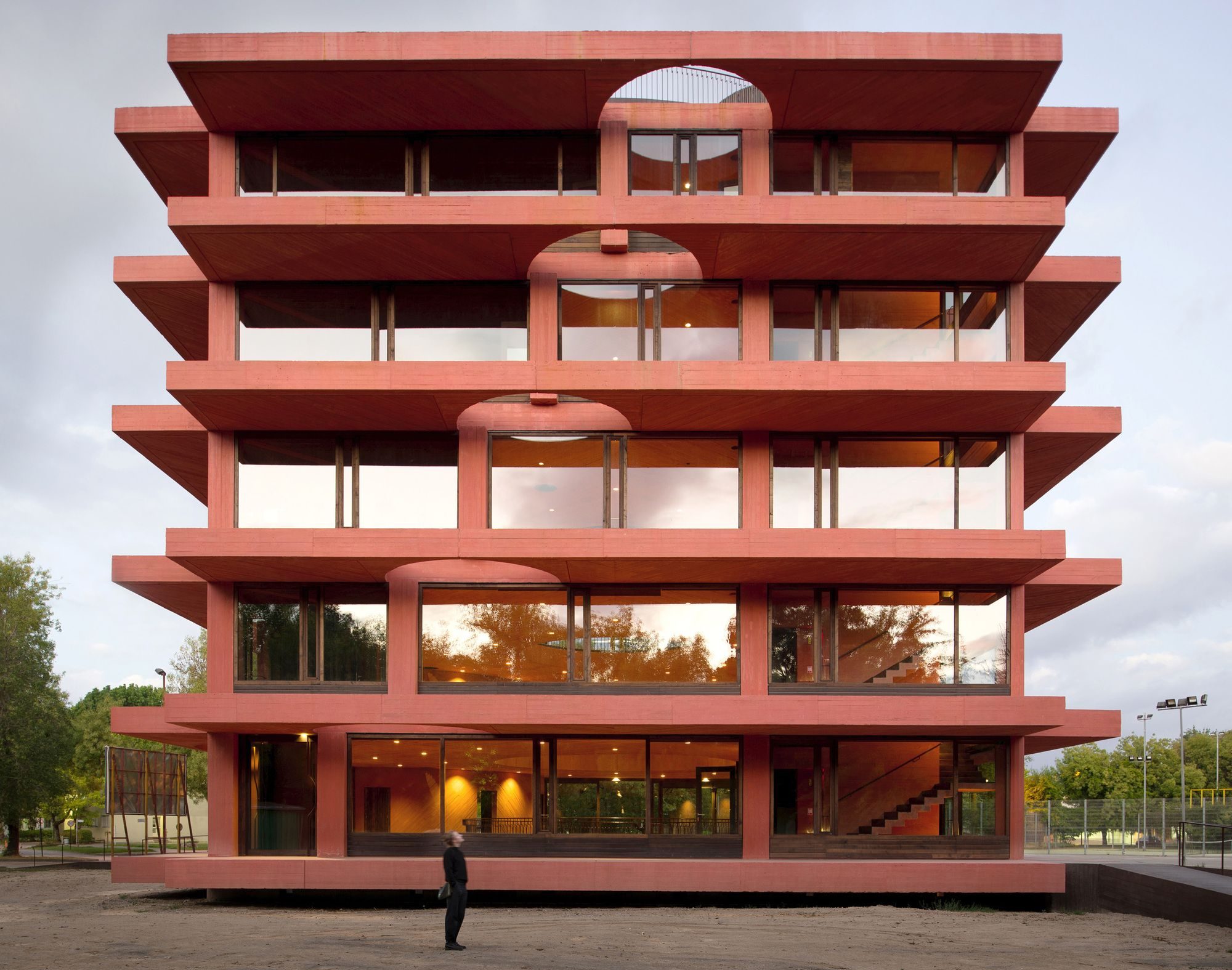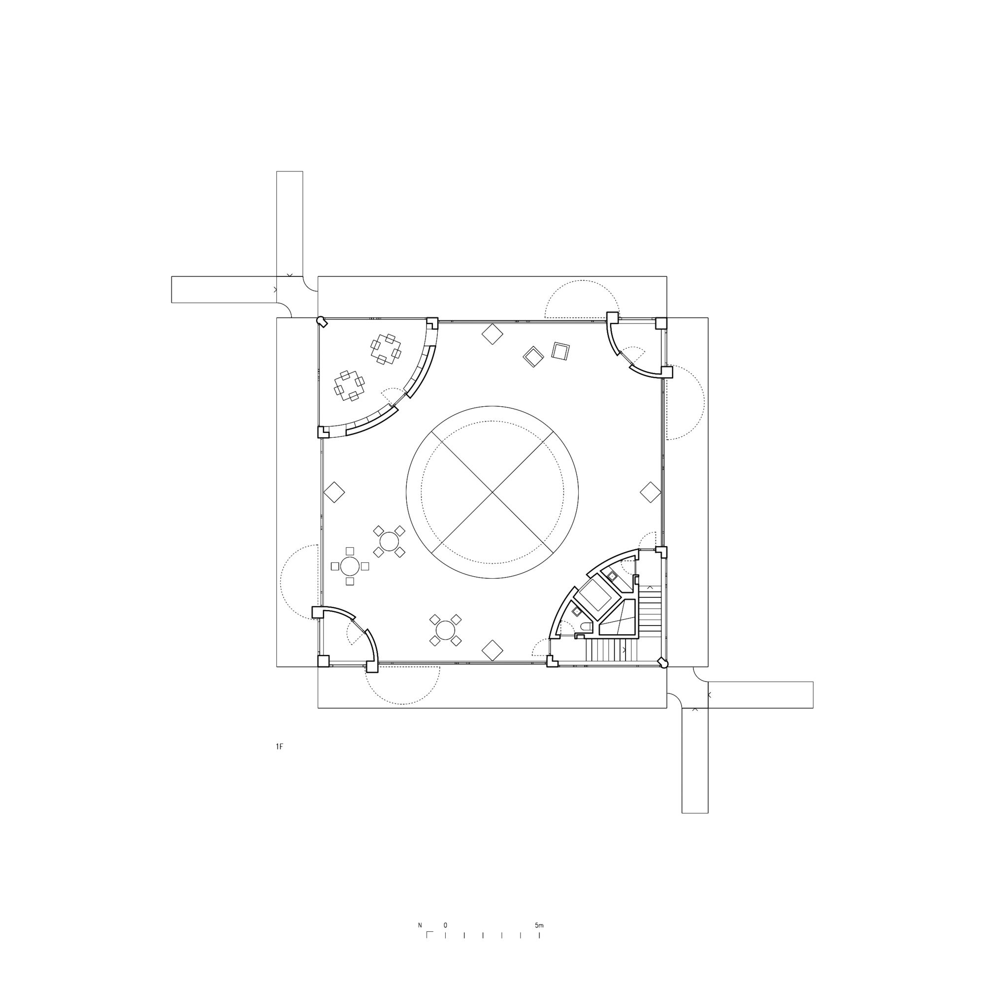 On the other hand, private working spaces occupy the corners of every floor plan, in a quarter of a circle figure which center pivots around every edge, growing inversely proportional to the central voids. Instead of the traditional system of pillars within a nondifferentiated and nonhierarchical grid, this office plan also provides specific rooms for exhibitions, workshops, and meetings, visual and acoustically controlled by the curved walls that work like opaque screens. The character and diversity of the resulting space somehow promotes the dynamics of a non-categorized work (or with ever-changing positions) between professors, students, researchers, entrepreneurs and the local communities.