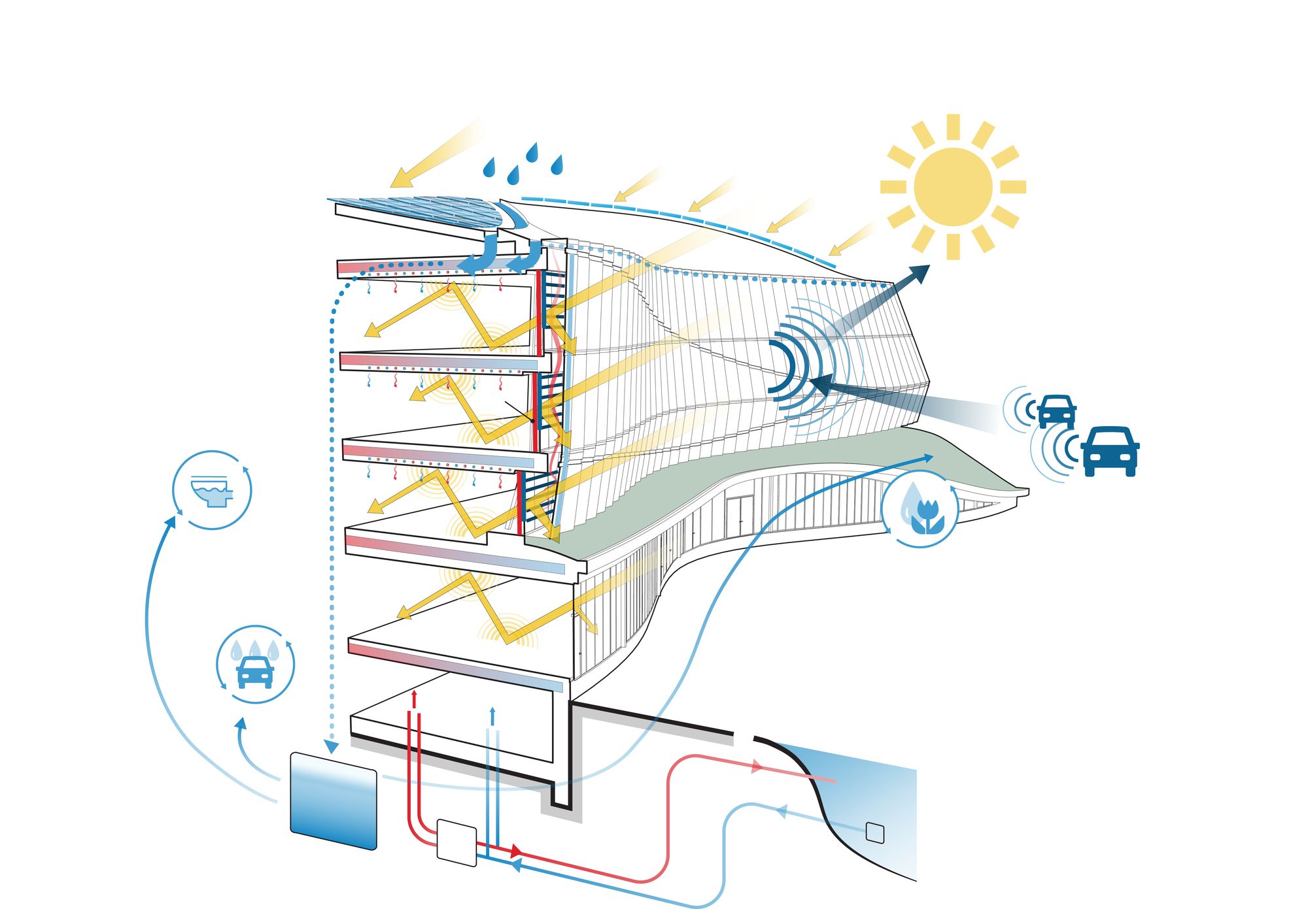 4) The sustainable solutions. Lake-water pumping, photovoltaic panels, sunlight optimization, these are all elements incorporated into the structure.