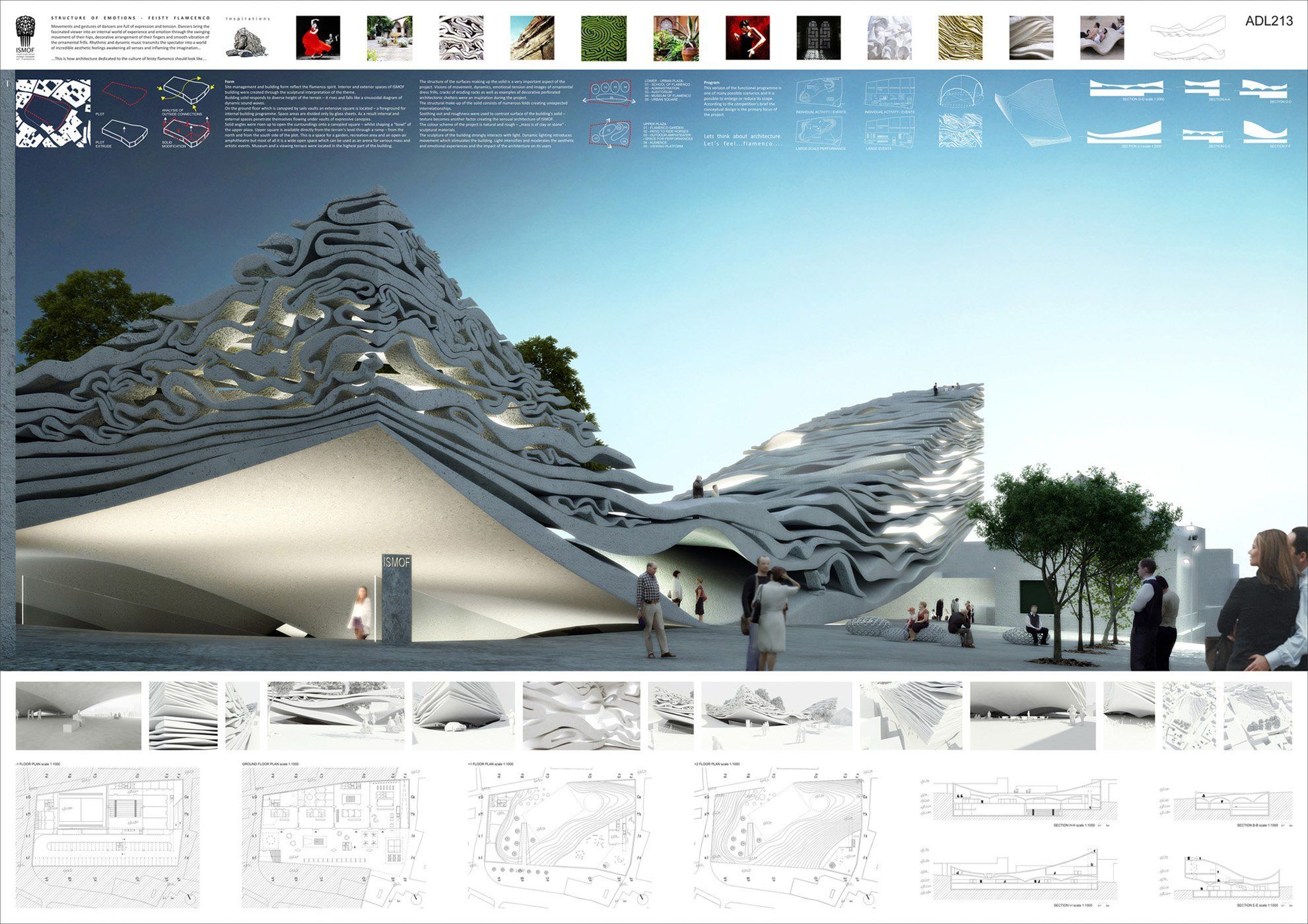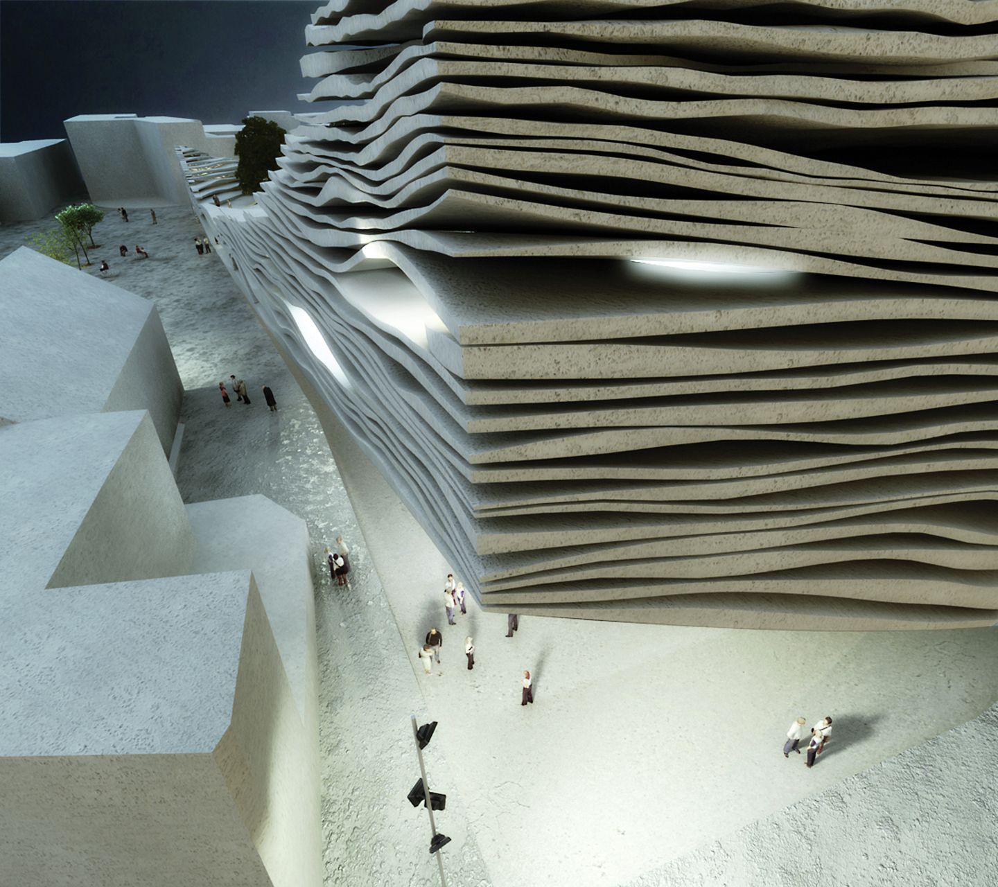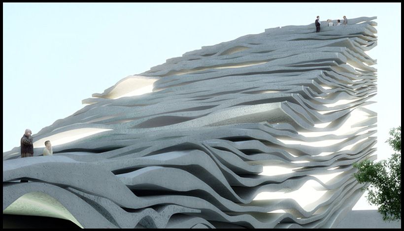 The design for the International School/Museum of Flamenco proposed by MUS Architects is, in their words ‘how architecture dedicated to the culture of feisty flamenco should look’. And I agree with the imperative. Let me just note that I am not at all sure how it would work. But I agree that it does pretty well embody the spirit of flamenco as described above. The construct is also derived in part from an analysis of connections to its surroundings. The building form pulls up at the points where these paths of movement intersect the volume. In this way the building becomes its own topography, mapping an internal energy. This topography is translated into an incredibly optimistic concrete facade. The optimism primarily rests on engineering the formwork and finding a contractor to take on the job. It might, however, be a job for Ductal® or a similar fiber-based concrete…
