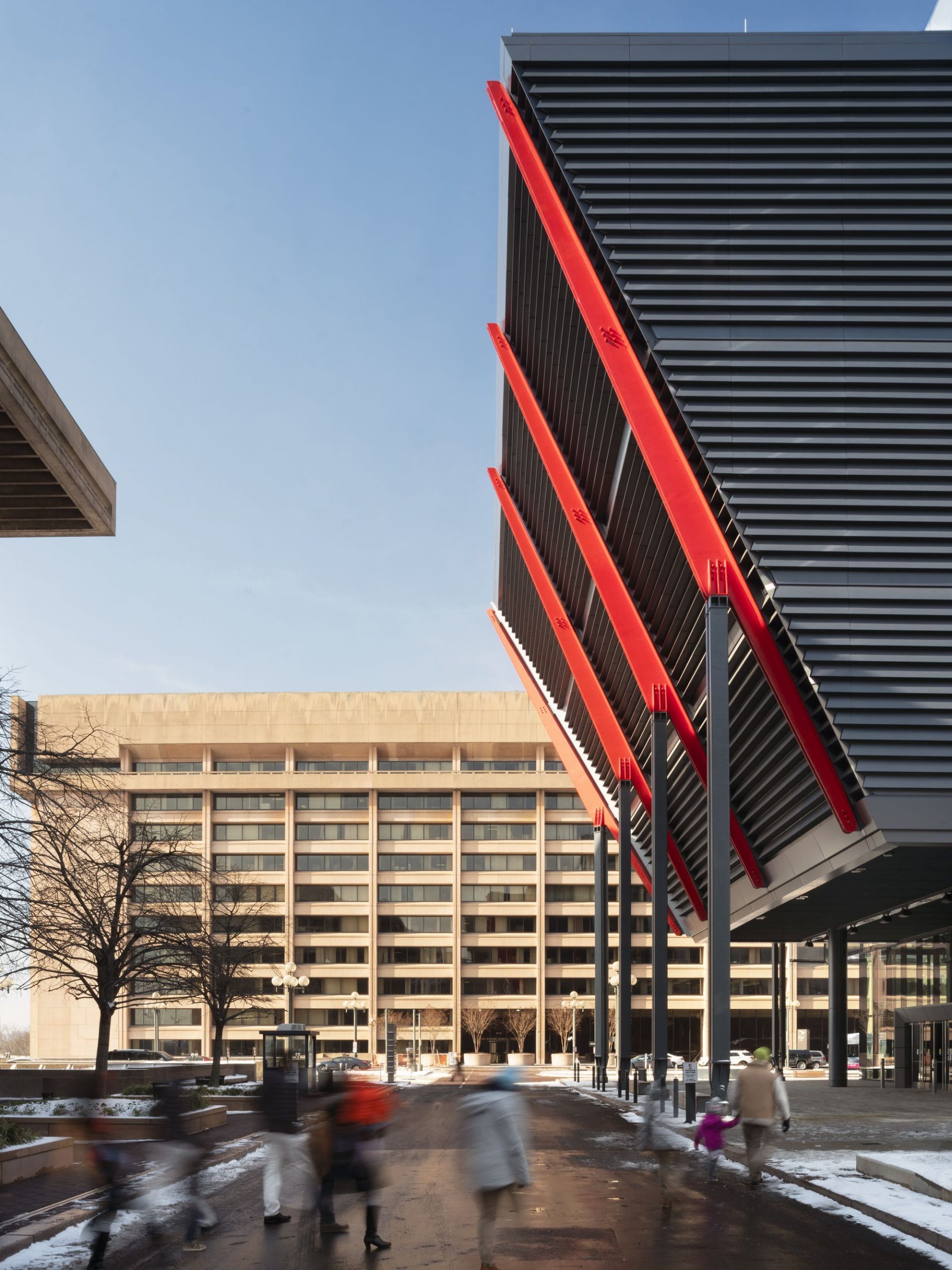 With its large and slender, structural-steel beams extending upward from the site on L’Enfant Plaza in a predominantly concrete area of Washington, D.C., this type of architecturally expressed structural steel is unlike any other in the district. The glass veil on the west facade protrudes from the building like a shining jewel, enticing people up toward it from 10th Street.