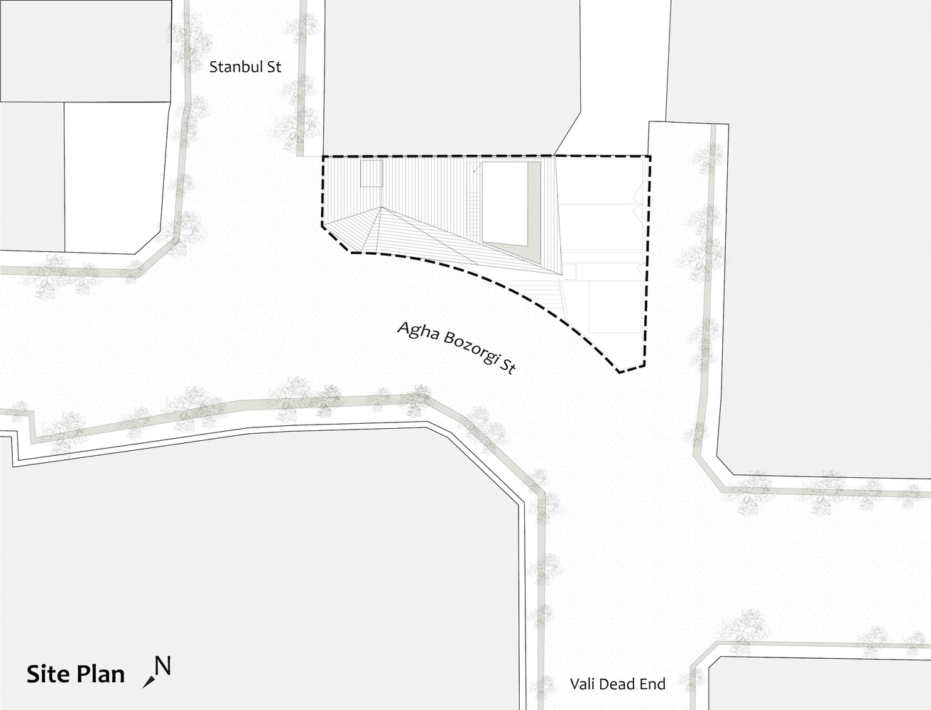 Upon the initial encounter with the Karafarin Bank’s site, the distinctive dimensions of this relatively compact piece of land immediately captured the design team’s attention. The unconventional layout, coupled with the lingering remnants of an ancient structure, which included the faint outline of a former villa and an accompanying ramp, served as the last vestiges of its history. These enduring imprints on the walls resembled a chalk outline akin to those seen at a crime scene, preserving the final trace of the subject’s existence. These clues indicated this villa was among the last survivors of its architectural lineage within the Shemiran region.