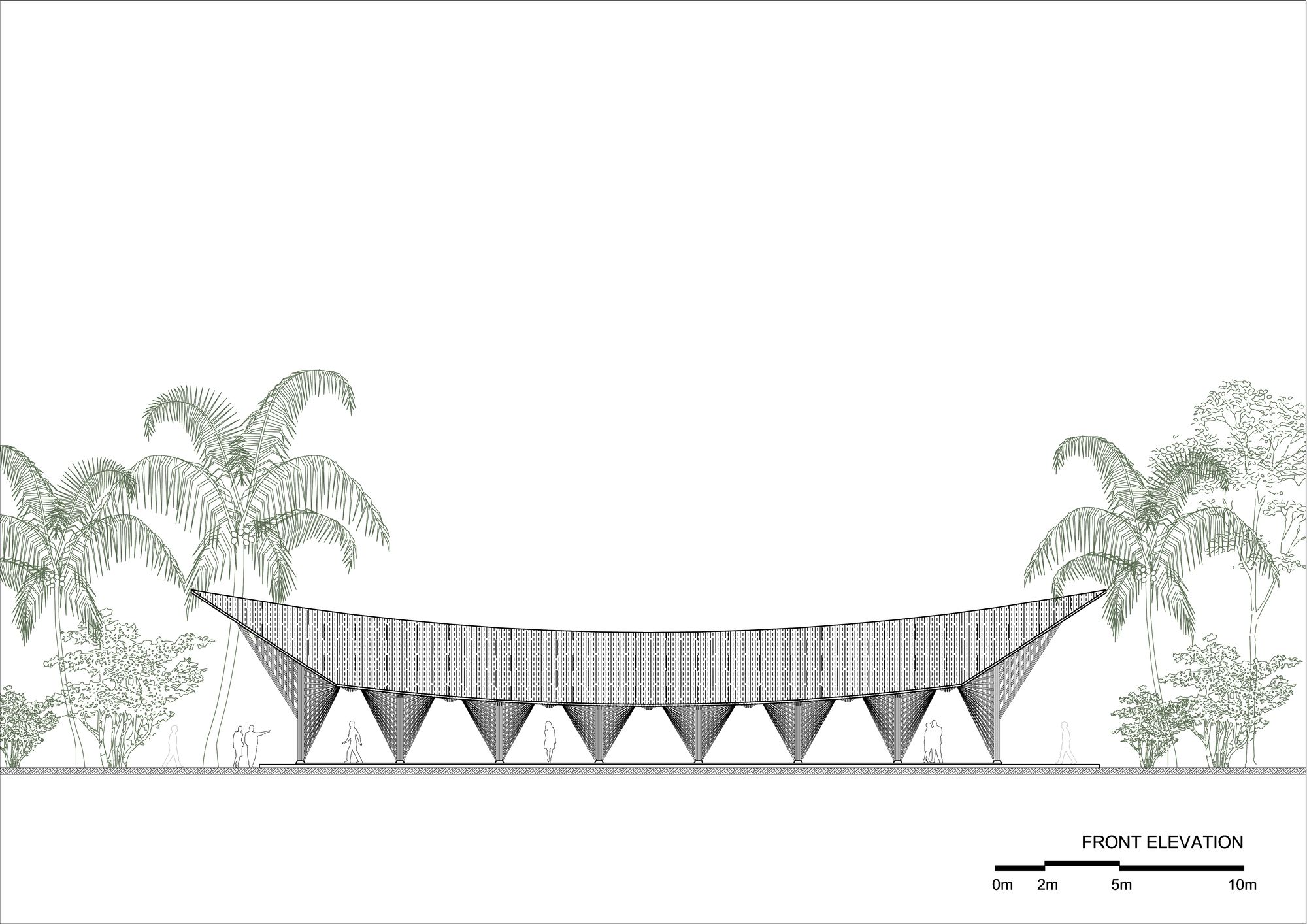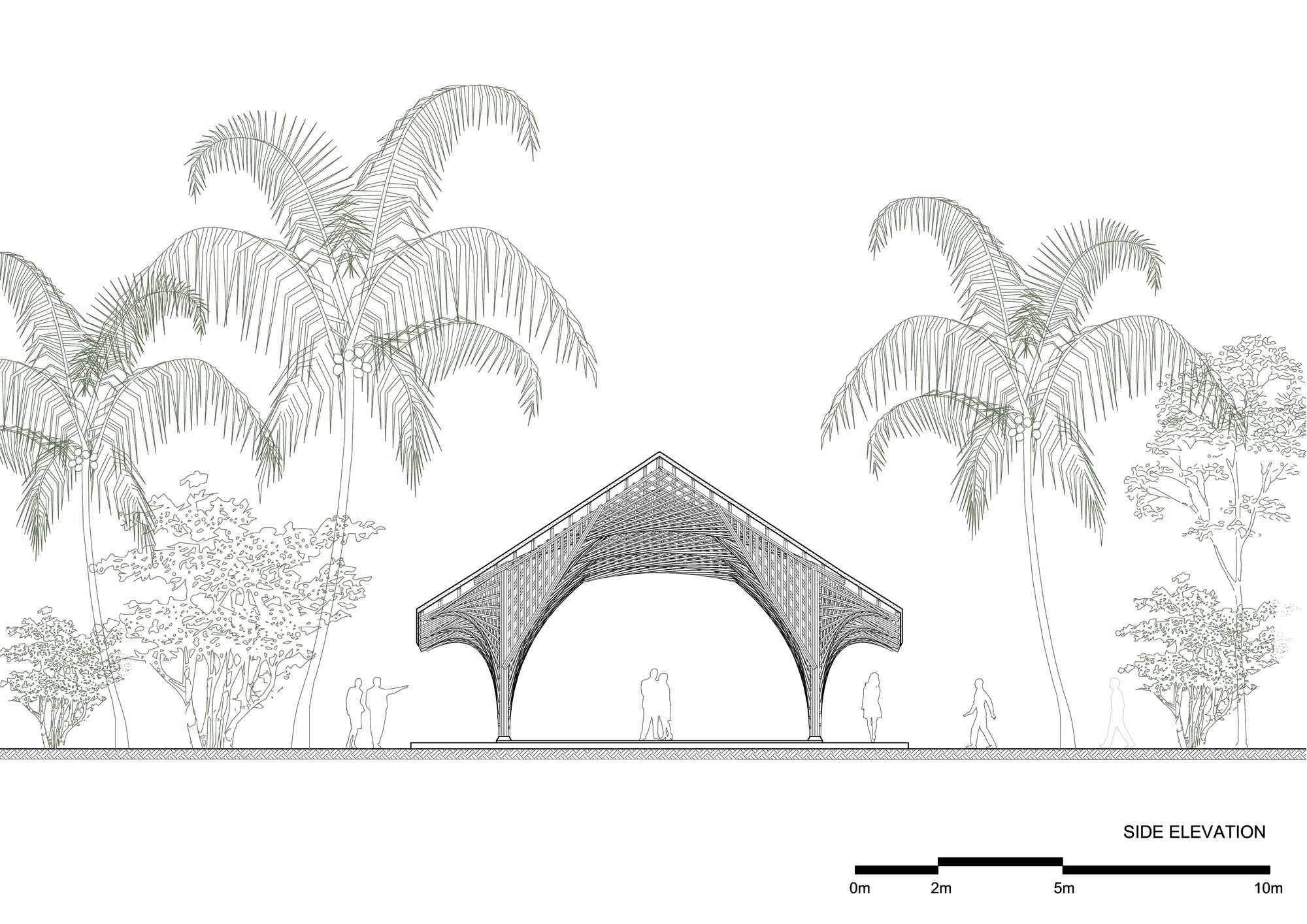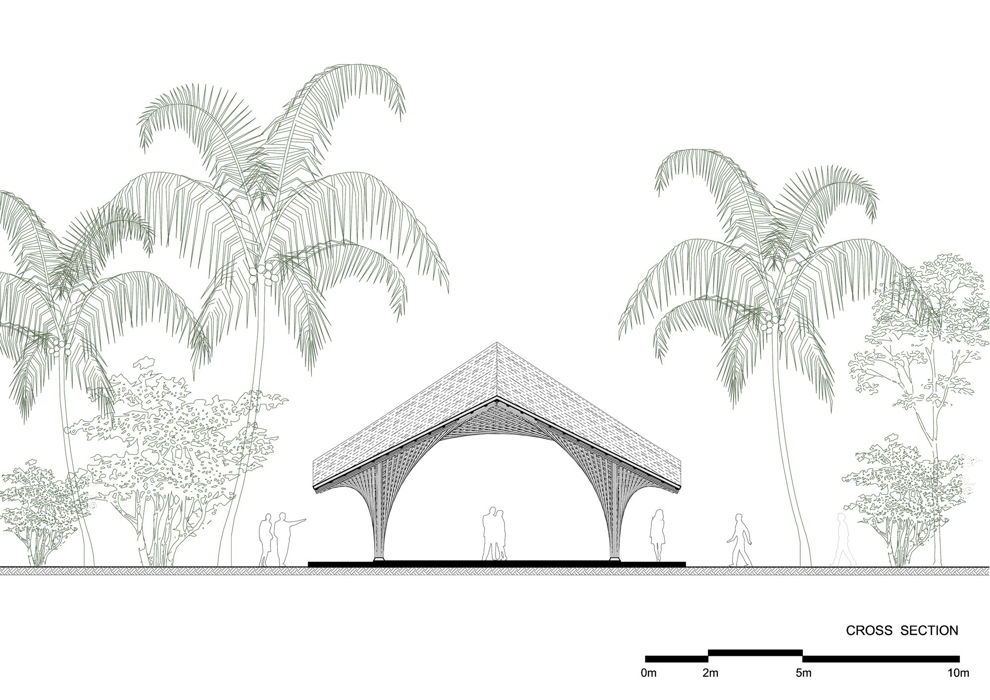 The bamboo hall features numerous hypars that serve as both ceilings and columns. These hypars are interconnected and interlocked, allowing the overhanging roof to extend to 4 meters at the gable roof. A hypar is a surface that is doubly curved and doubly ruled, which makes it easy to construct using straight structural members. Utilizing bamboo poles to build hypar structures is an ideal match since it allows for creating curved surfaces using straight bamboo poles, resulting in exceptional stiffness and an attractive form without the need for bamboo bending.