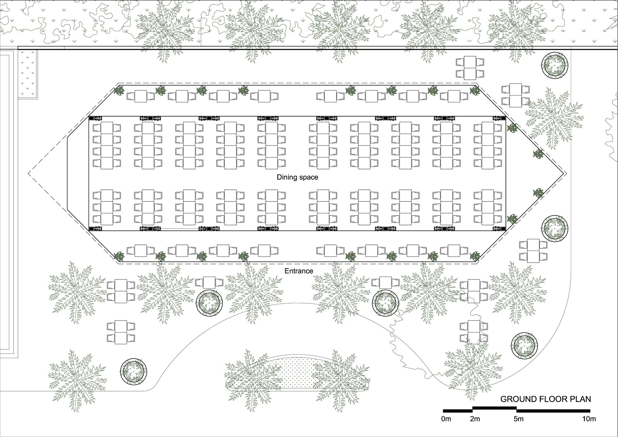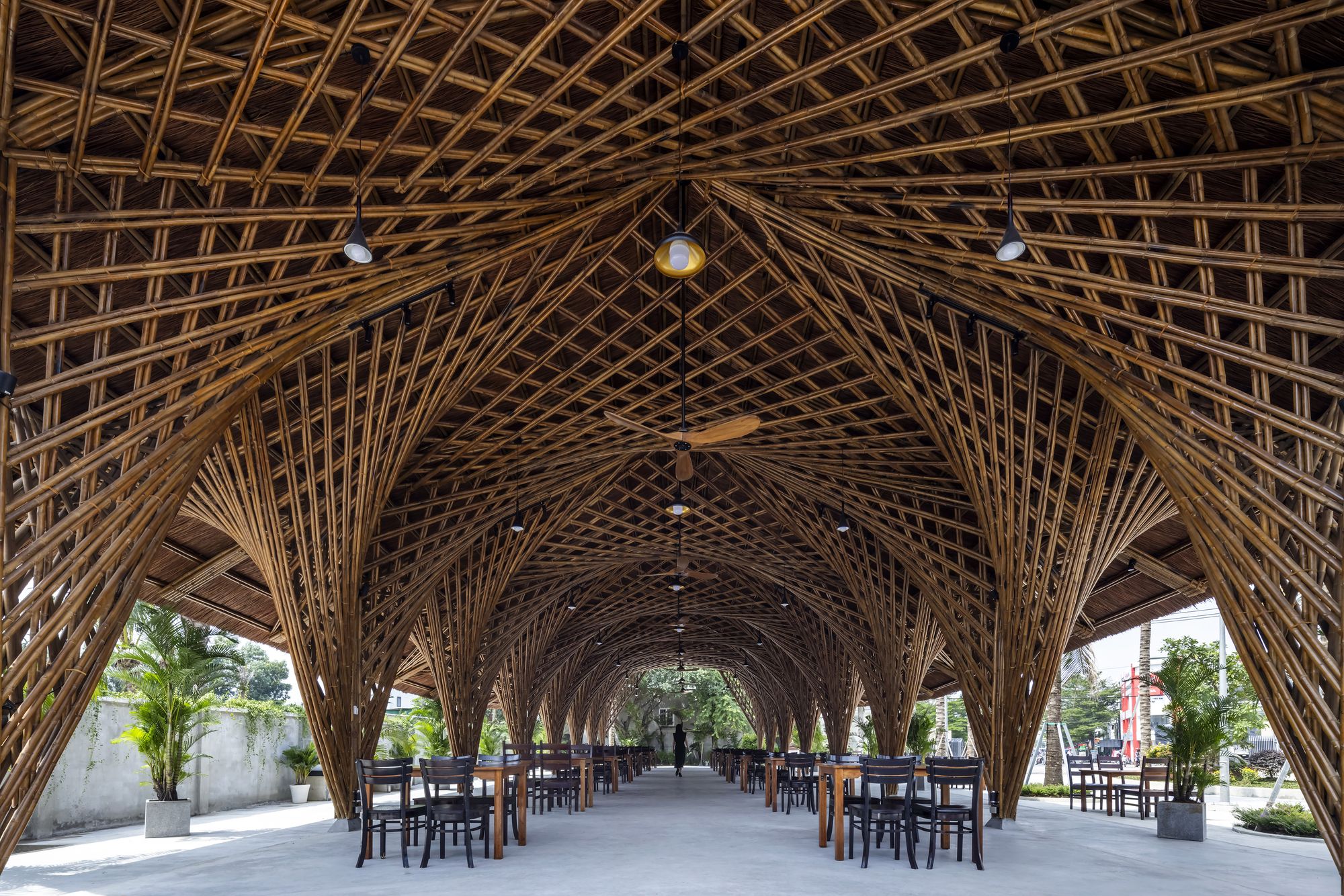 The ground floor layout of the bamboo hall is simple, with a maximum capacity of 180 guests. It is strategically located for easy access and seamless connection to the adjoining house. The Keeng Seafood Restaurant owner assigned the architects to create a unique and recognizable architectural design for the complex. The focus was on using environmentally friendly materials, and the construction process was expected to be quick.