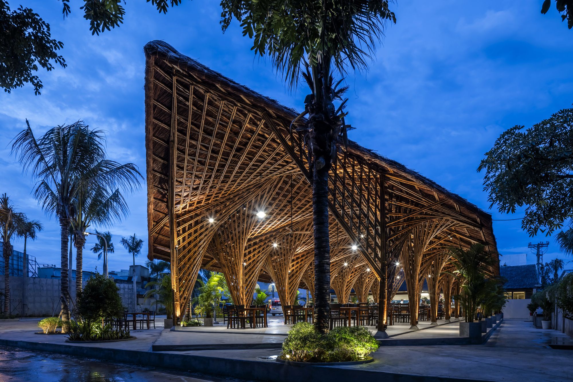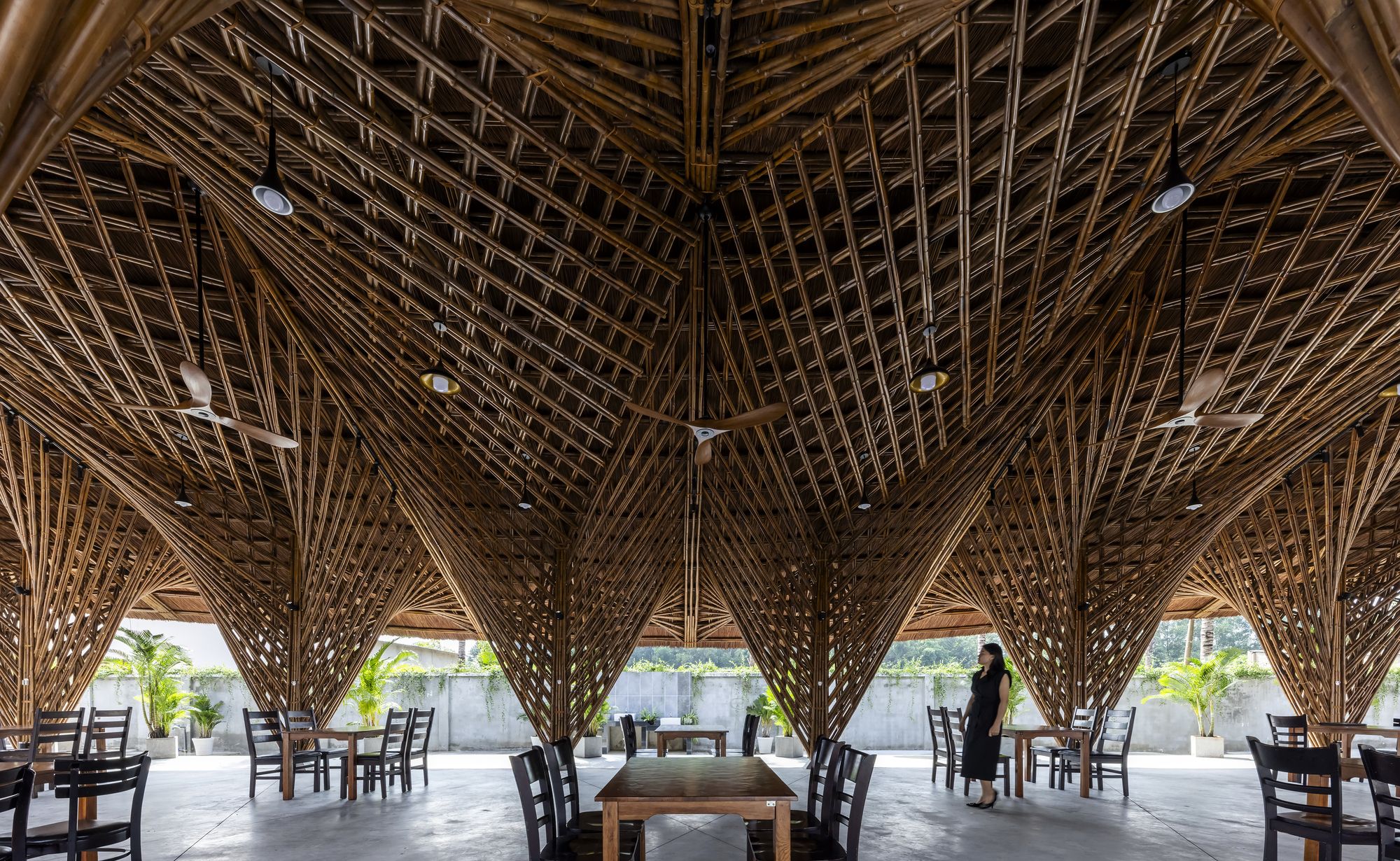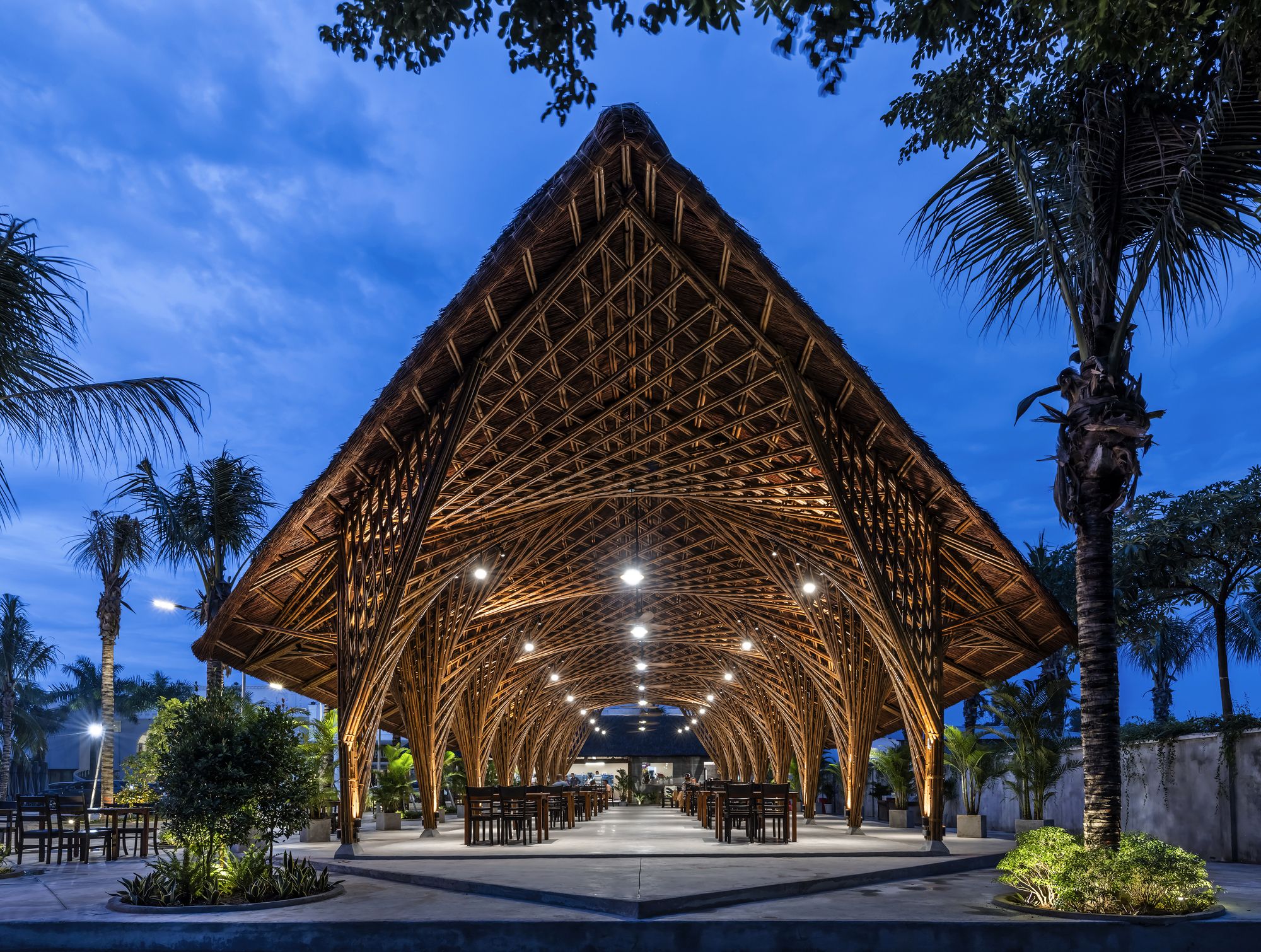Despite the many benefits of hypar structures, they present a challenge when using natural thatch for roofing due to their double curvature. The convex form along one axis and concave shape along the other make achieving a uniform roofing surface difficult. A truss and purlin system is introduced on the concave side to overcome this challenge to create simple sloped roofs. This innovative approach results in a two-layer structural roof that improves the aesthetic appeal of the ceiling. The use of bamboo in this structure is presented dramatically, showcasing the immense potential of both bamboo and hypar structures.The Keeng Seafood Restaurant exemplifies the efficiency and sustainability that can be achieved through innovative construction practices.