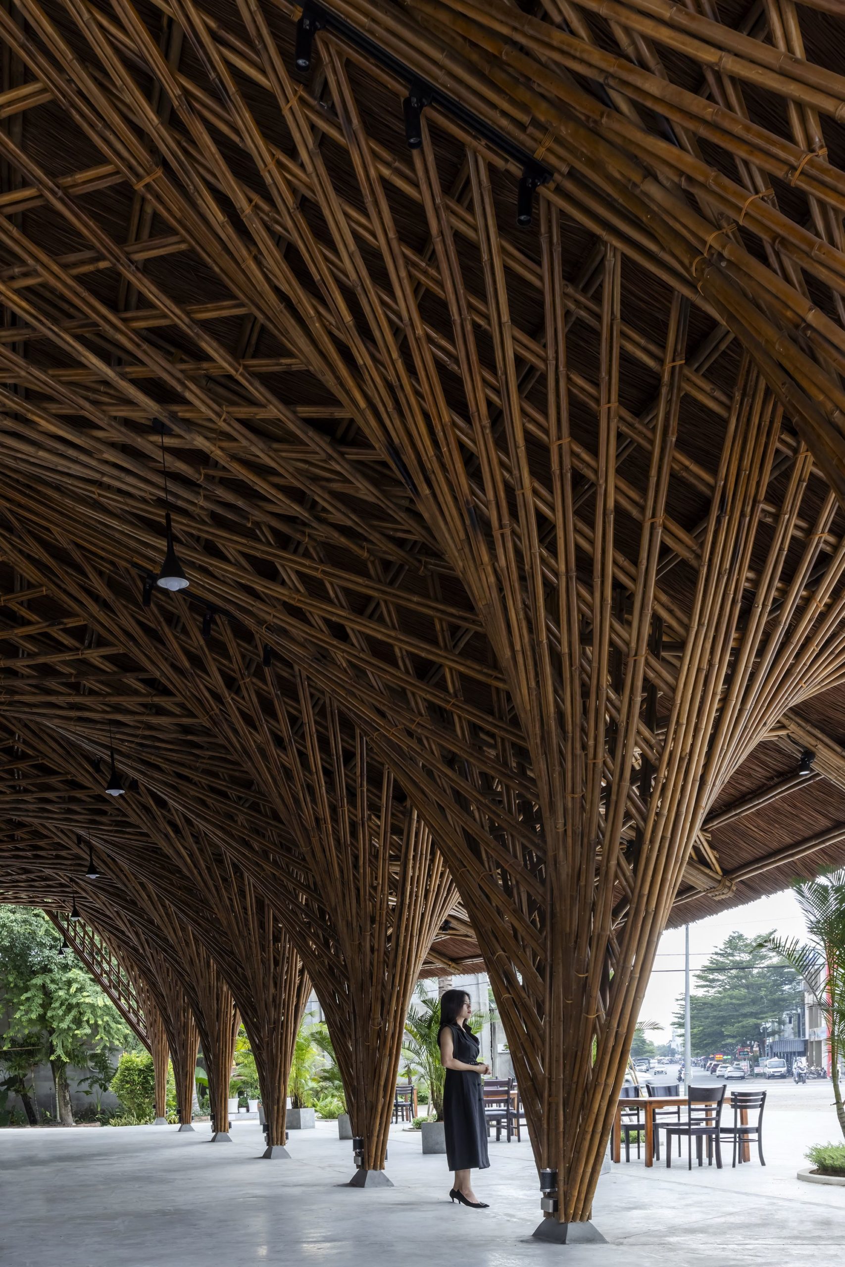 To meet the necessary criteria, both the structural and decorative elements incorporate bamboo, specifically the “solid bamboo” species, also known as “iron bamboo” in southern Vietnam. This species is popular due to its robust nature, making it highly suitable for construction. Traditionally, bamboo poles are utilized as posts, beams, or trusses, although there are certain limitations on span column steps. After exploring several structural options, a hyperbolic paraboloid (hypars) surface is employed due to its exceptional stiffness and aesthetic appeal. Hypar surfaces, with their curved shape and robust resistance in all directions, can efficiently bear significant loads, making them a common choice for roof structures.