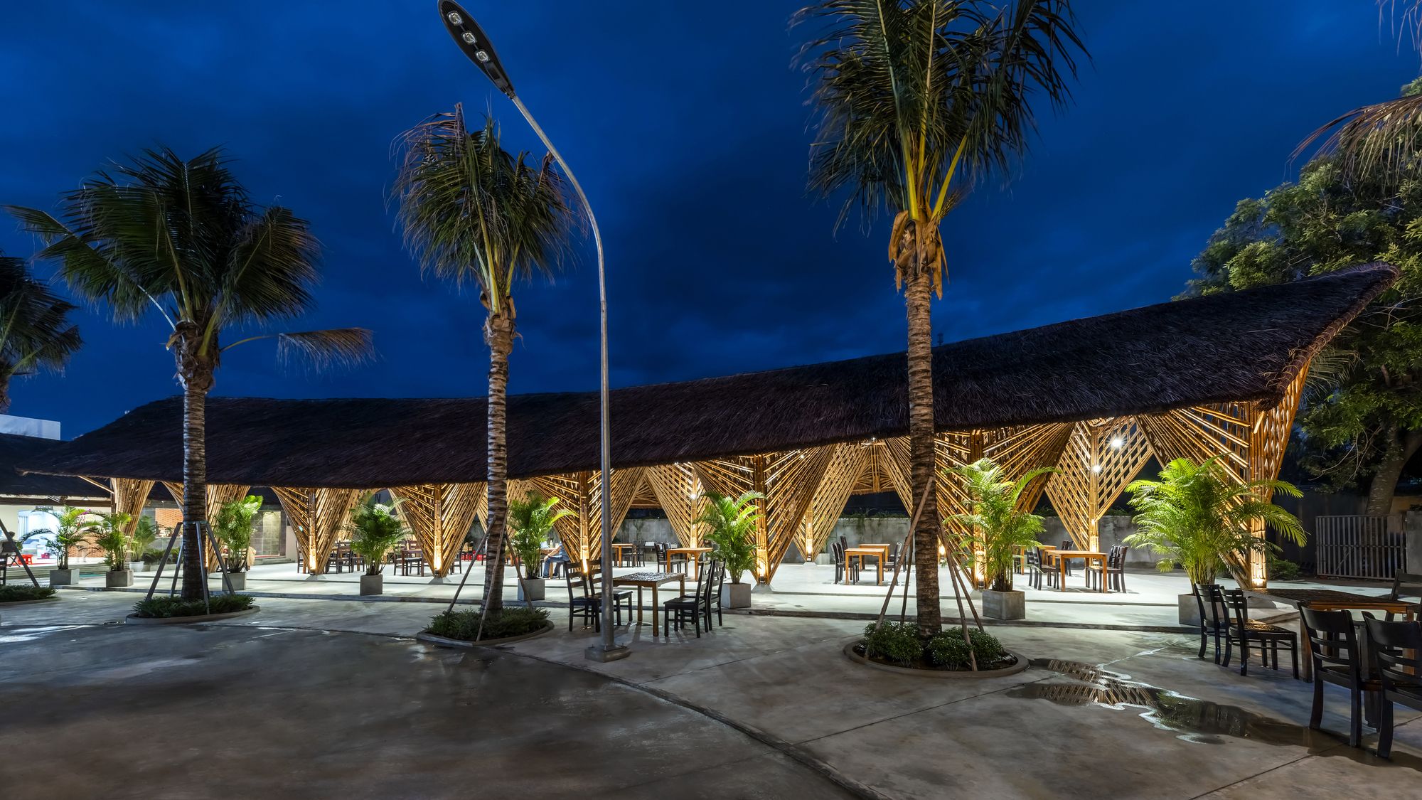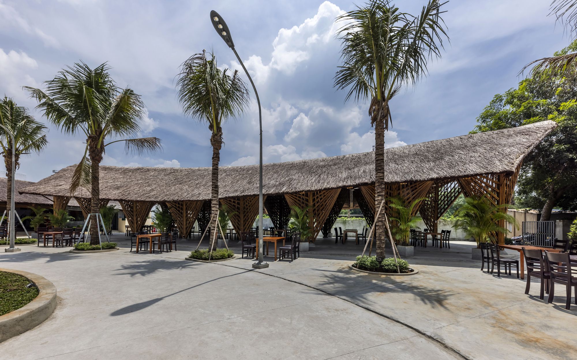 Located in the heart of Long Thanh, a bustling town in southern Vietnam that is experiencing rapid growth due to a significant international airport project, the Keeng Seafood Restaurant complex offers conference halls, private dining rooms, a kitchen, a restroom, and a bamboo hall. The bamboo hall is unique and stands out with its gently curved boat-shaped thatched roof, supported by bamboo structures that resemble nipa palms, a common riverside plant in southern Vietnam.