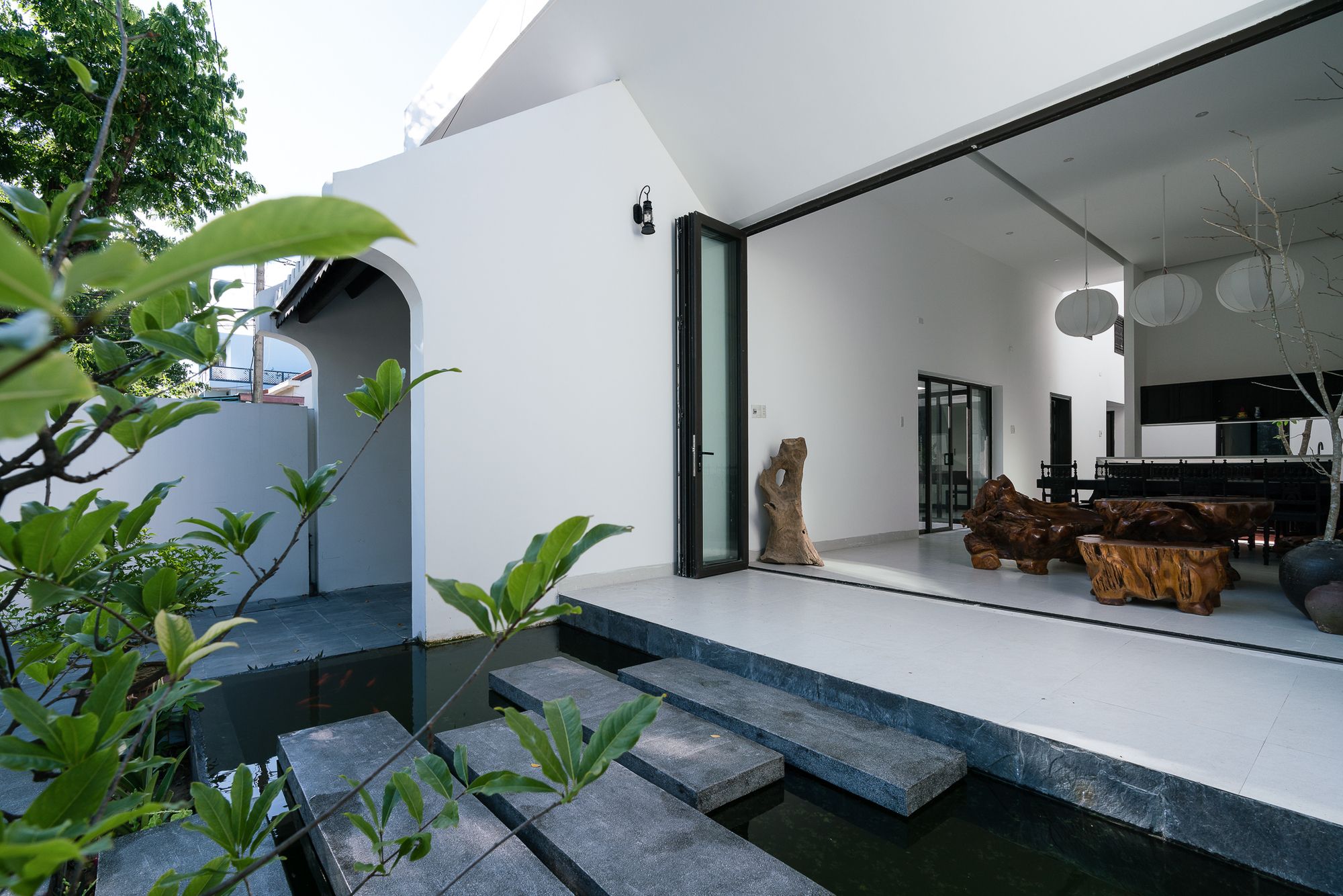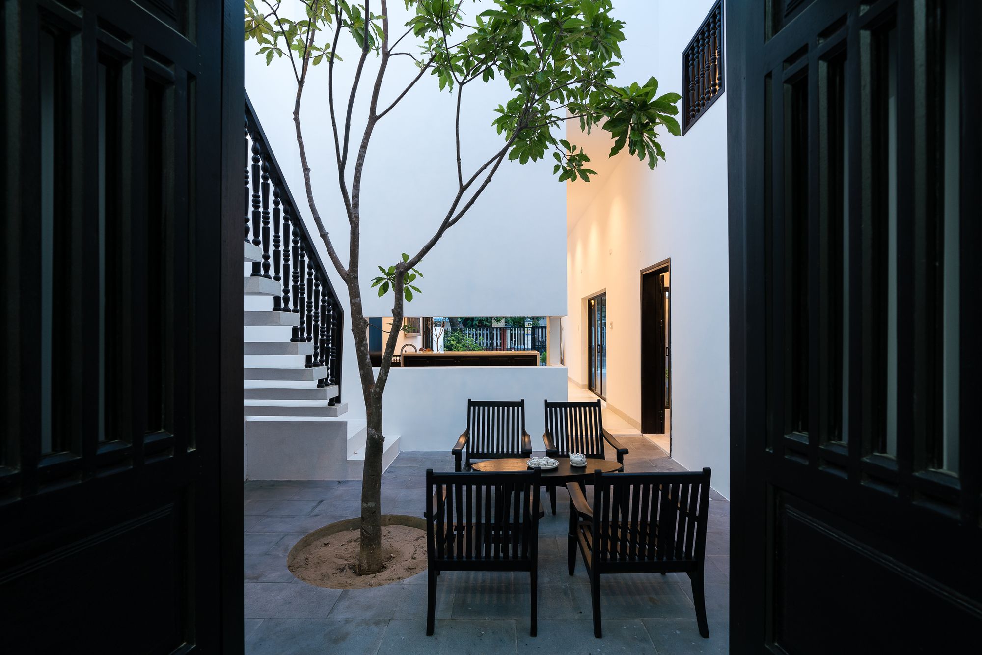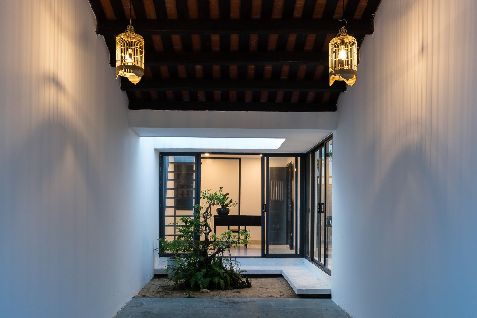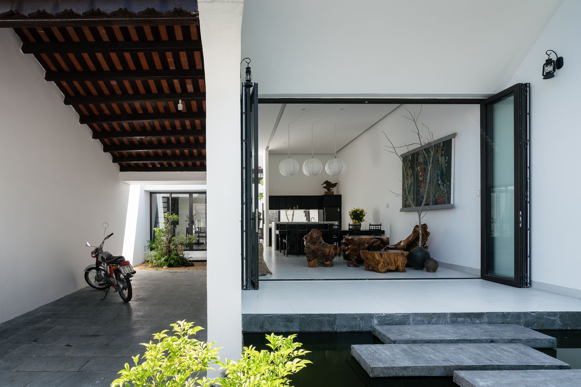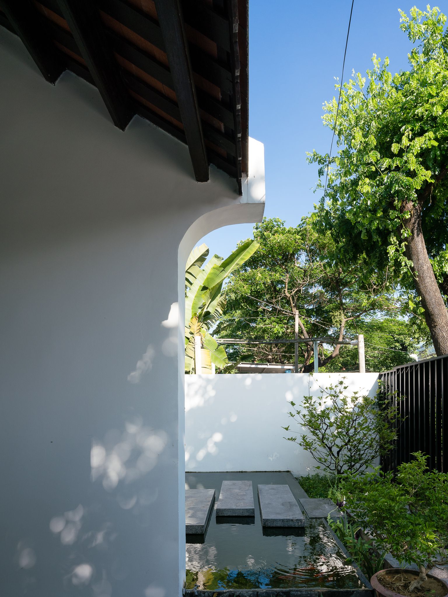 The principal Architect used the traditional elements of ancient Hoi An house consist of the back baluster factor and the “Thuong Song Ha Ban” door system to design a small house which reflects the traditional elements combined with the modern elements. Especially, the roof of the garage area is designed by double tile ( Am Duong tile in Vietnamese) which is the traditional tile of an ancient house in Vietnam. In addition to, the shape of the garage is reformed similar to the traditional house.