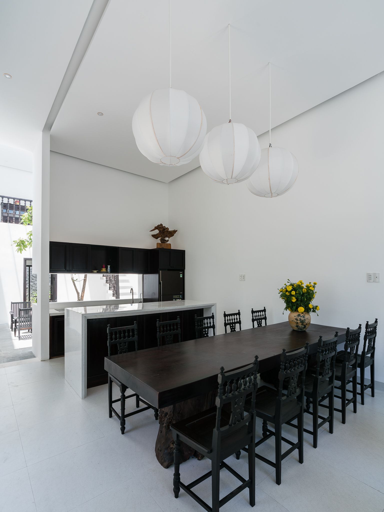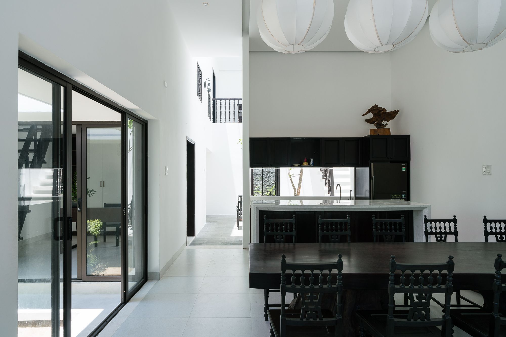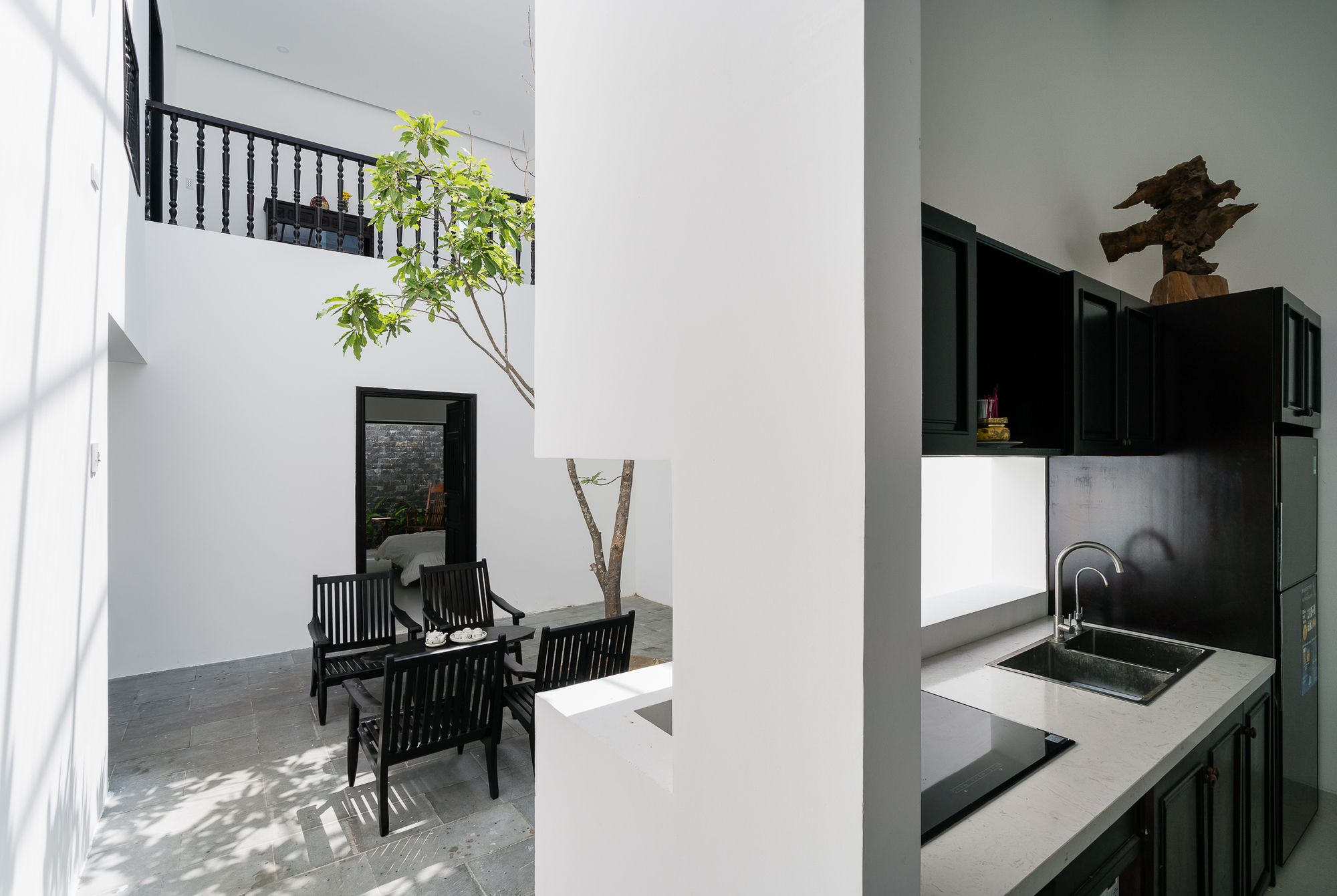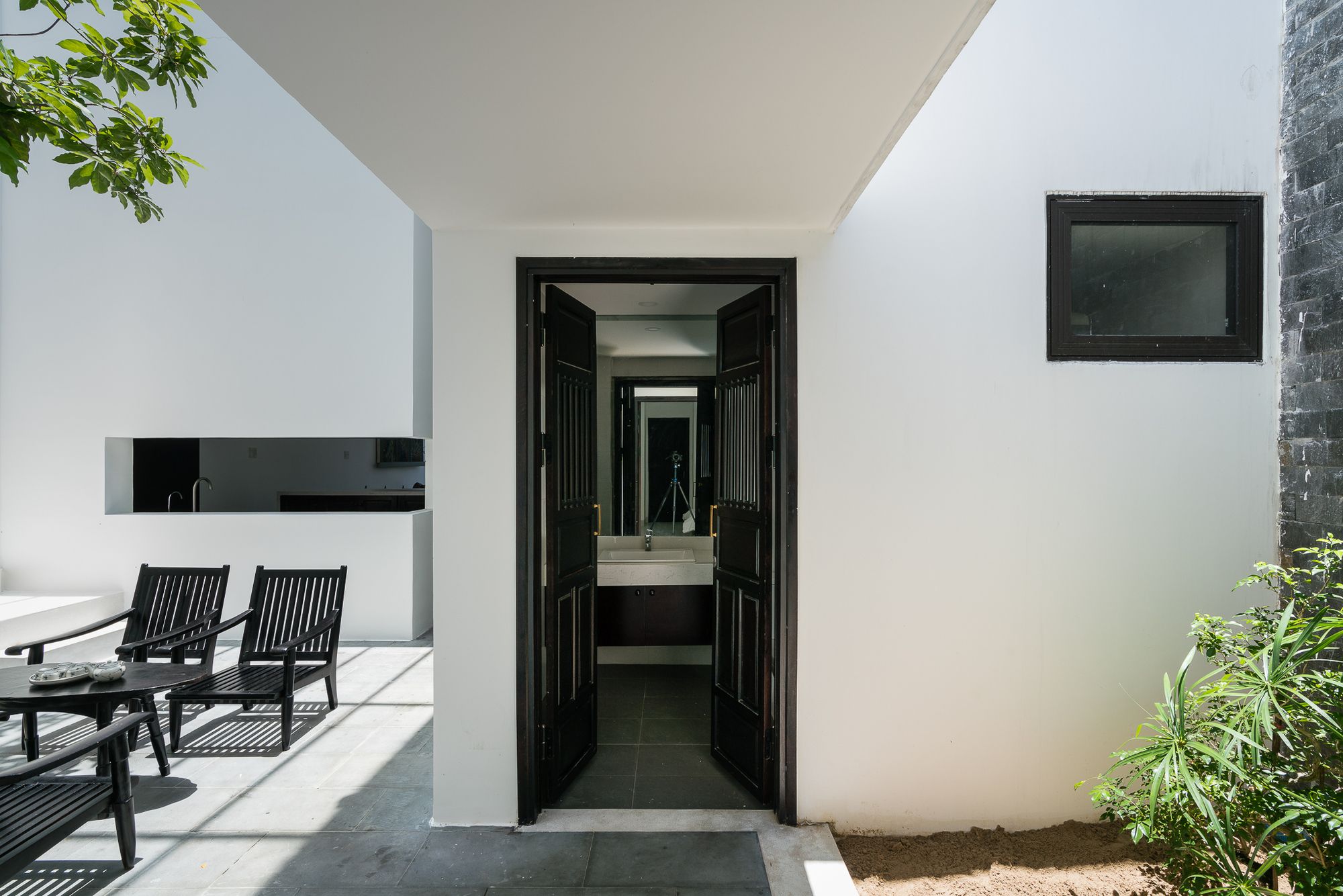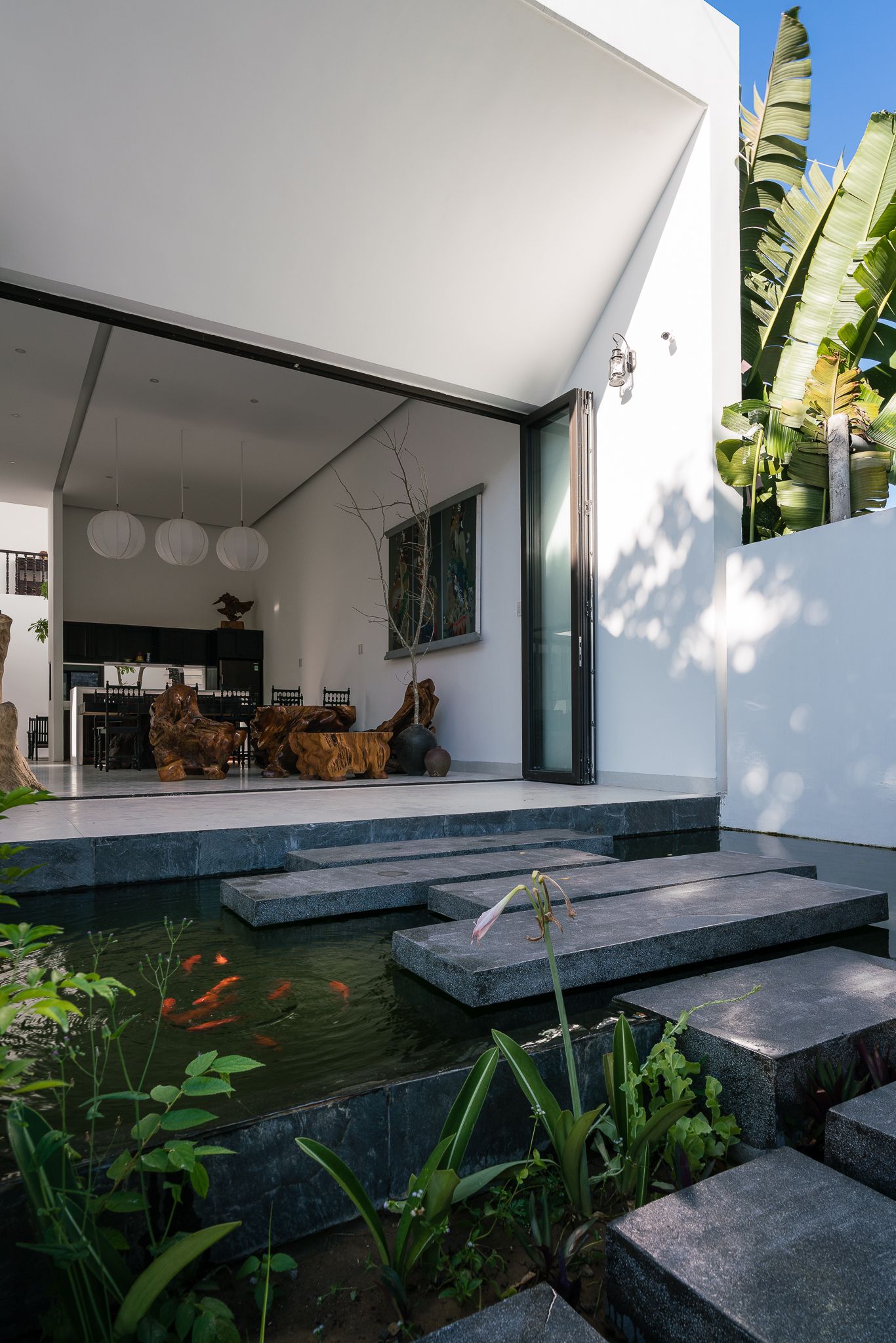 The principal Architect used the traditional elements of ancient Hoi An house consist of the back baluster factor and the “Thuong Song Ha Ban” door system to design a small house which reflects the traditional elements combined with the modern elements. Especially, the roof of the garage area is designed by double tile ( Am Duong tile in Vietnamese) which is the traditional tile of an ancient house in Vietnam. In addition to, the shape of the garage is reformed similar to the traditional house.