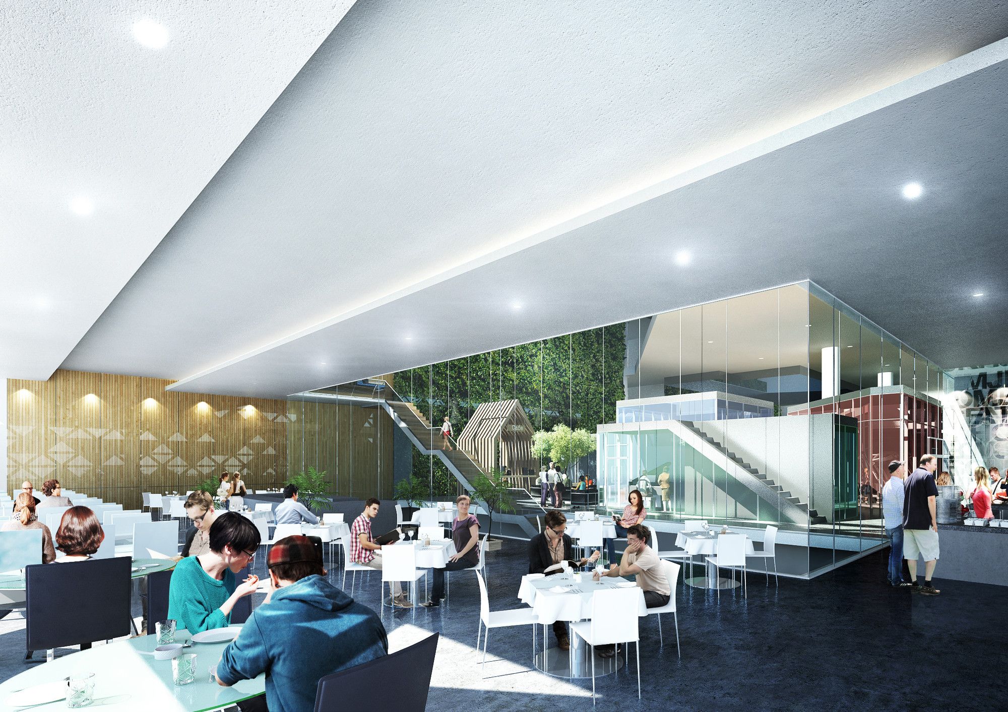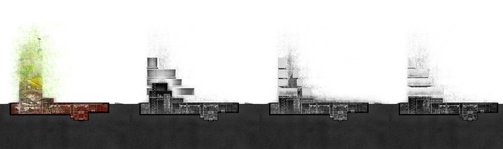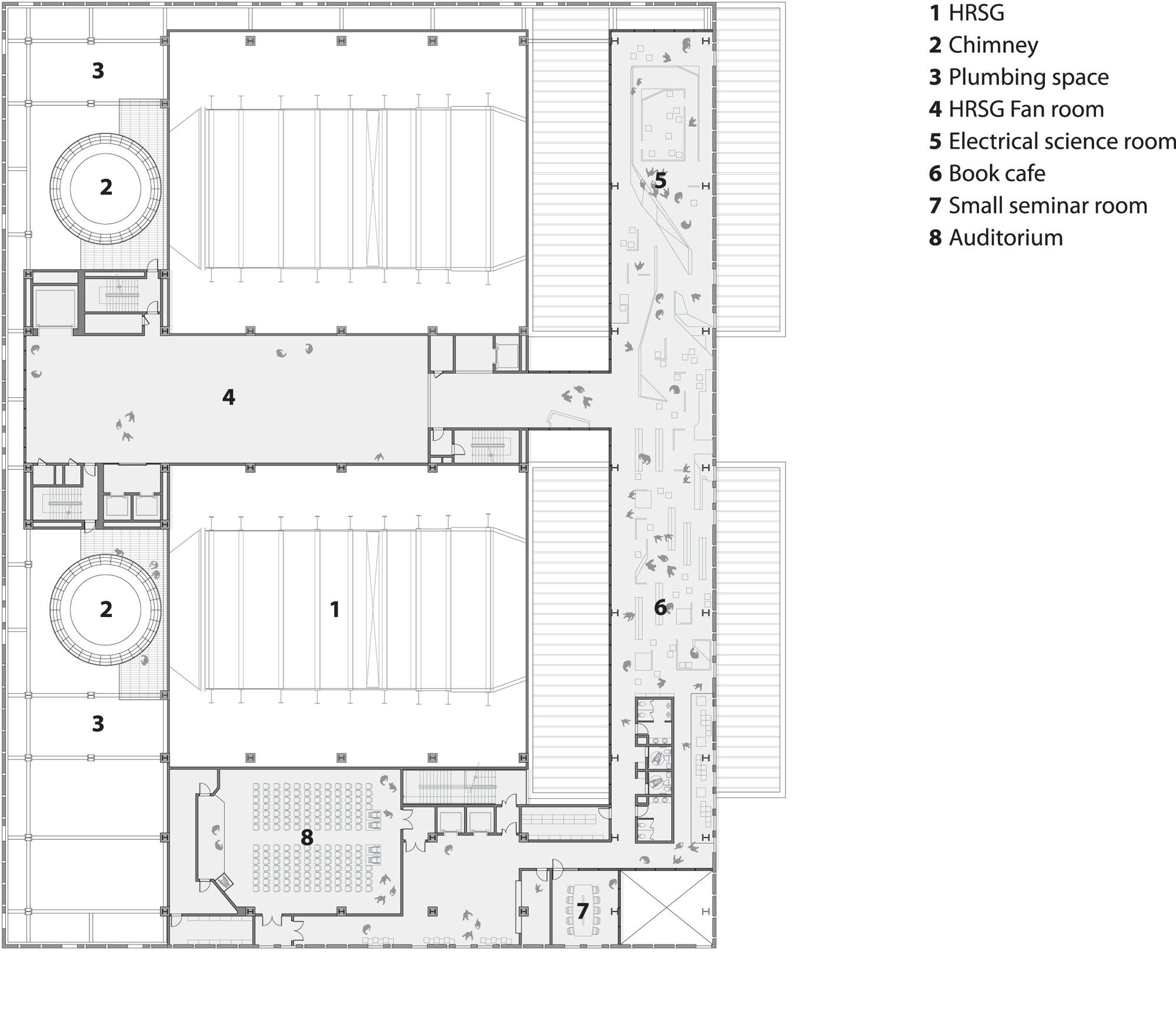 When placed in the center, the ventilation stack masked from view allowing for a less industrial look of the building. The massive concrete walls of the building, rising up to 18 meters, will have a stone cladding recalling those of the old plant. The walls are to be surrounded with art galleries and exhibits attracting the public to the building making it a “Culture Plant.” The new image proposed by the architects is more appealing to the public; it is meant to draw in workers as well as citizens and to create a dynamic atmosphere for people to learn, work, and enjoy the other programmatic functions.
