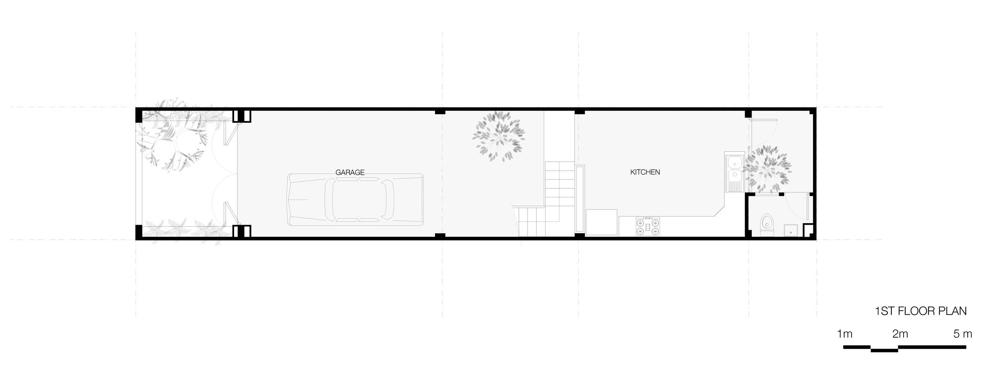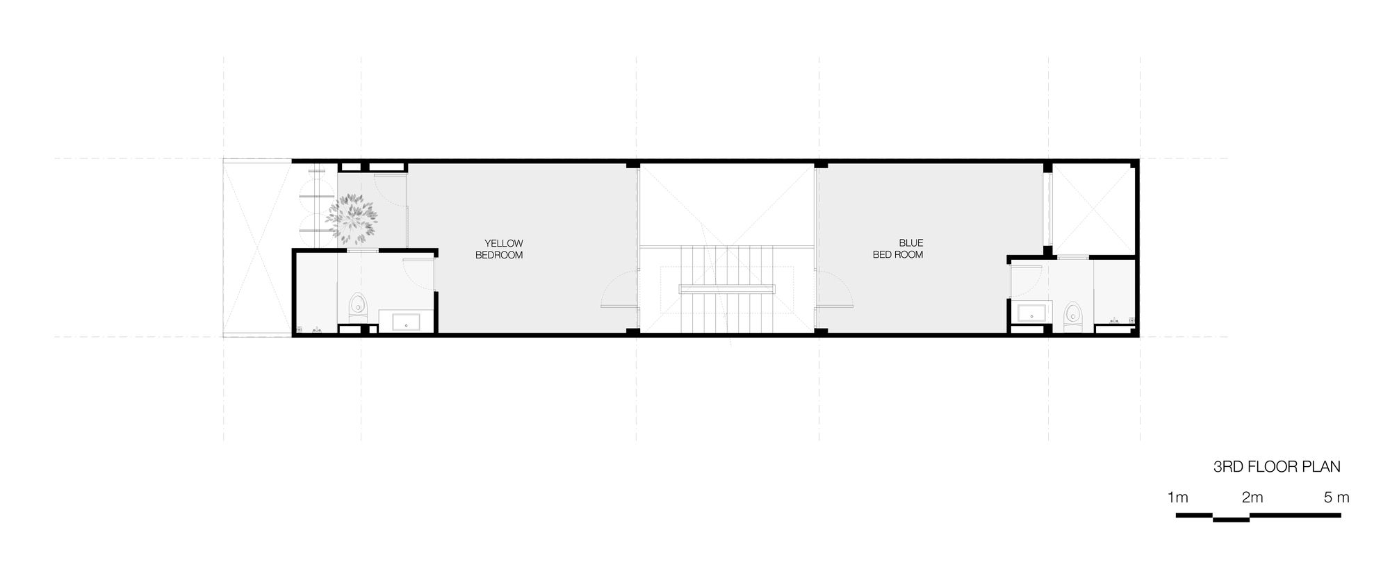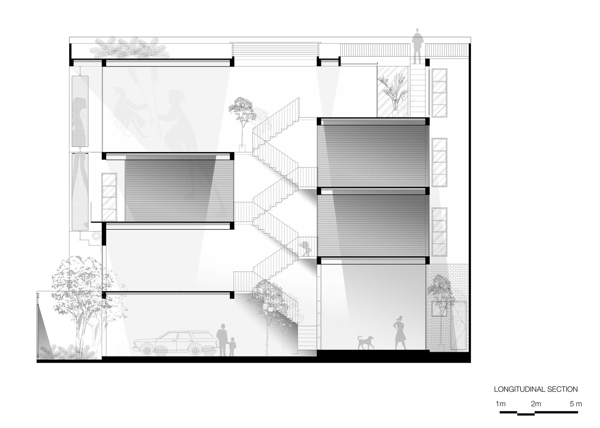 Learning from Vietnam’s diminishing traditional shop-house topology, we apply one of its most prominent characteristics – the use of multiple courtyards sandwiched in between living spaces, allowing for natural light, wind, as well as big plants to reach every corner of the building. This spatial organization ultimately brings nature into this small urban dwelling. The courtyard in the middle also acts as a connecting device, both visually and physically, where the majority of circulation happens on a sculptural stair made from single-sheet iron with the light structure that activates the whole space. Shifted floor plates and glass walls/ floor sections also help enhance the idea of continuous space and make the house feel bigger.