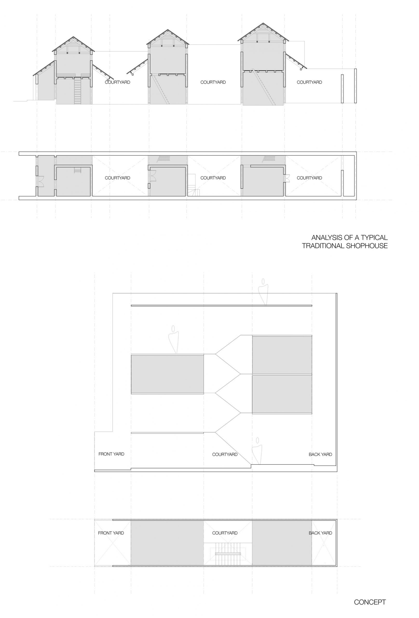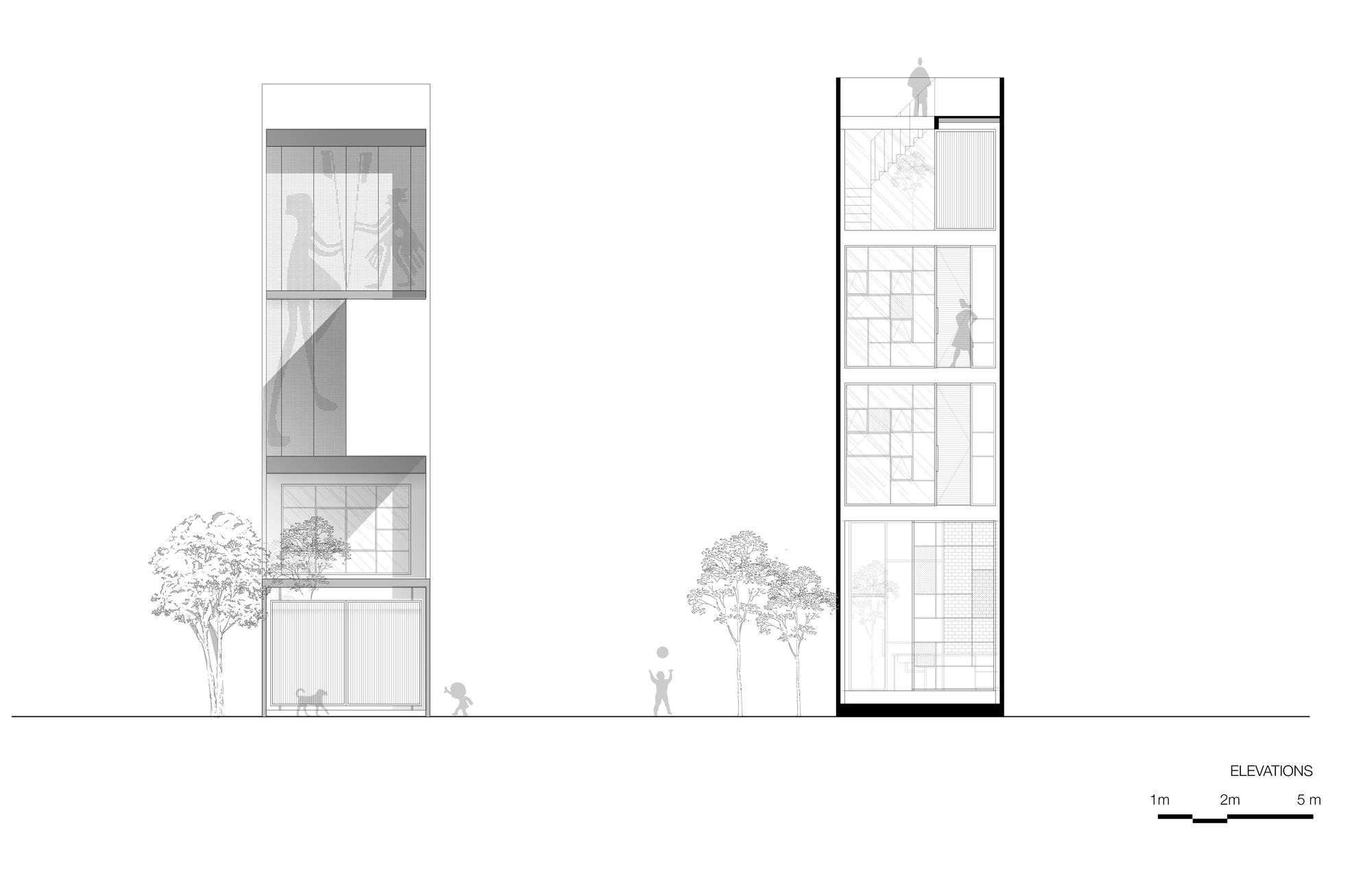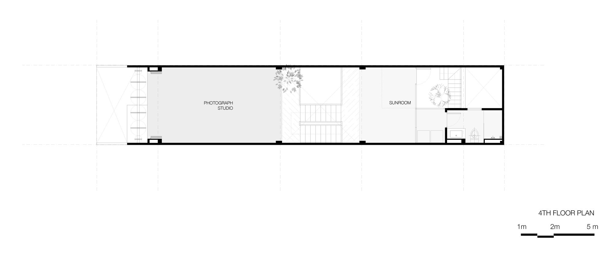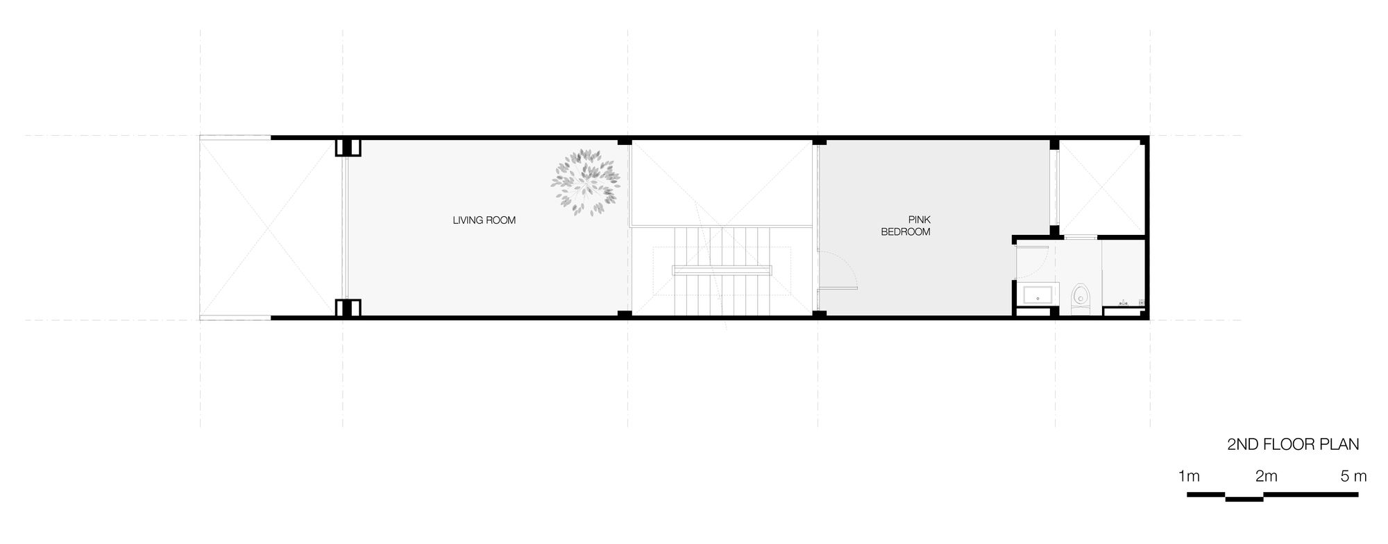 Learning from Vietnam’s diminishing traditional shop-house topology, we apply one of its most prominent characteristics – the use of multiple courtyards sandwiched in between living spaces, allowing for natural light, wind, as well as big plants to reach every corner of the building. This spatial organization ultimately brings nature into this small urban dwelling. The courtyard in the middle also acts as a connecting device, both visually and physically, where the majority of circulation happens on a sculptural stair made from single-sheet iron with the light structure that activates the whole space. Shifted floor plates and glass walls/ floor sections also help enhance the idea of continuous space and make the house feel bigger.