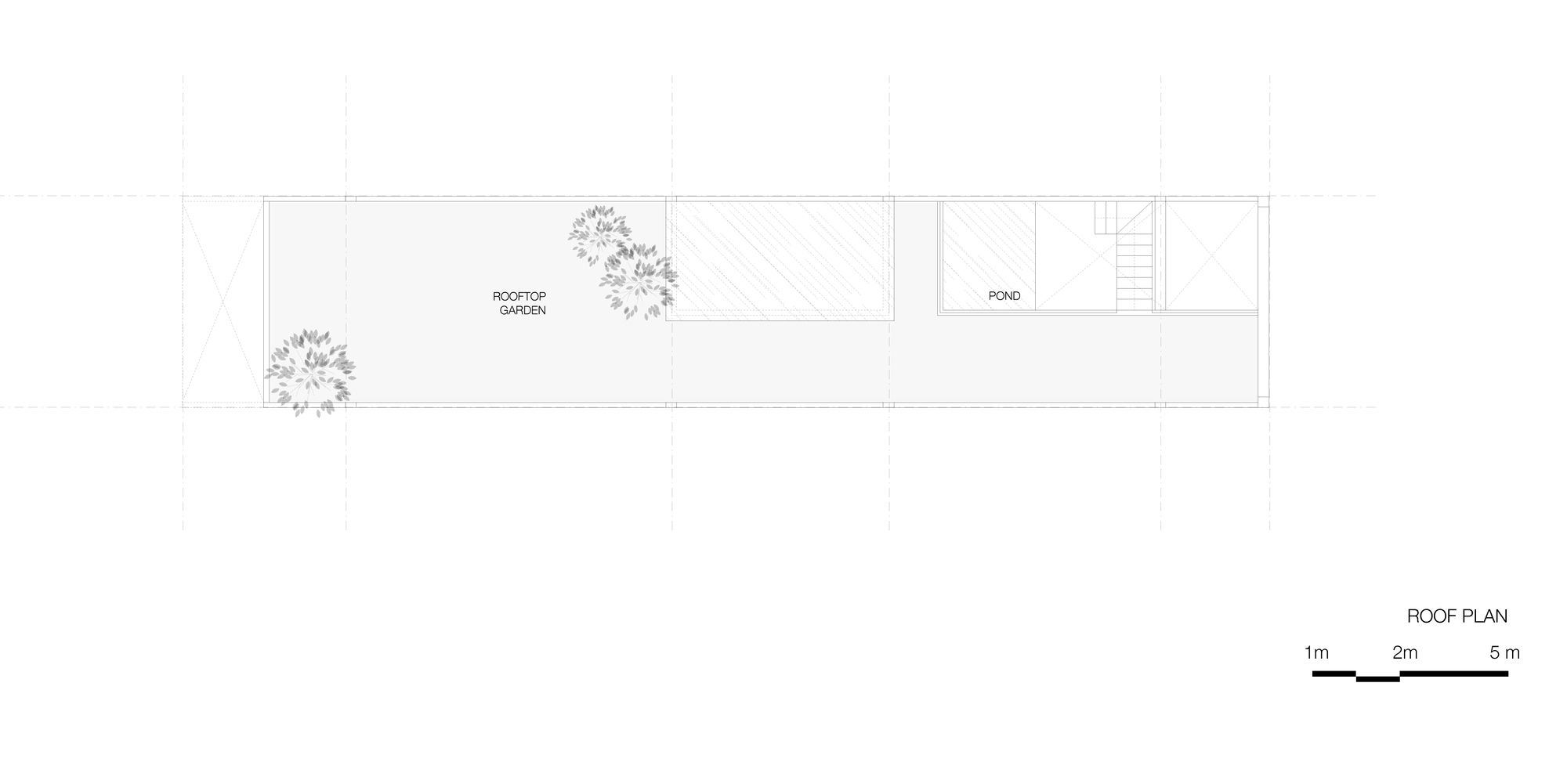 The louvers are both functional and ornamental when closed will create an image inspired by patterns found on Vietnam’s ancient Dong Son drums. At night, the house becomes a lantern shining brightly within the neighborhood. Fengshui principles are also applied creatively, with the screen acting as a shield and air/ light purifier; the colored beams to balance out the neutral colors of glass and iron, and the water pond to the back of the roof to cool down and neutralize the air flow.