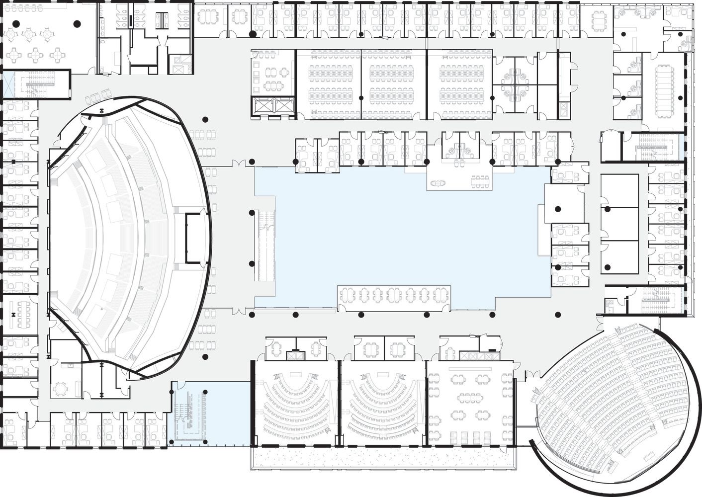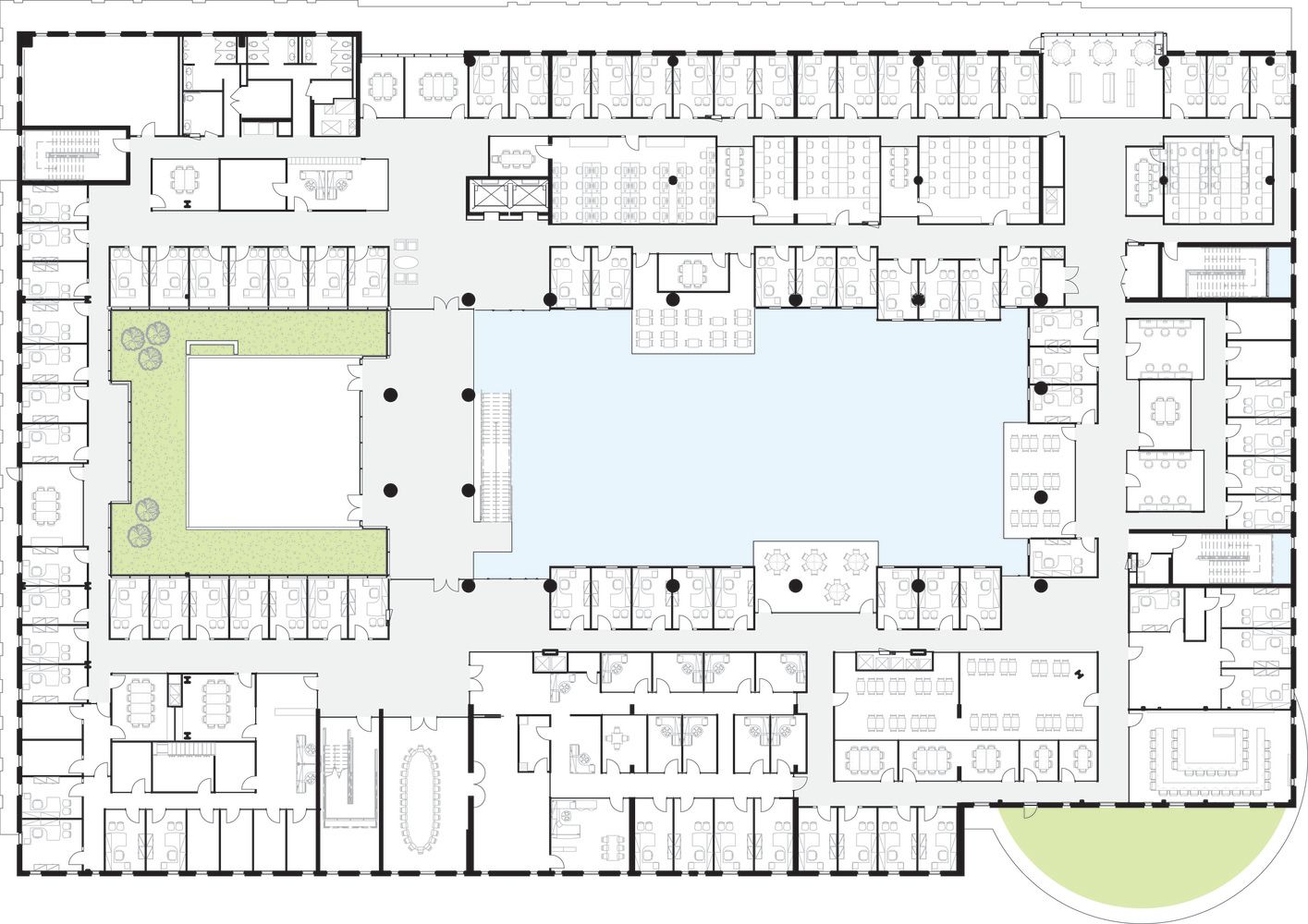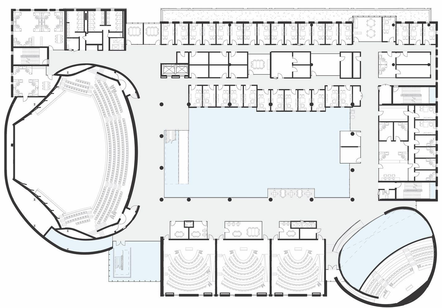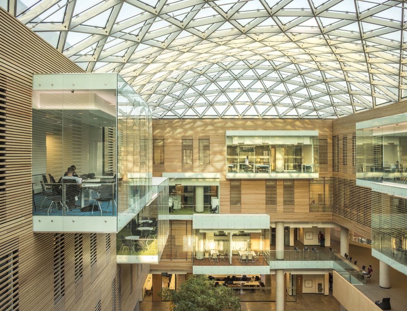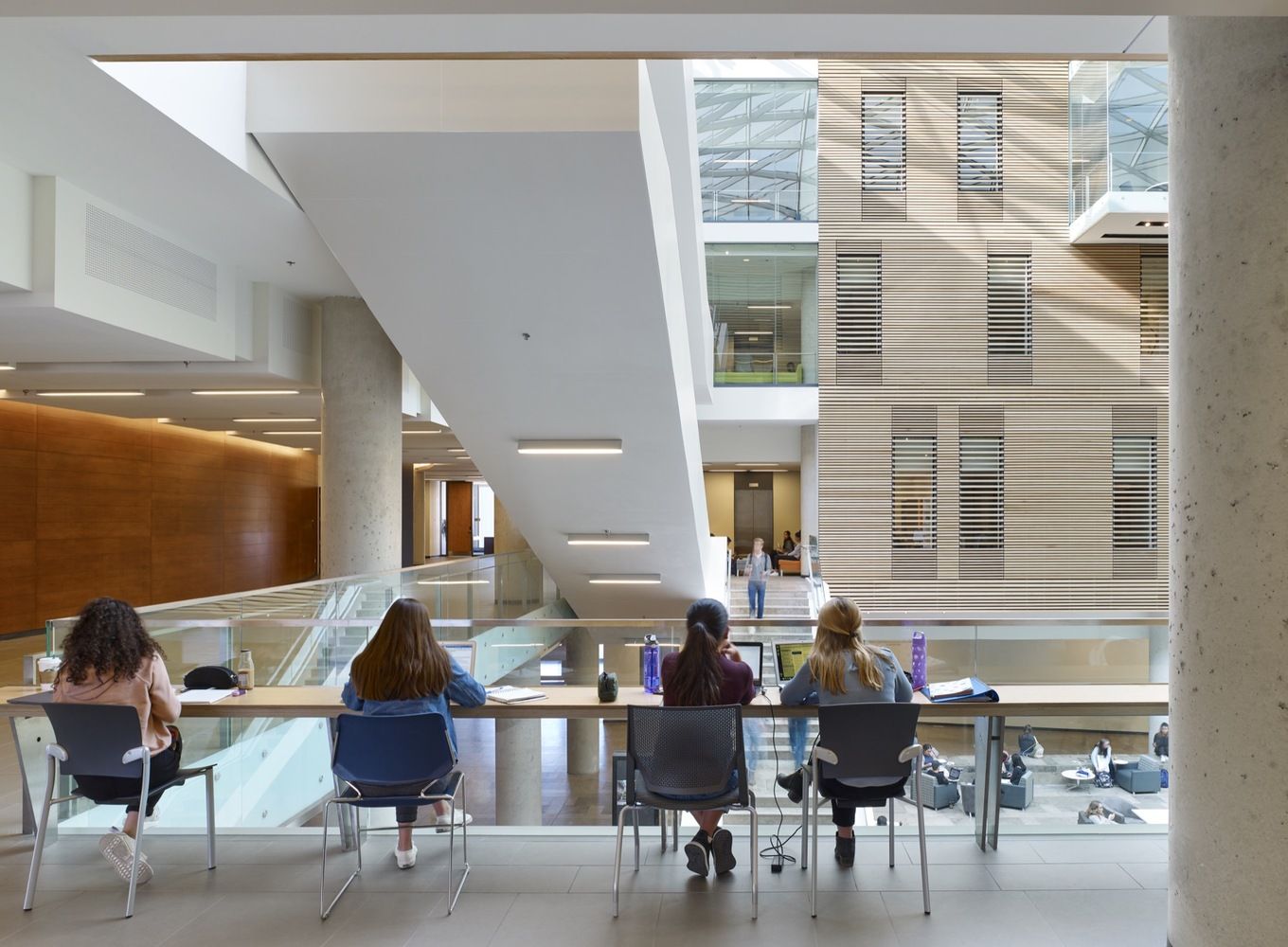 Informal study lounge space and breakout rooms interspersed around the atrium on all levels are designed to facilitate the sort of informal exchange that supports peer learning and collaboration. A range of educational settings includes active learning classrooms to support new pedagogies. A mix of academic offices (240) and classrooms throughout create adjacencies designed to break down silos and facilitate encounter. Expansive hallways with moveable furnishings and nooks further enhance the opportunity for interaction.