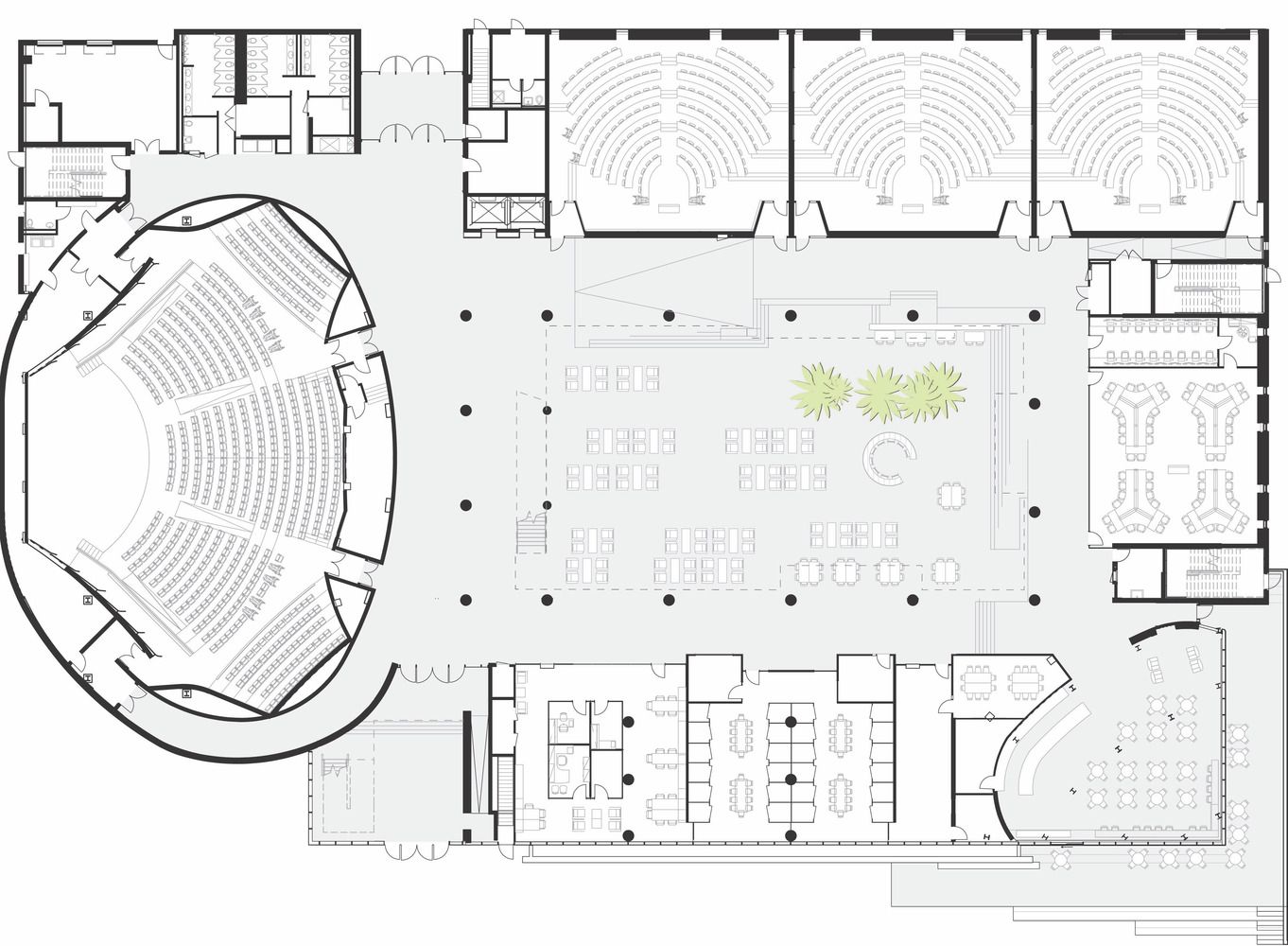 Woven into the site topography is a continuous ground plane linking the exterior and interior with ramps, stairs, and seating plinths. A continuation of building shape, materials, and palette further supports this inviting and seamless transition. At the center is a large wood-lined atrium, a crossroads around which a generosity and variety of spaces are immediately apparent. This public square is bathed in natural light beneath an undulating freeform skylight that reinforces themes of transparency and connectivity to create an engaging space in which to gather and learn.