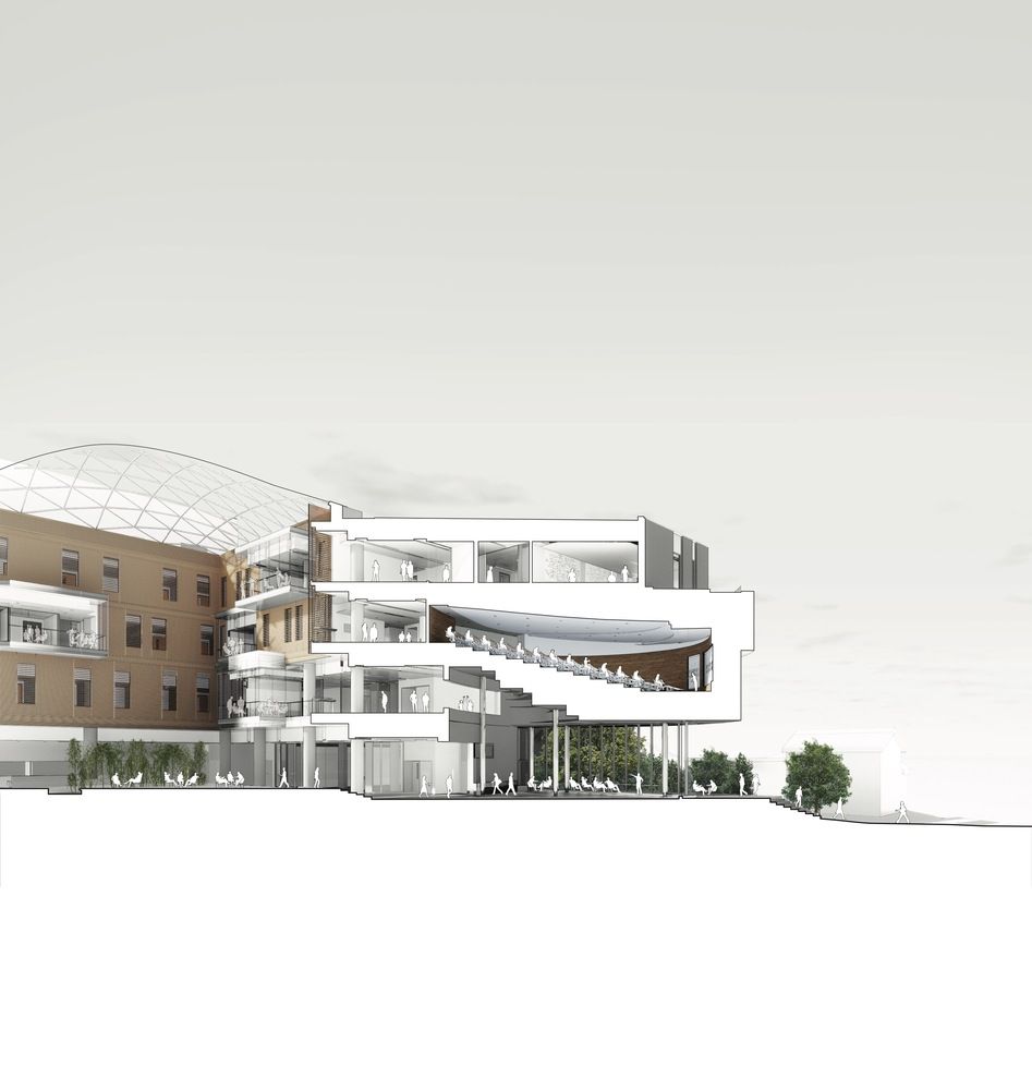 The building is designed as a landmark to create an identity and to signal an expansion of a new campus precinct. Curvilinear wood-lined volumes define large spaces at either end of the building and disrupt the rigor of the stratified orthogonal façade. These are given further emphasis by the significant cantilevered space above the 1000-seat elliptical auditorium and positioning the 300-seat lecture hall in a double-stacked drum that appears to ‘float’ above a glass-encased café.