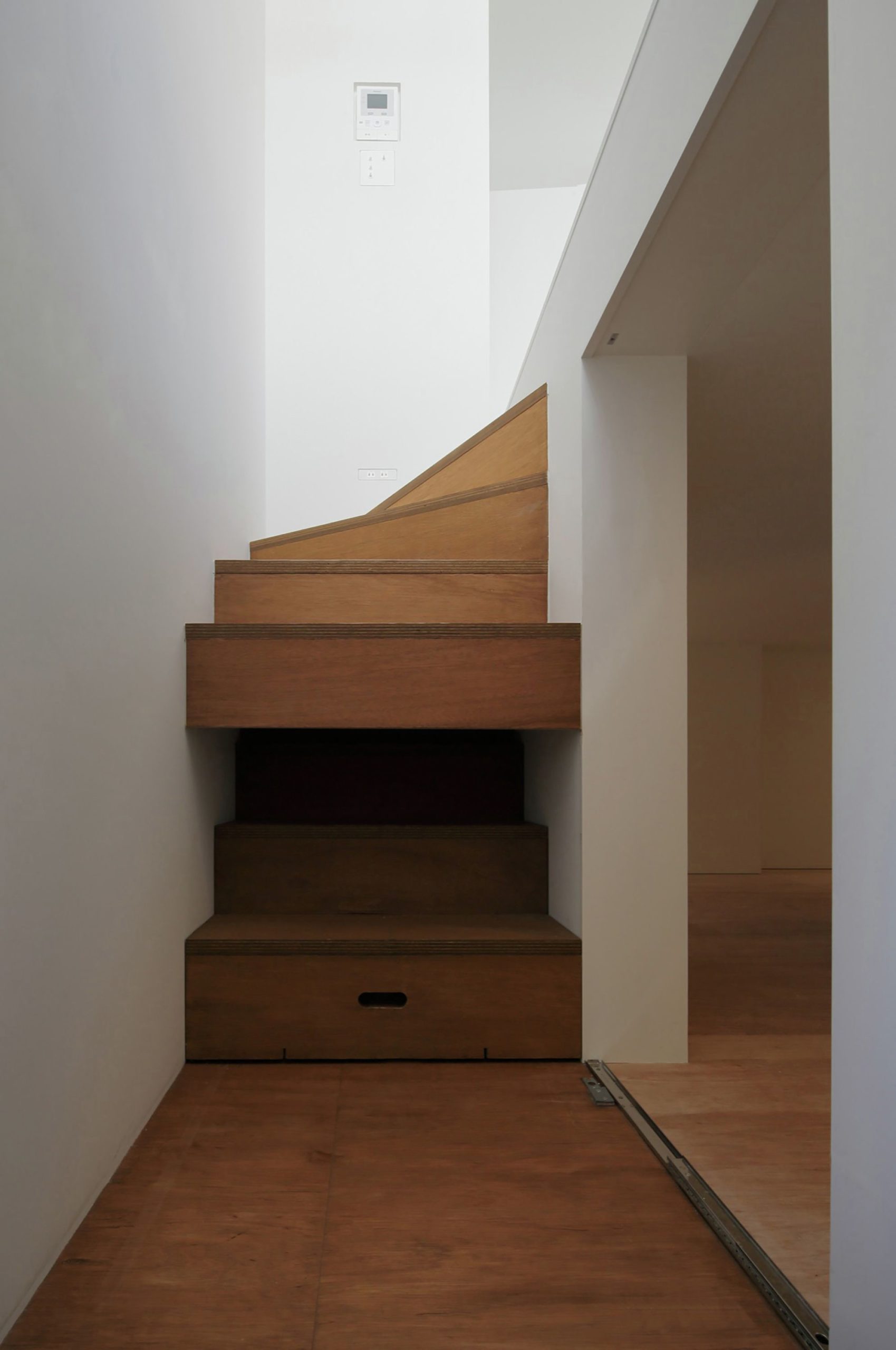 Since there’s no window on the other side of the building, the resident gets its light from this part on upper parts of building. And at the uppermost level, the bedrooms combined with a small study room and also takes advantage from large retractable windows. The architect also concealed a storage space between the first and the second floors.