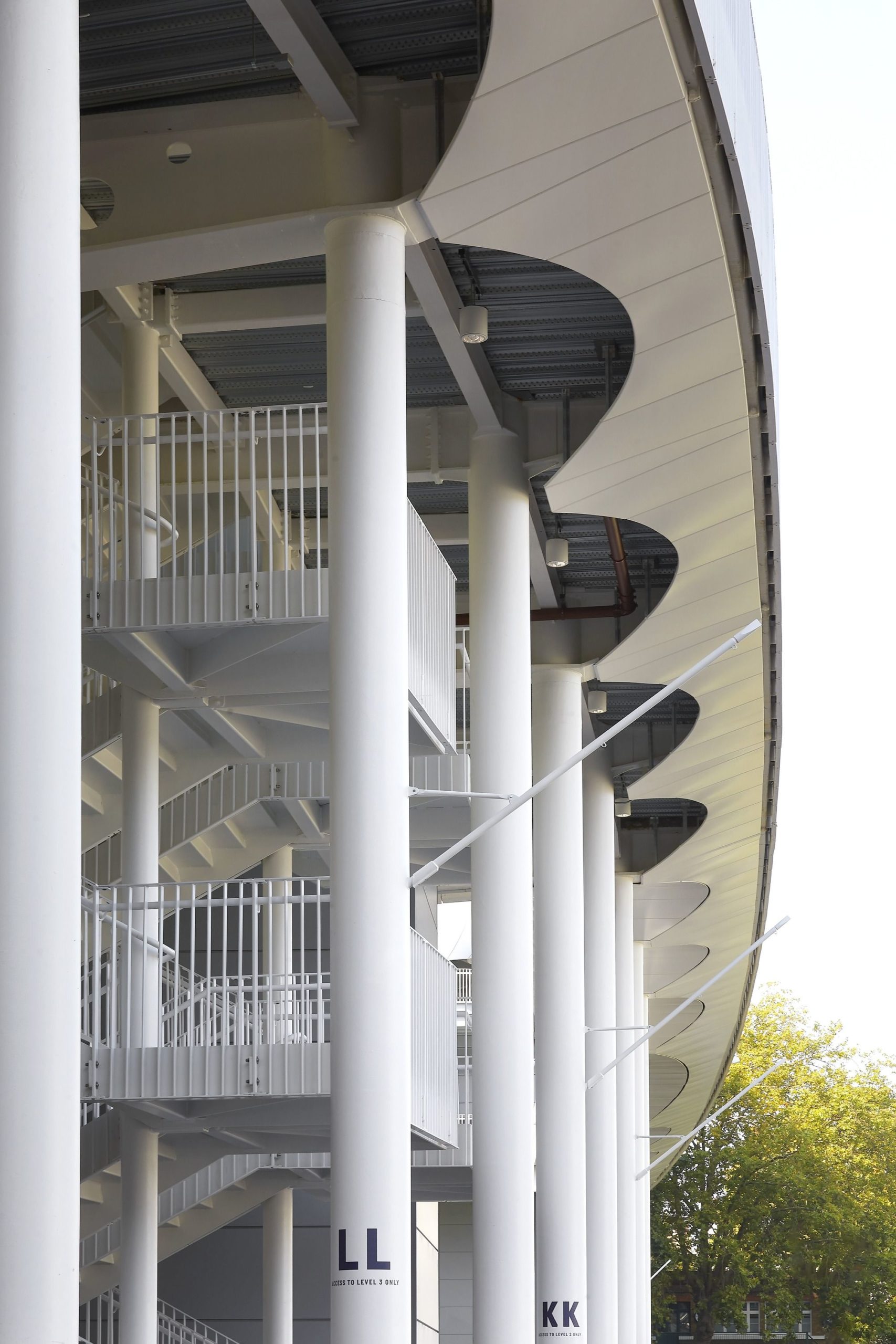 The steel framework of the new stands includes prominent columns and tall colonnades, drawing inspiration from the patterns seen in the original brick arches of the nearby Mound Stand arcade. The roof canopies harmonize with the graceful curves and structure of the design, resulting in a unique and recognizable outline.