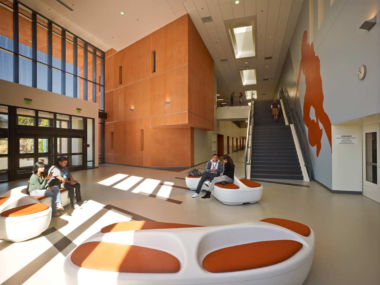 The 87,000 sf facility includes a three-court gymnasium with elevated jogging track; fitness/weight training and cardio/stretching rooms; three multipurpose rooms; five classrooms; offices for coaches, faculty, and administrators; student and faculty/staff locker rooms; an athletic training room with hydrotherapy area; and gracious, welcoming lobby spaces. Envisioned as a community asset by Los Angeles Mission College, the flexible multiuse activity spaces allow simultaneous use of the building by athletes, students, faculty members, and community users alike.