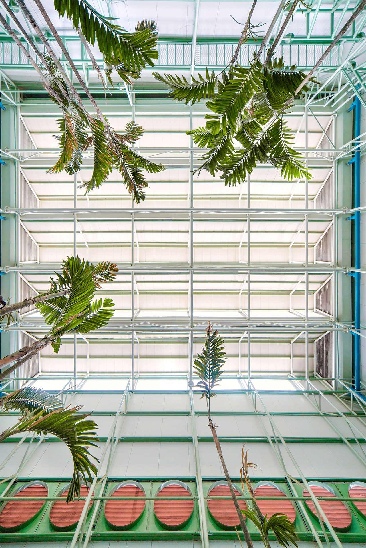 By contrast, the interior is layered with textures and colors, serving as a kind of oasis. Functioning as a kind of greenhouse, the central space is illuminated by sawtooth skylights, complimented by passive cooling. Rainwater from the roof is collected in giant blue tanks and used to maintain the tropical planting.